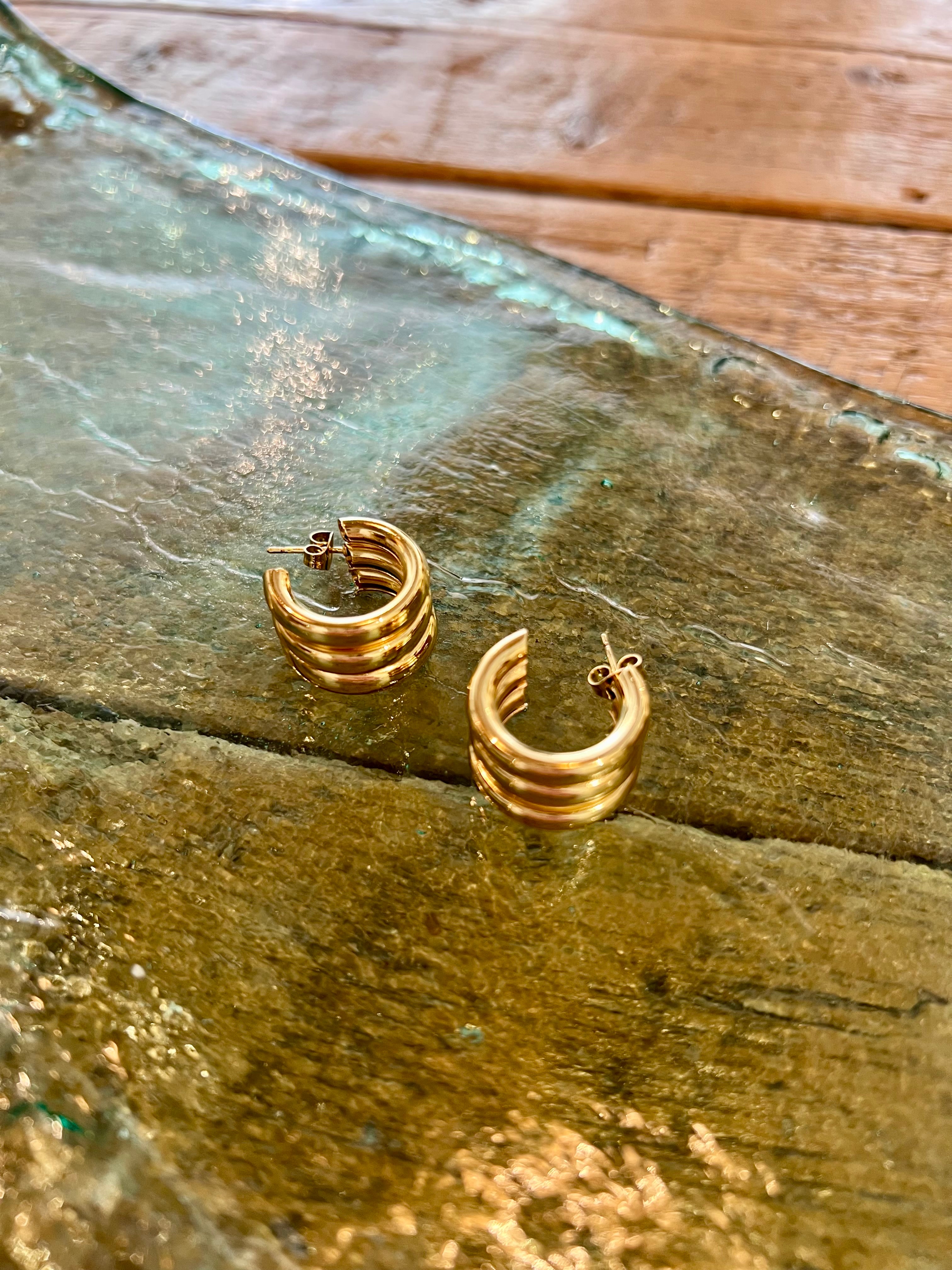 A modern twist on a classic hoop. These 18K gold-plated stainless steel studs feature a triple-ring design that layers three sleek hoops into one effortless earring. The look is bold yet minimal, giving you the polish of a hoop with the ease of a stud.