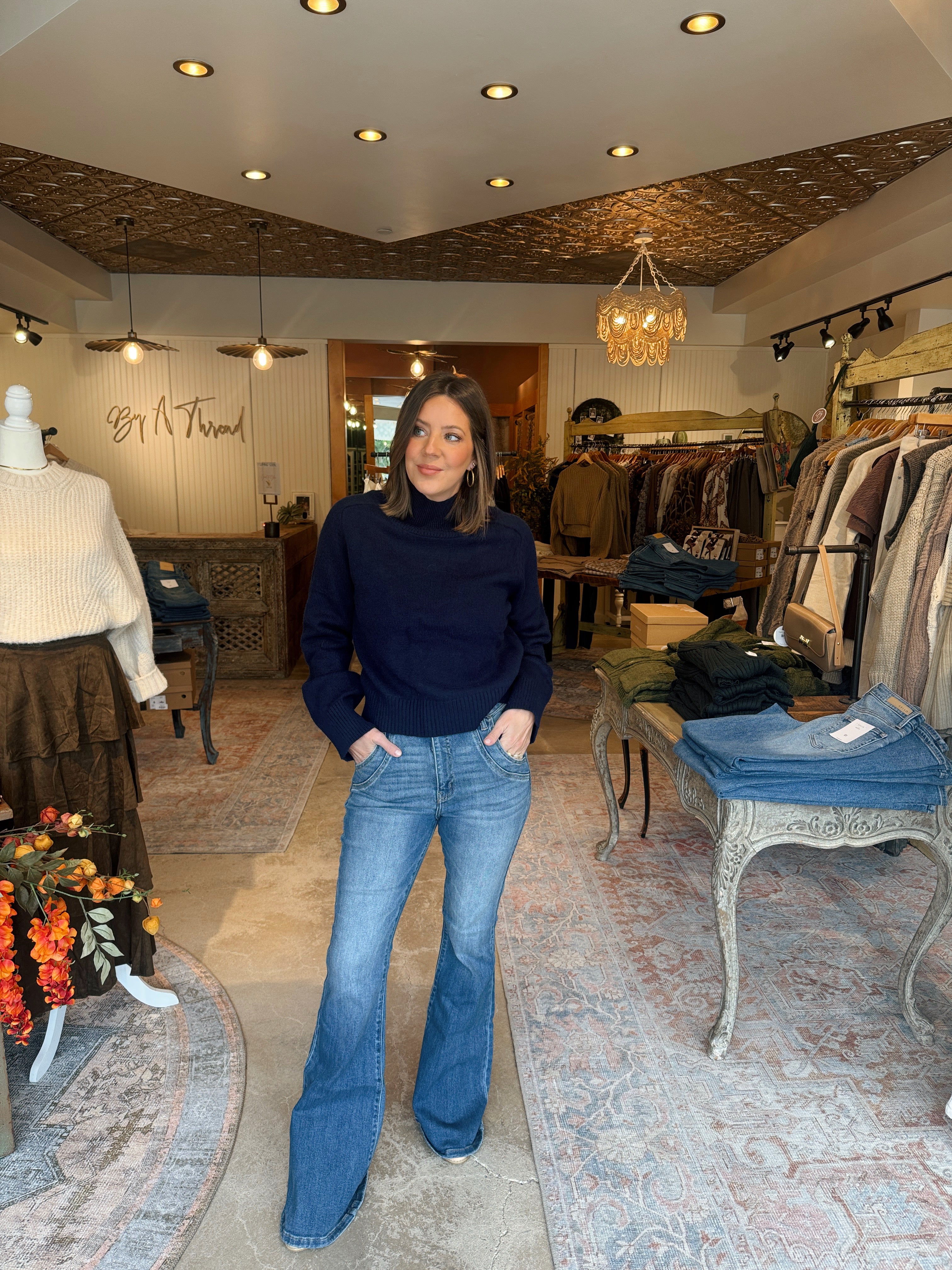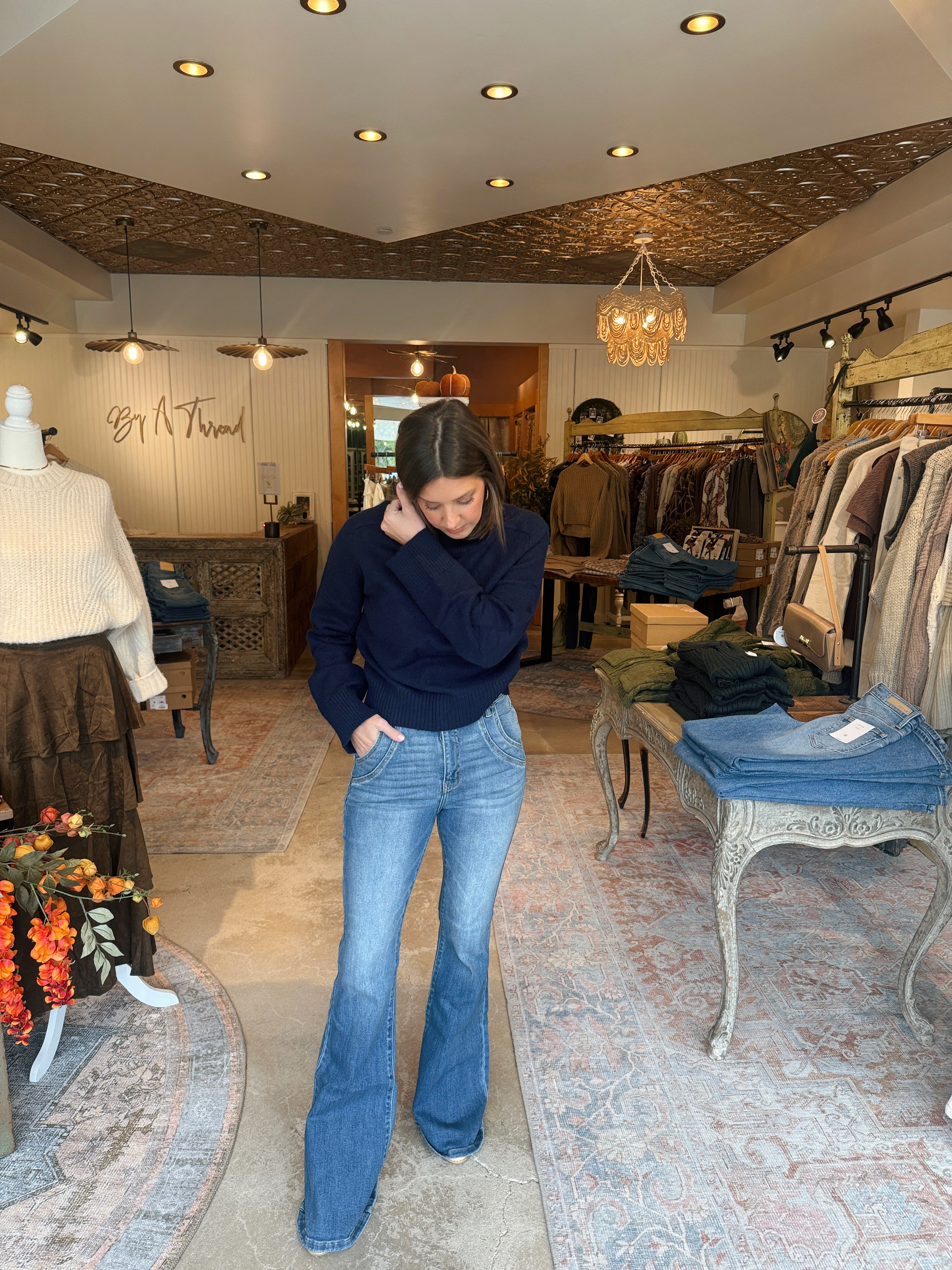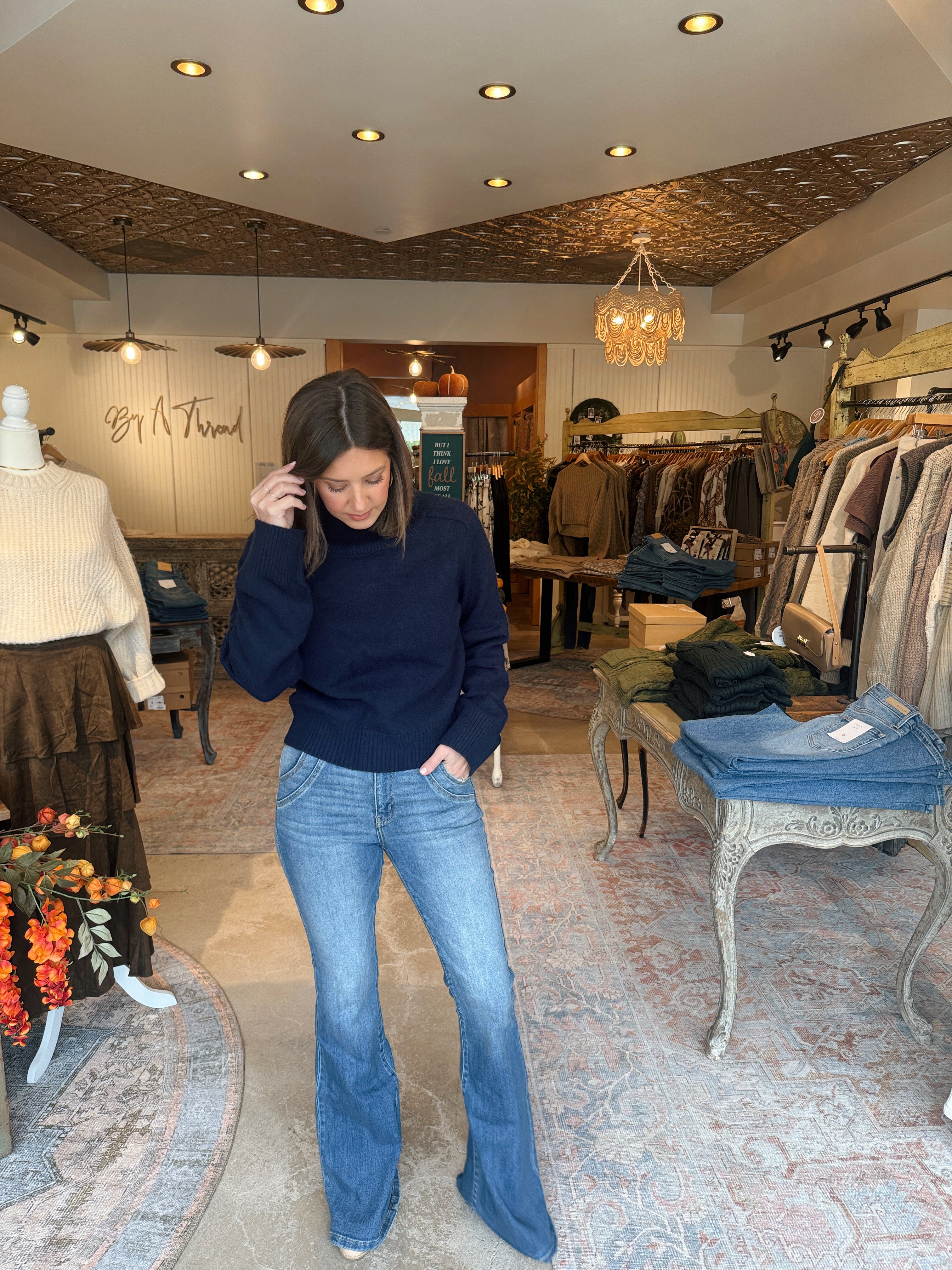 Step out in statement-making style with our high rise super flare jeans. Designed to elongate your legs and cinch your waist, these flares feature a classic high rise fit and dramatically flared leg that channels iconic '70s glamour. The medium wash denim offers timeless versatility, perfect for dressing up with heels or keeping it casual with boots. Practical features include belt loops and a secure zip fly closure.