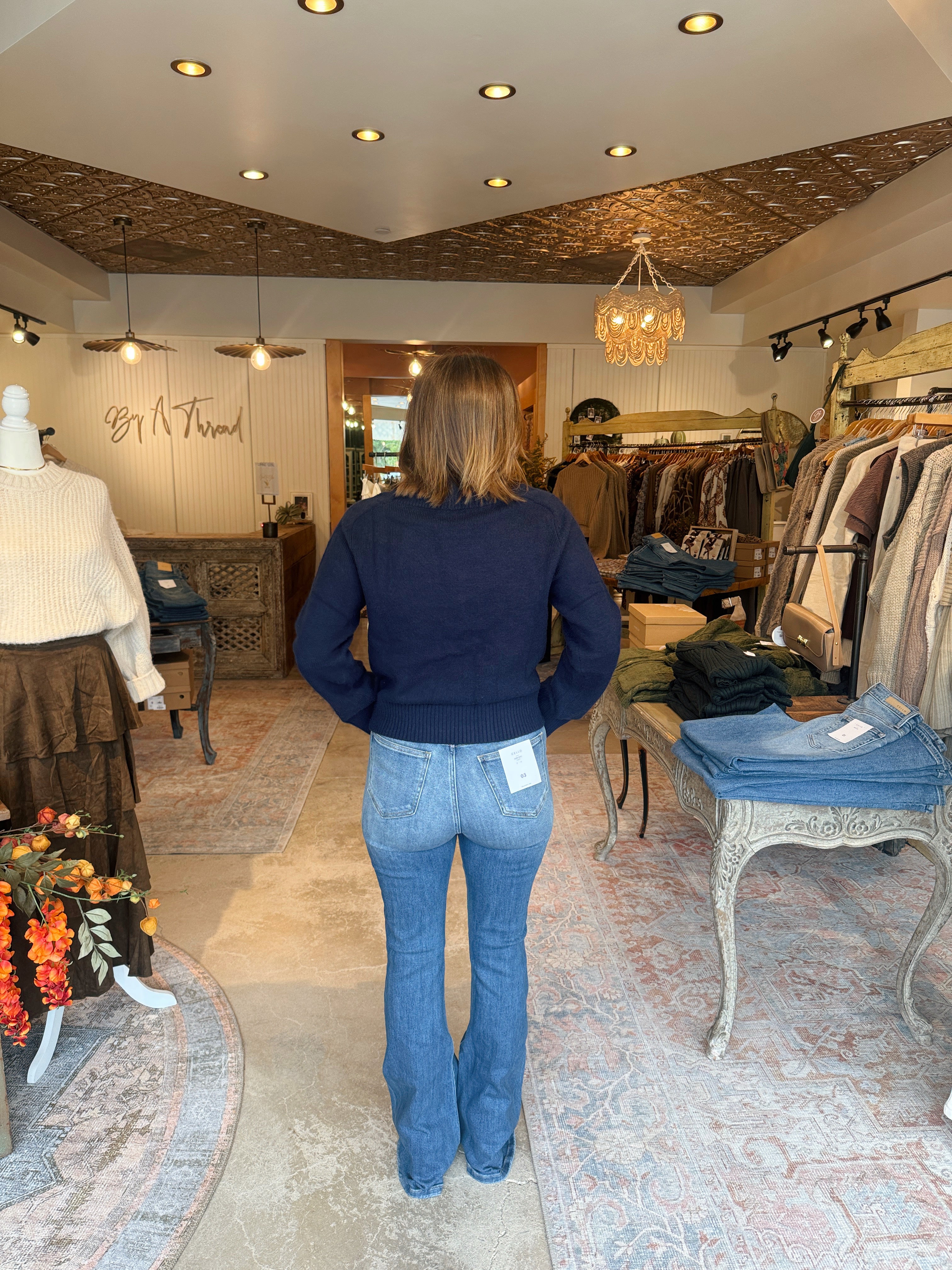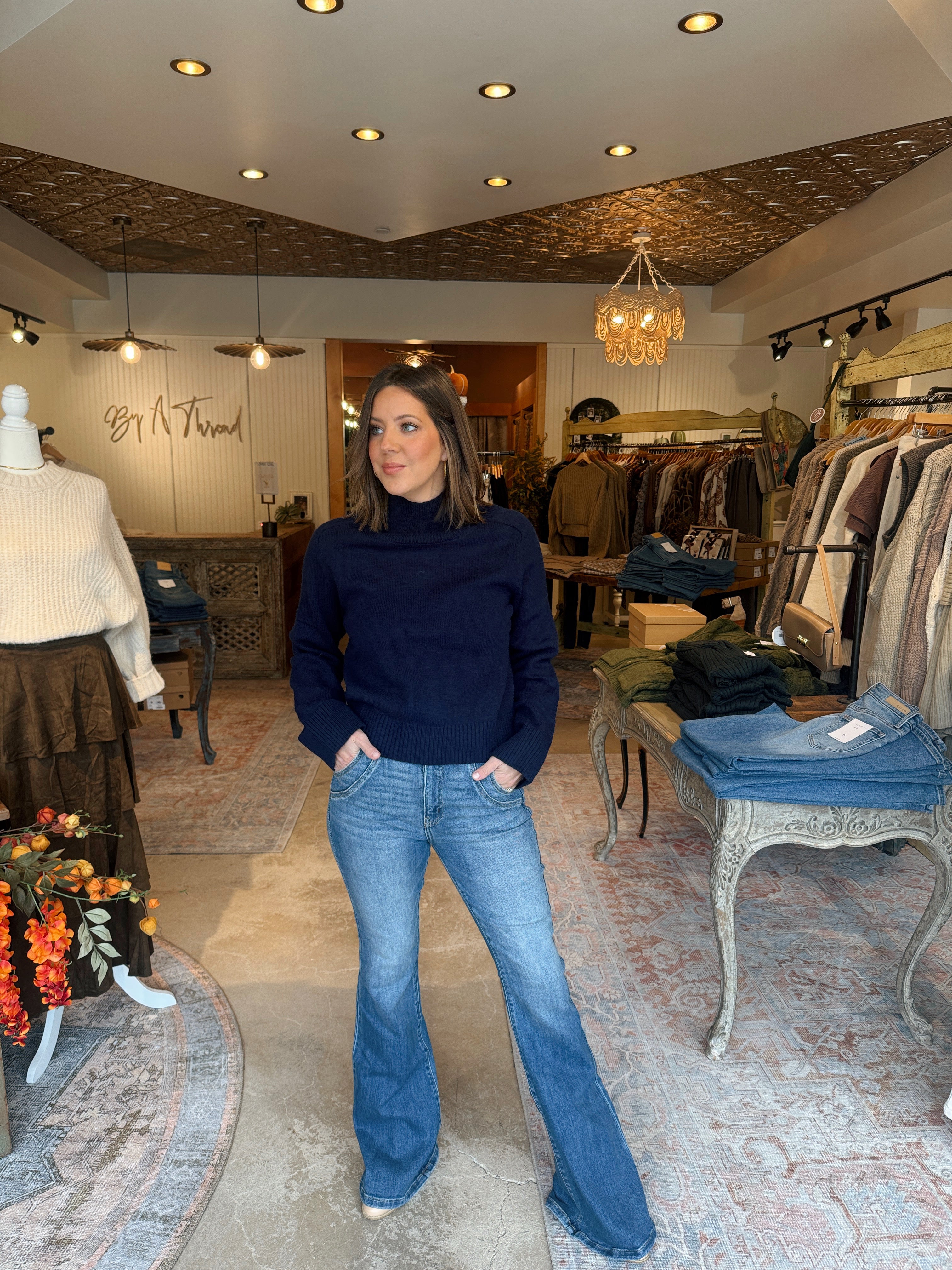 Shoes: Pointy-toe heeled boots or pumps. The goal is for the hem of the flare (33" inseam) to just skim the top of the shoe, which visually elongates the leg. A heel is essential to prevent the super flare from looking bulky or dragging.