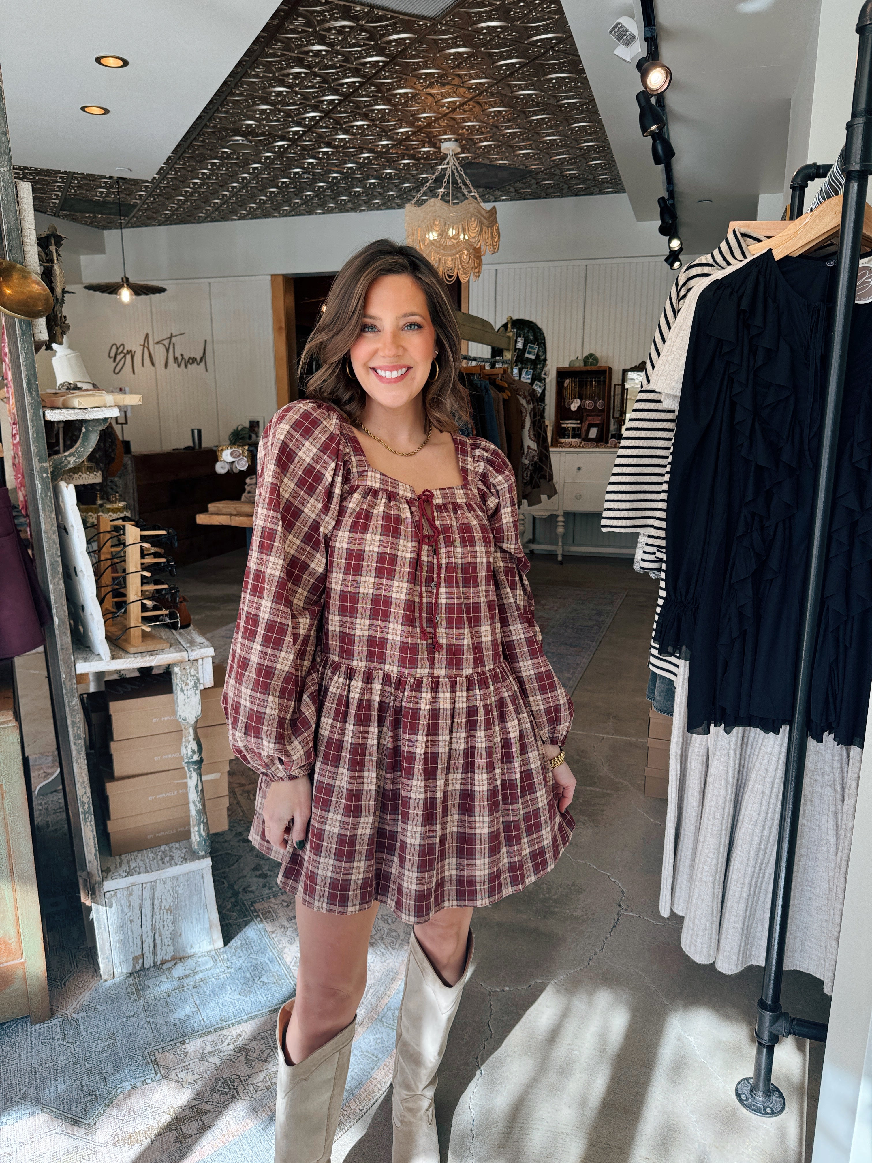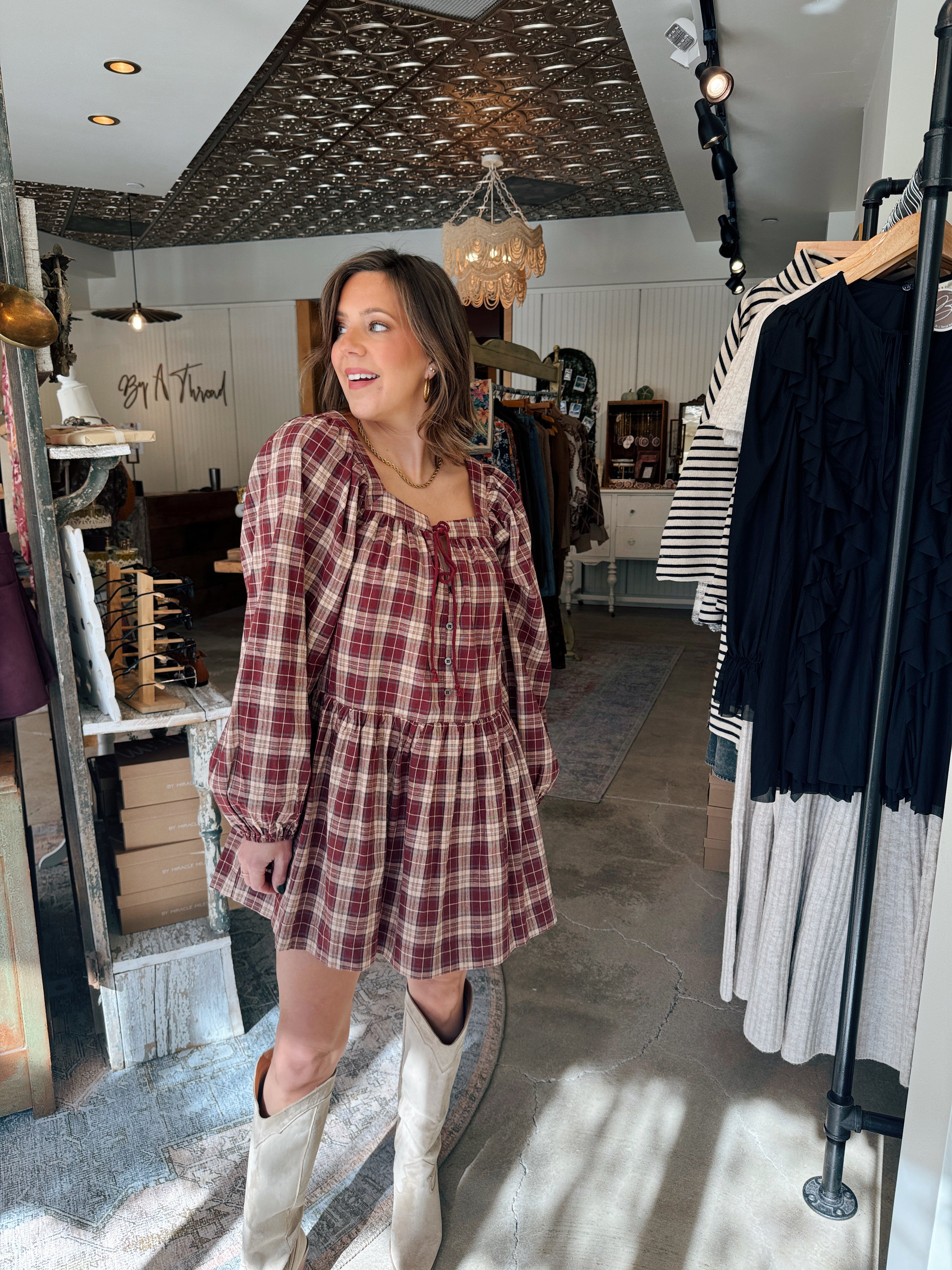 Capture a charming, academic aesthetic with this long sleeve plaid mini dress. The classic pattern features a lovely color palette of burgundy, cream, and light blue, making it perfectly suited for the season. Design details include a delicate neck tie that can be bowed or left undone, and a functional line of front buttons for ease and style. With practical side pockets and a comfortable fully lined interior, this dress combines convenience with a relaxed drop waist silhouette for a chic and effortless fit.