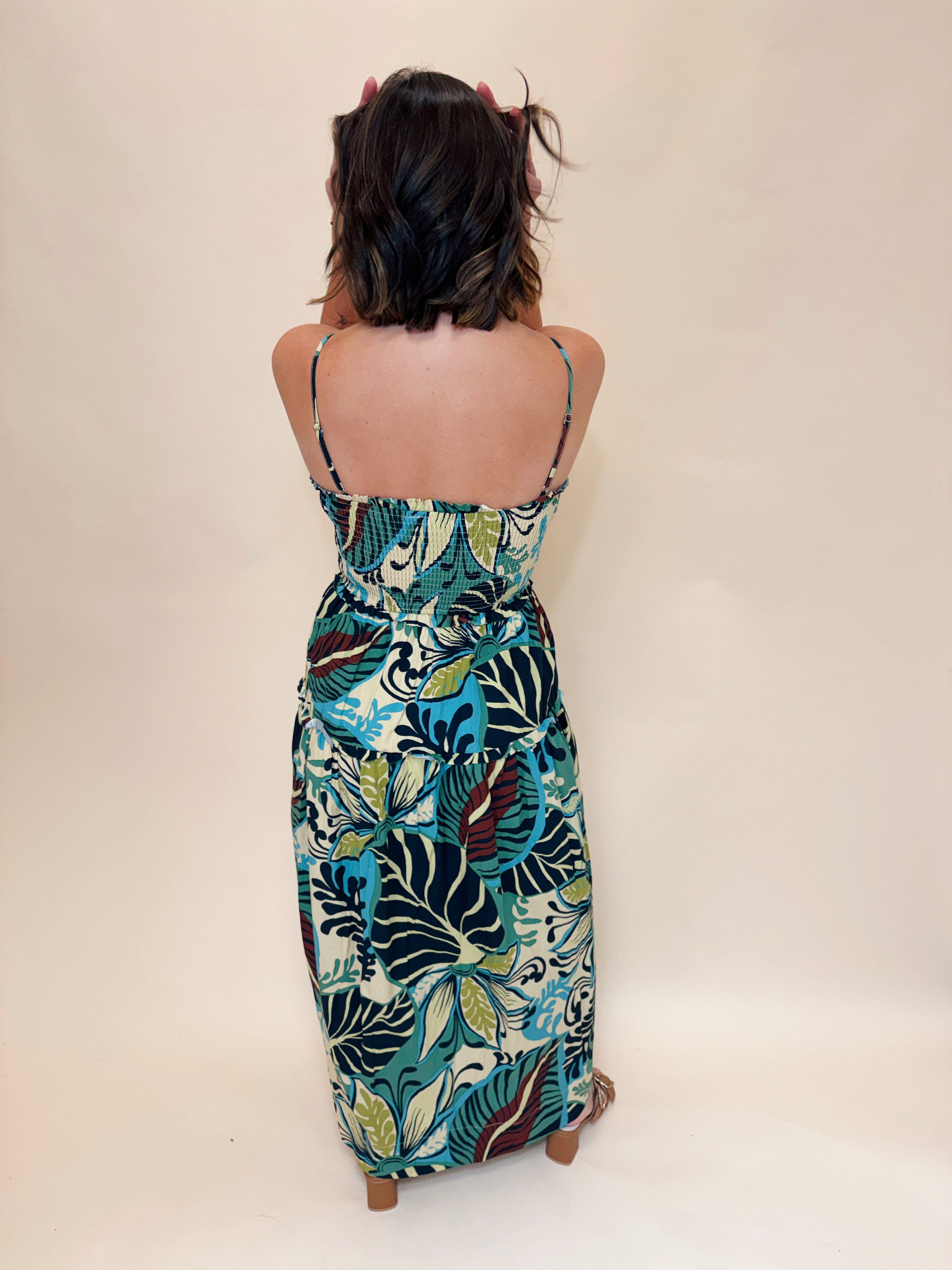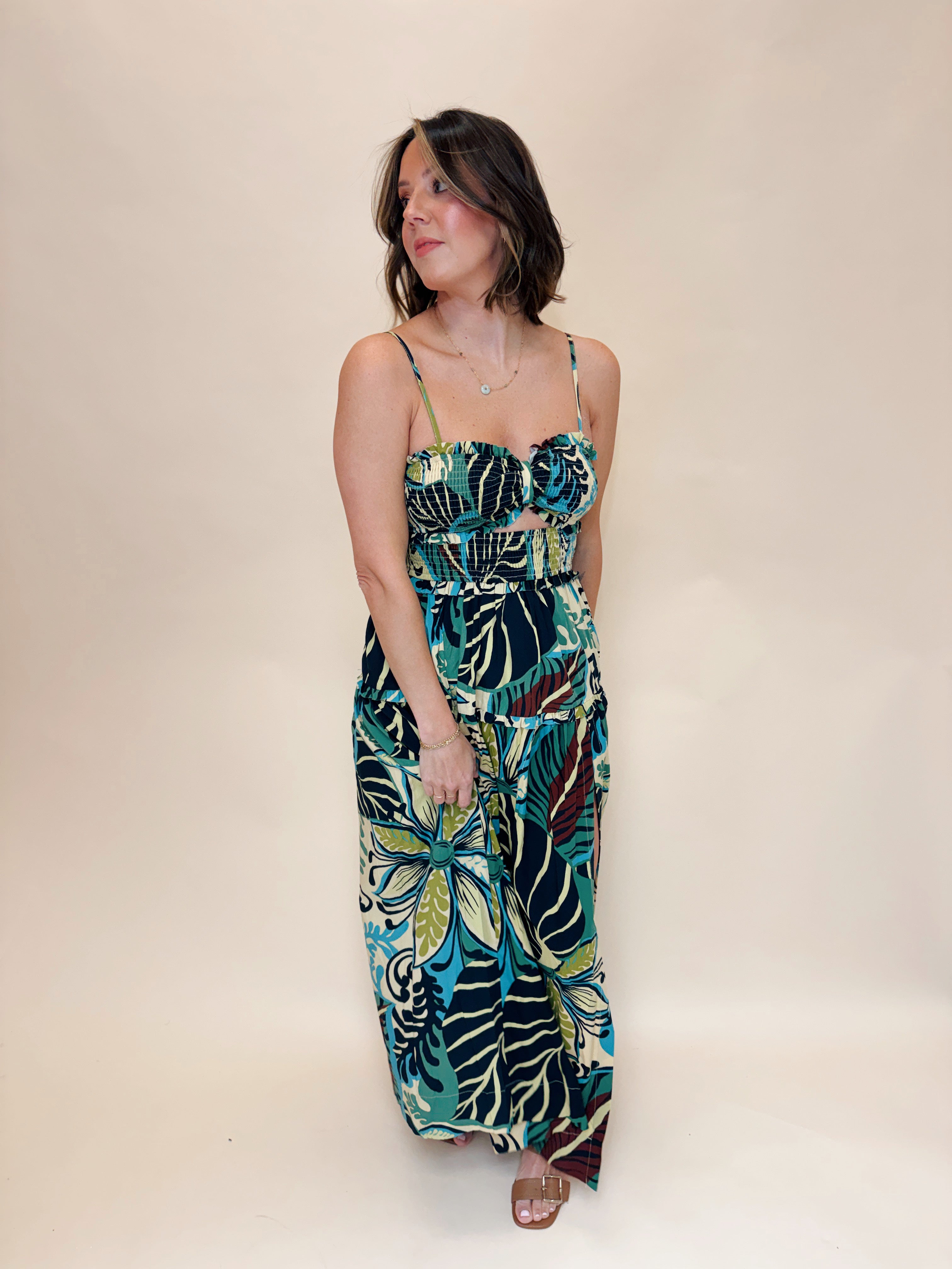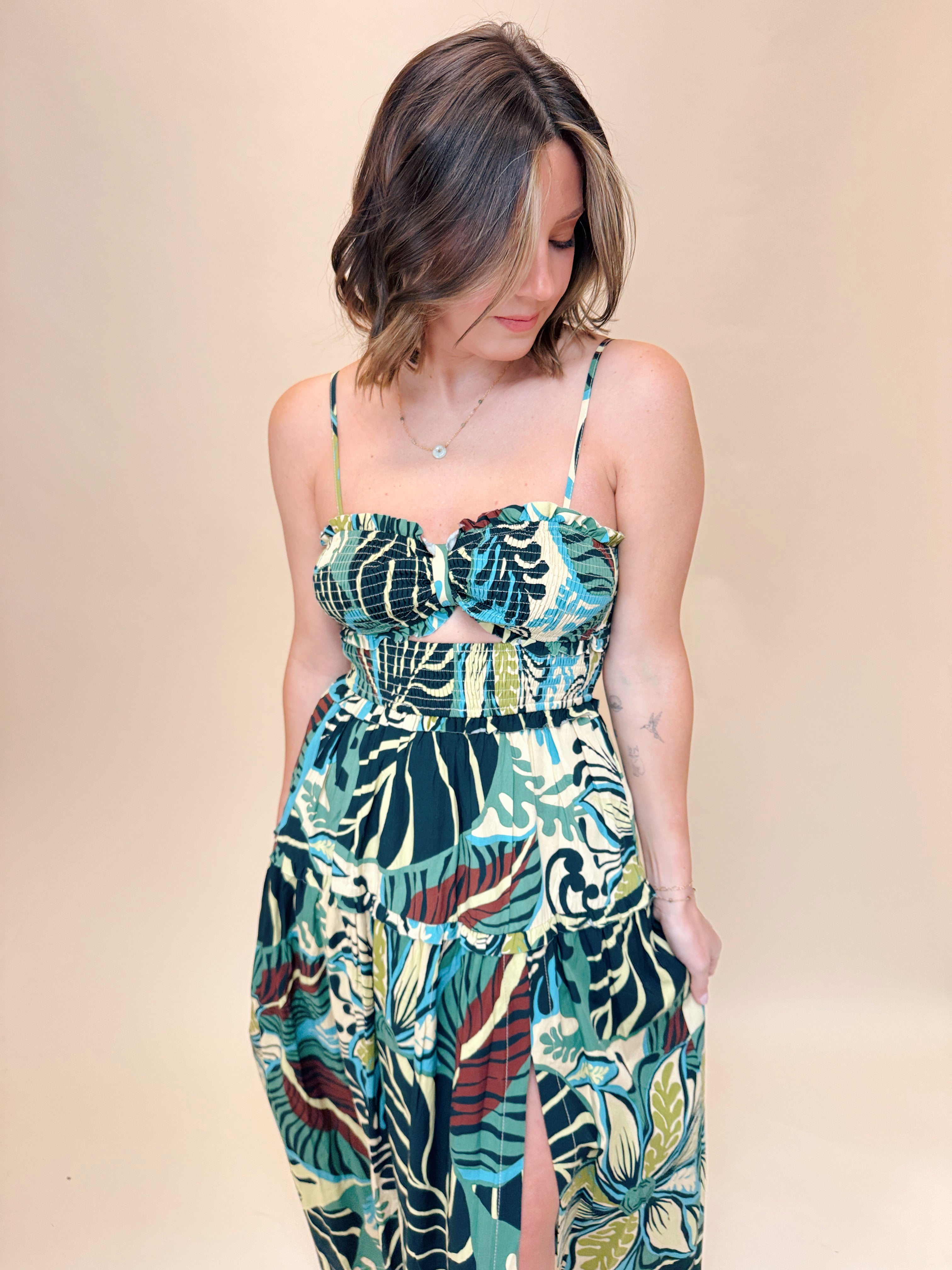 Make an unforgettable entrance in this show-stopping tropical print maxi dress that's equal parts feminine and bold. Featuring a ruched sweetheart neckline, smocked bodice with alluring cutout detail, and raw-edge ruffles that add artisanal charm, this piece is designed for the woman who loves to make a statement.