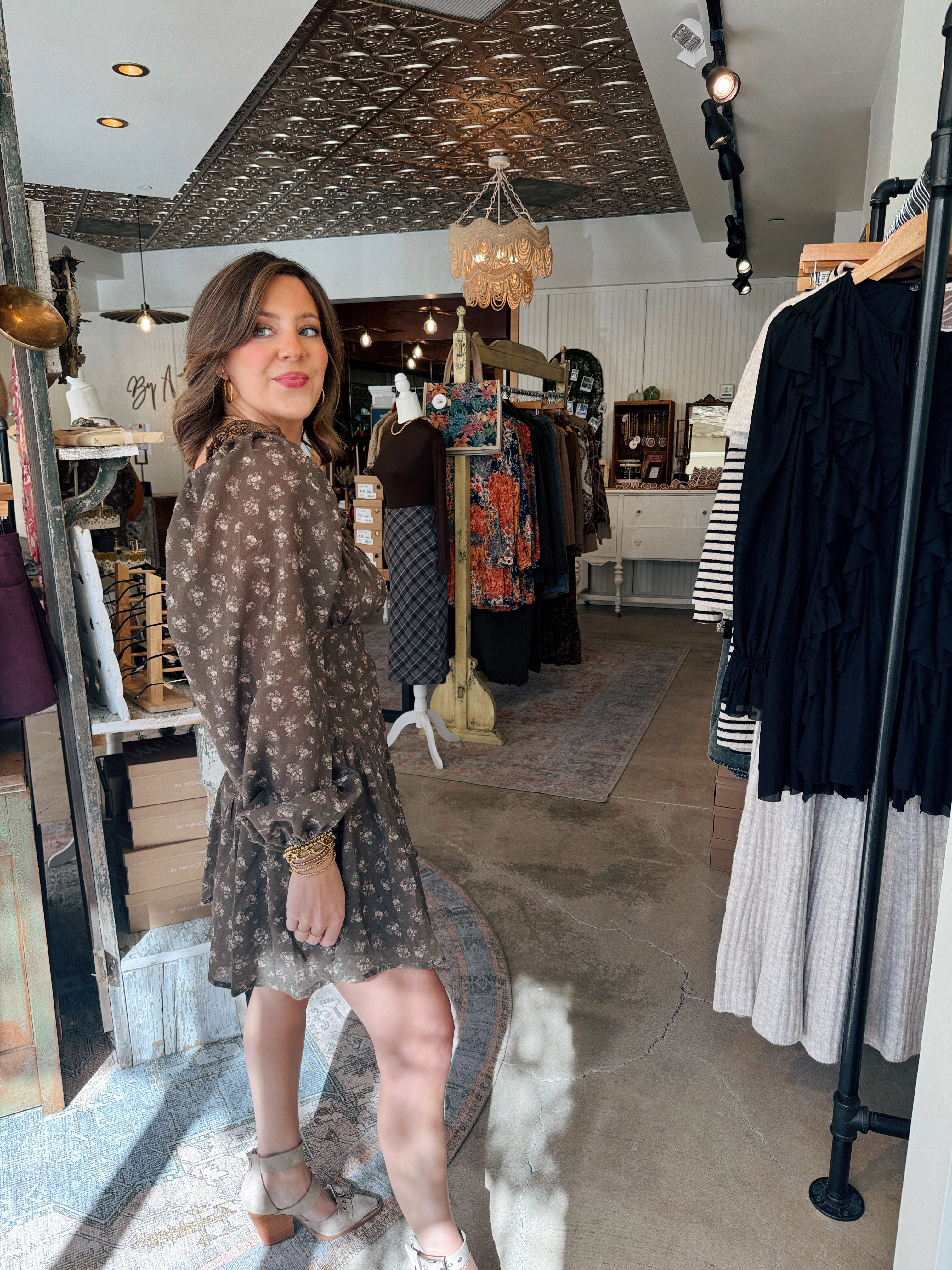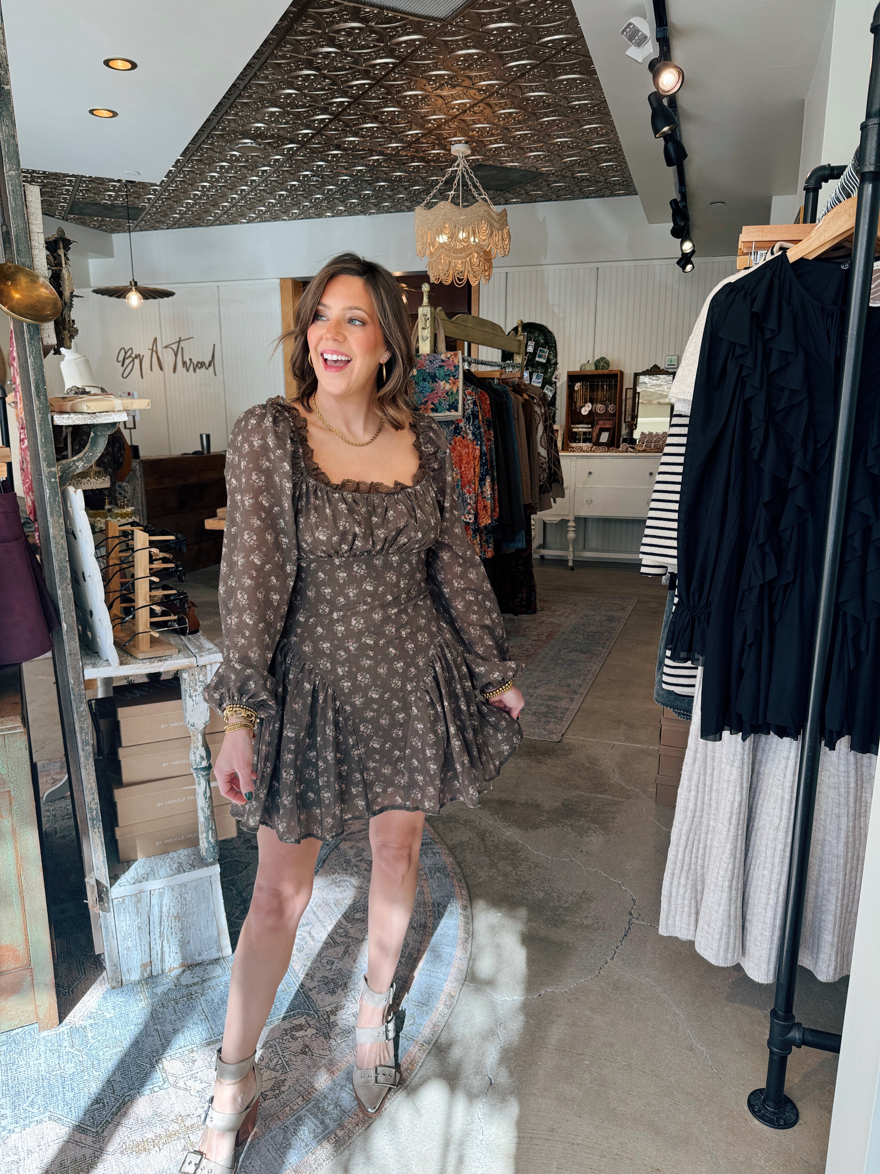 Step out in effortless style with this beautiful olive green mini dress. The sophisticated square neckline frames the décolletage beautifully, offering a modern take on a classic silhouette. Adorned with a delicate all-over floral print, this dress captures a romantic, vintage feel. Its comfortable long sleeves and playful mini length make it a versatile piece that easily transitions through seasons, perfect for day outings or dressed-up evenings.