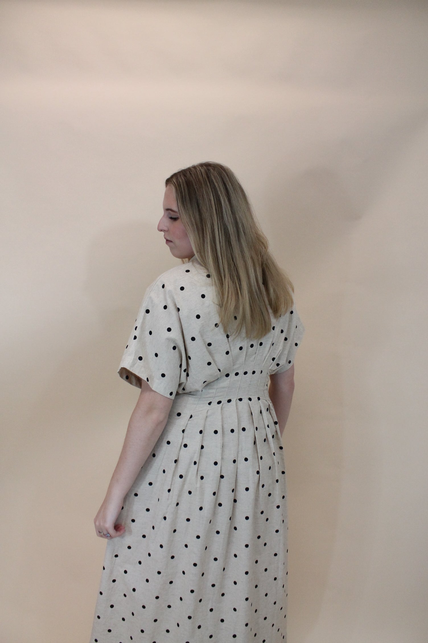 Timeless charm meets modern elegance in this polkadot print button front dress—a classic pattern reimagined in sophisticated oatmeal and black.