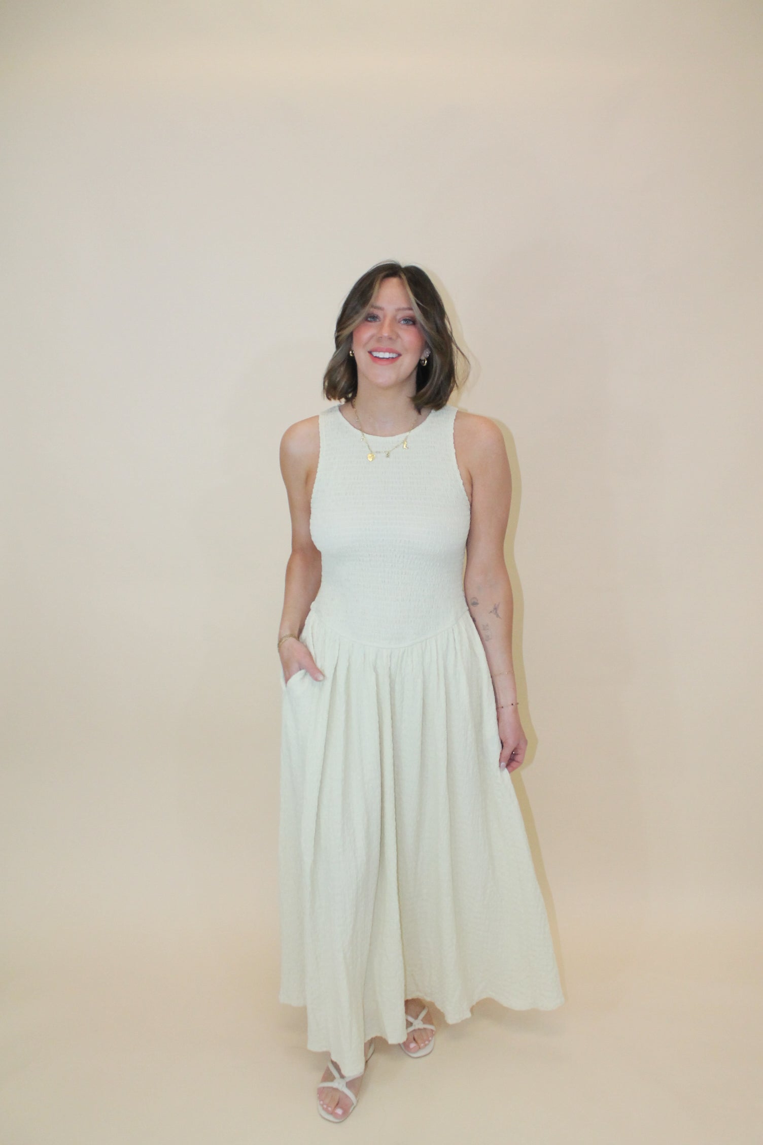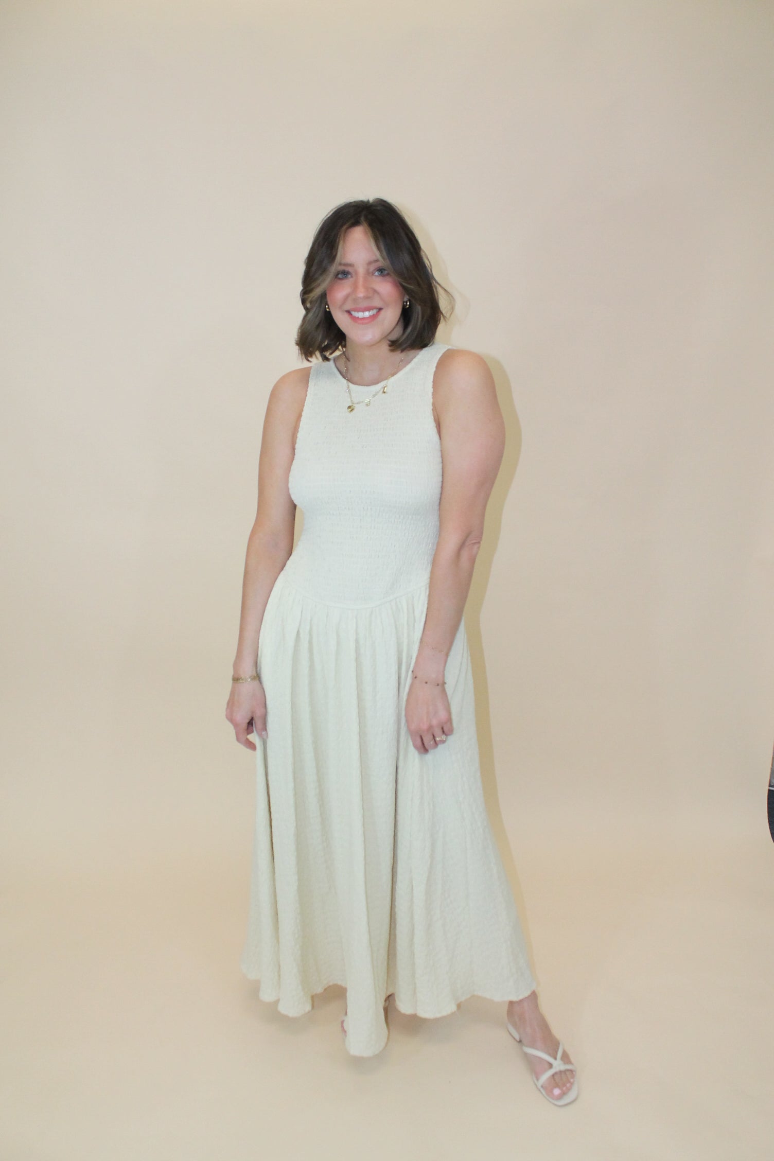 Effortlessly elegant and endlessly versatile, this Textured Smocked Sleeveless Dress in muted sage green is your new warm-weather essential. The delicate smocked bodice creates a flattering, feminine silhouette that moves with you, while the textured fabric adds subtle dimension and visual interest.