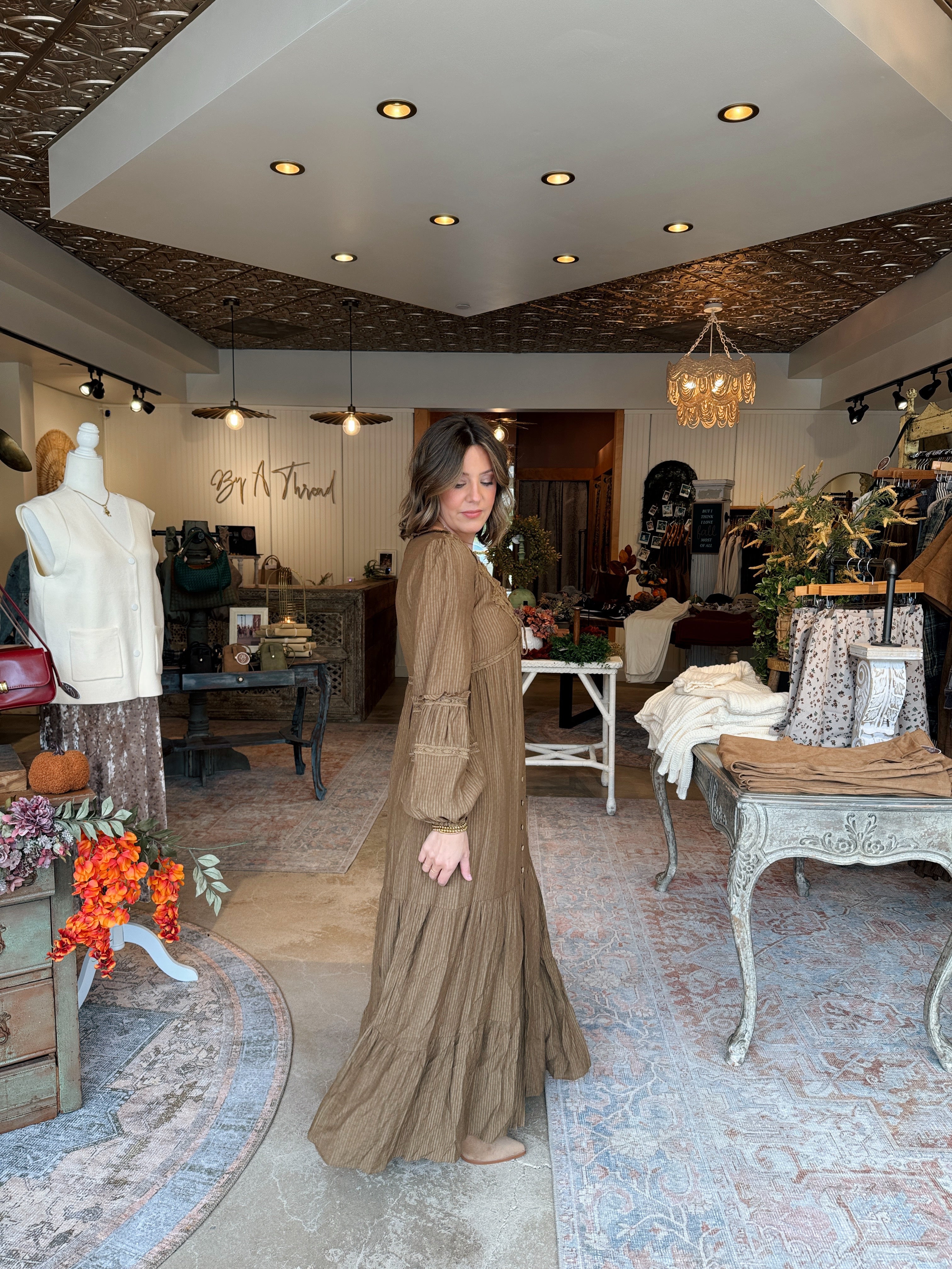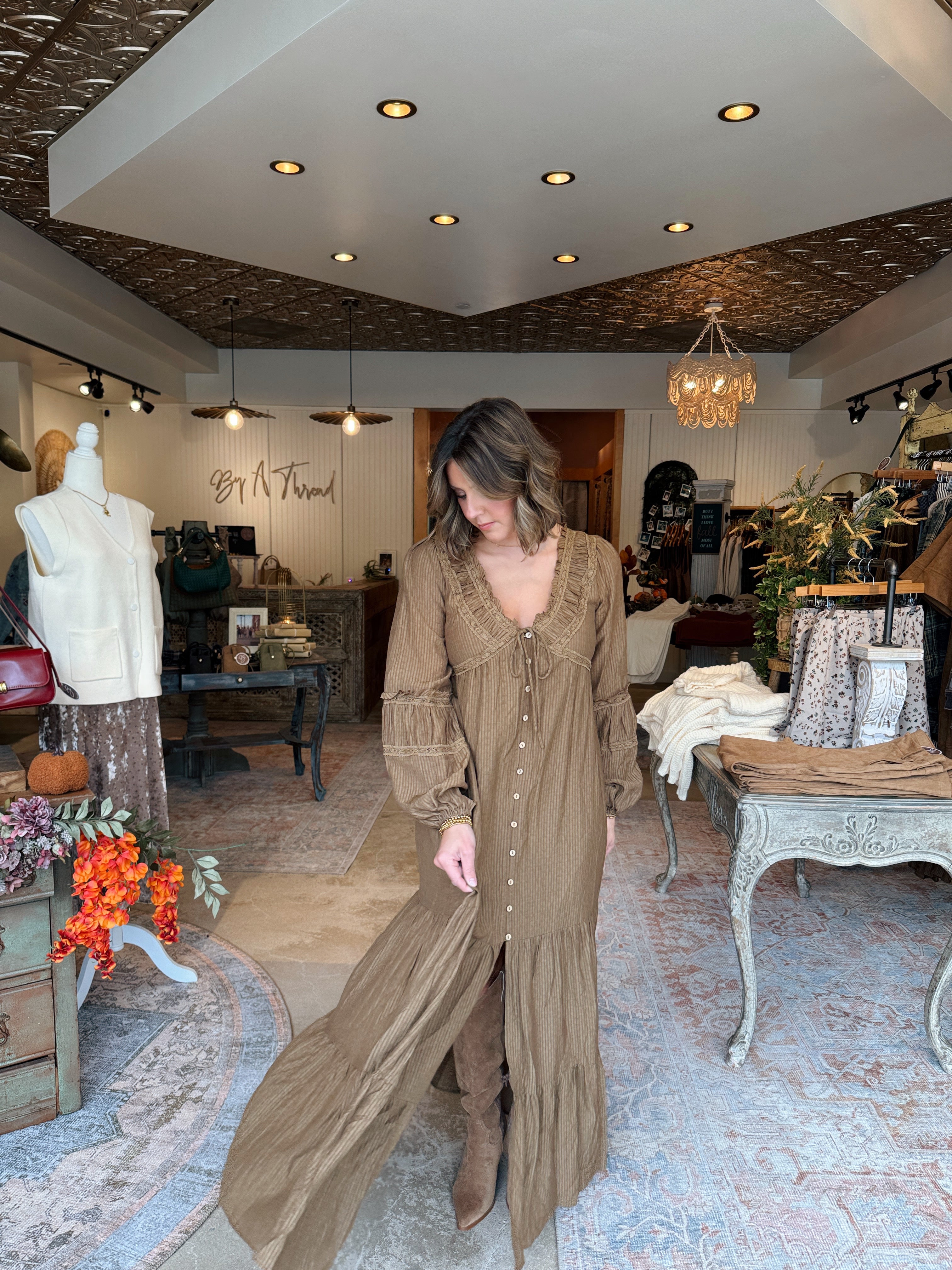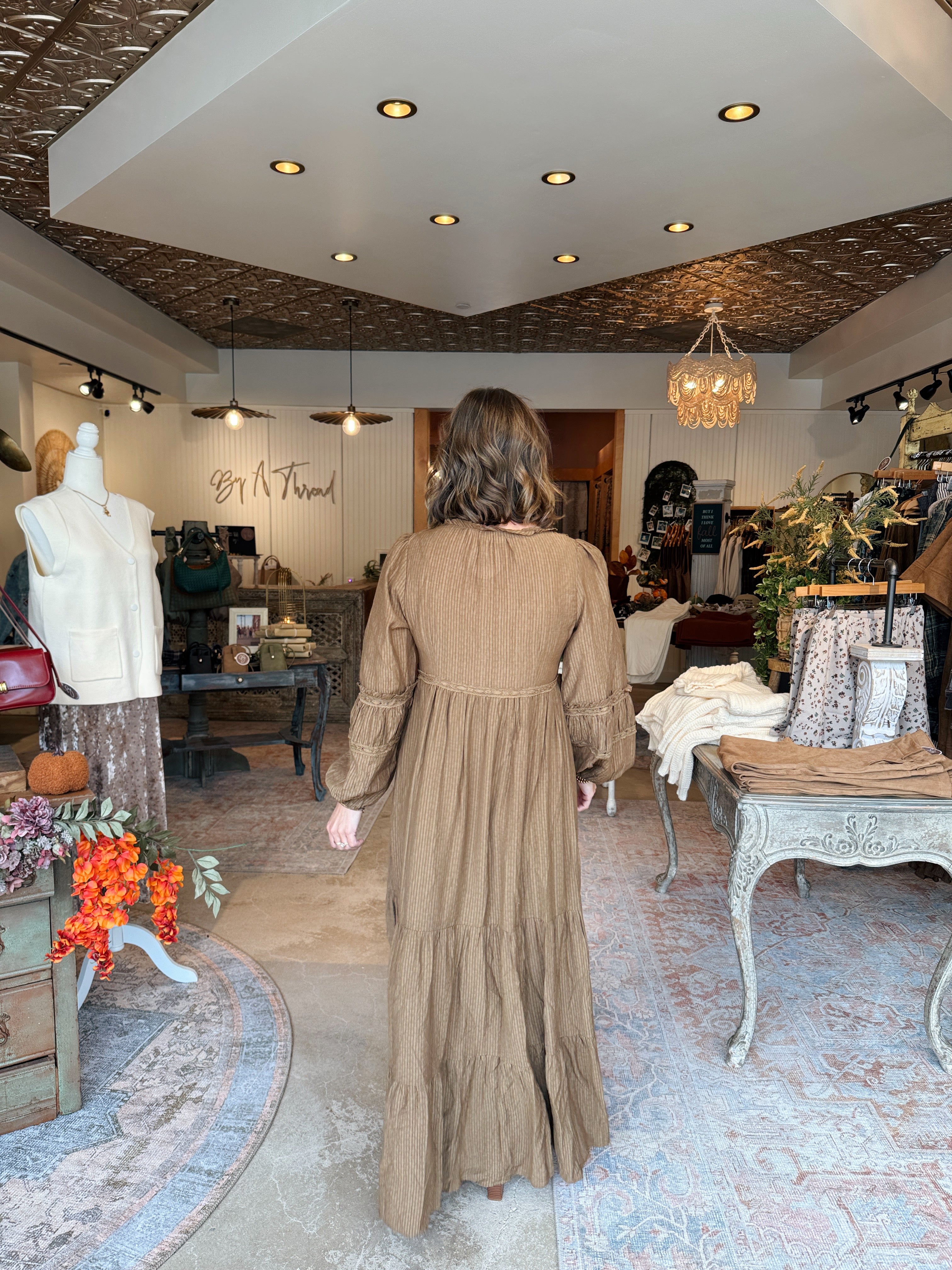 Float into effortless style with this beautiful brown maxi dress. Crafted from a unique textured tonal-stripe fabric, it offers subtle dimension and a touch of bohemian flair.