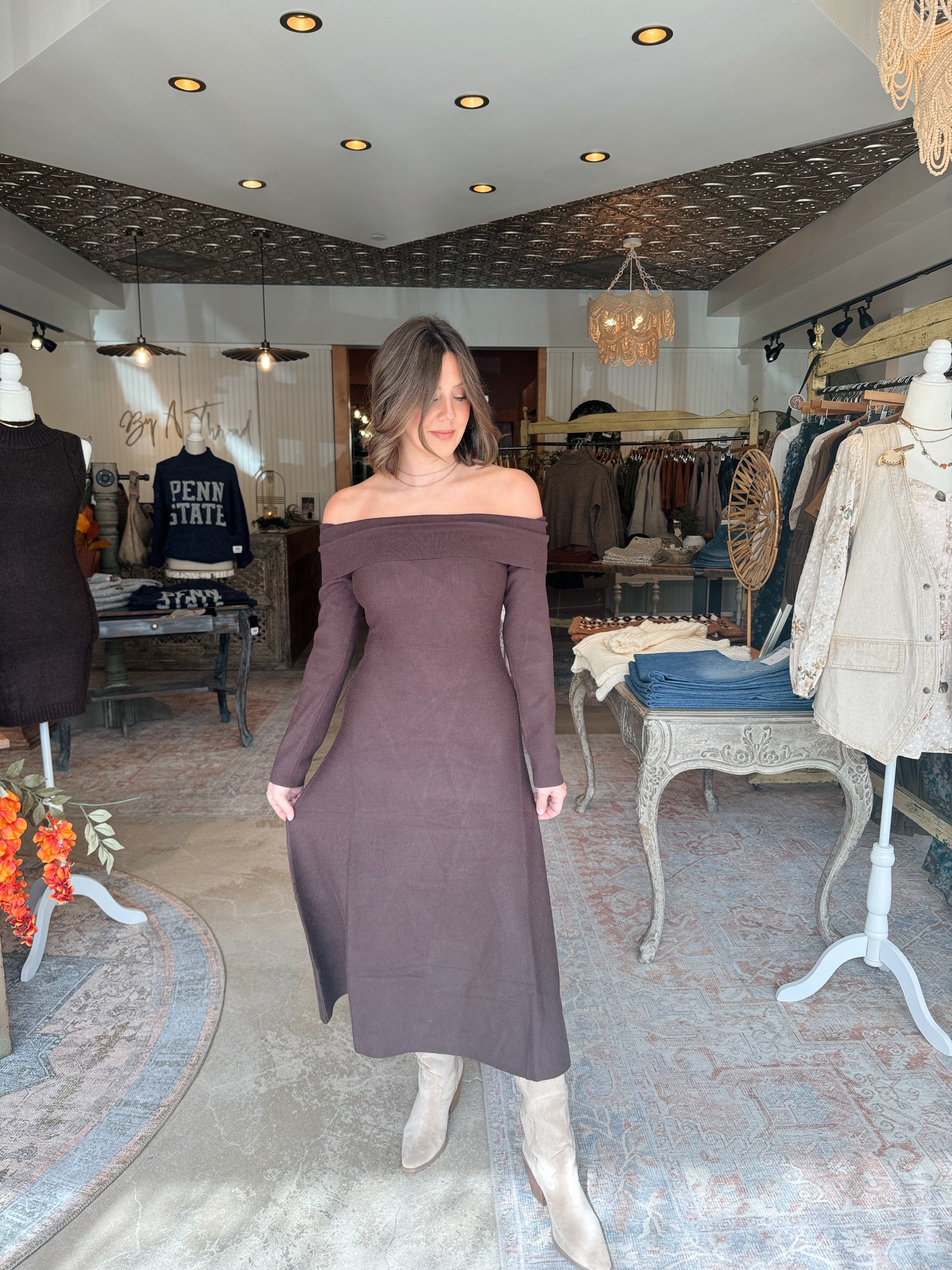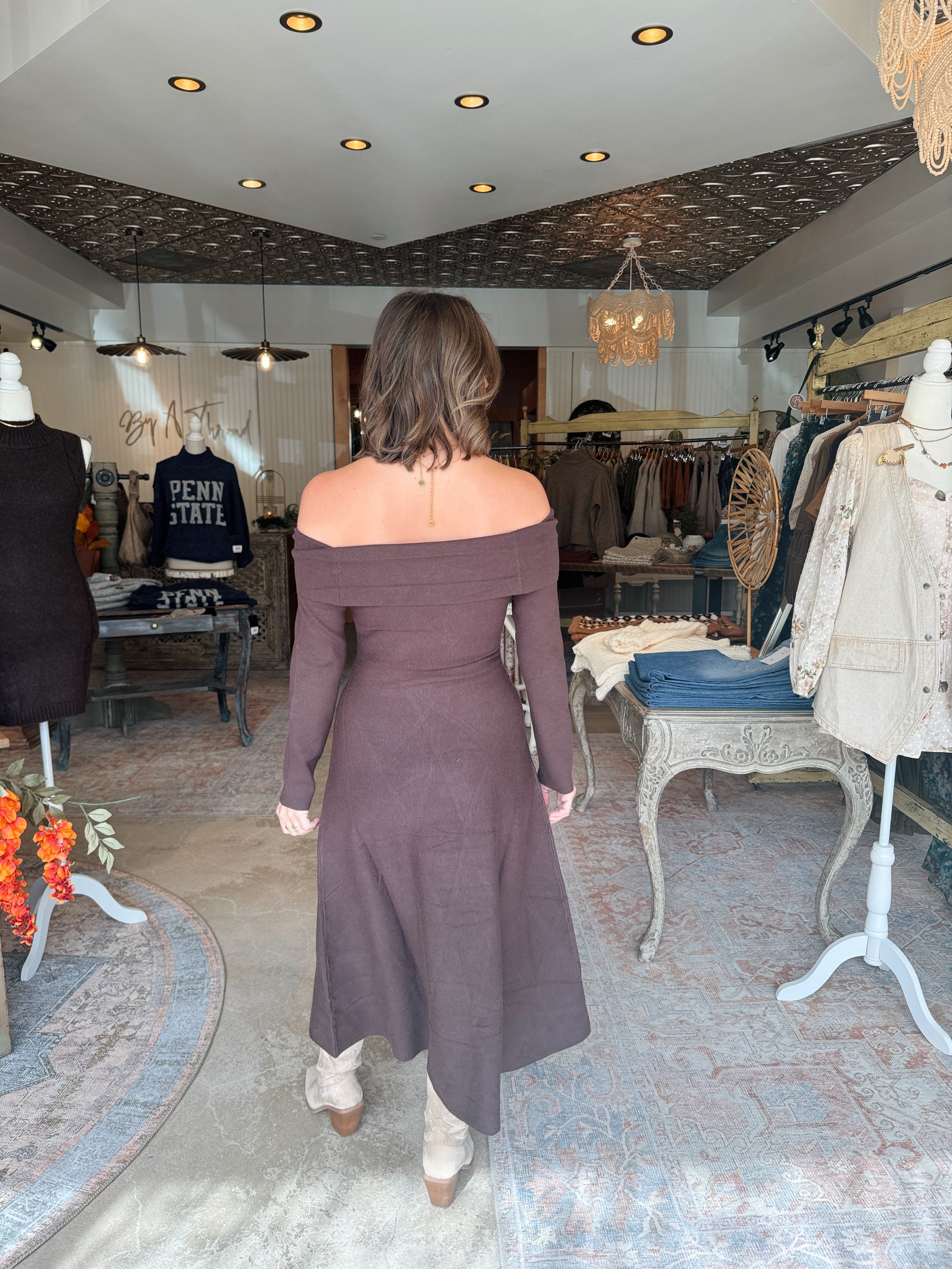 This dress is crafted in a rich, warm brown knit, offering a versatile color that's perfect for the cooler months. The elegant off-shoulder neckline adds a touch of allure and sophistication, beautifully framing your collarbone. The fit & flare silhouette accentuates your waist before flowing into a graceful midi skirt, creating a flattering and feminine shape that moves with beautiful drape.