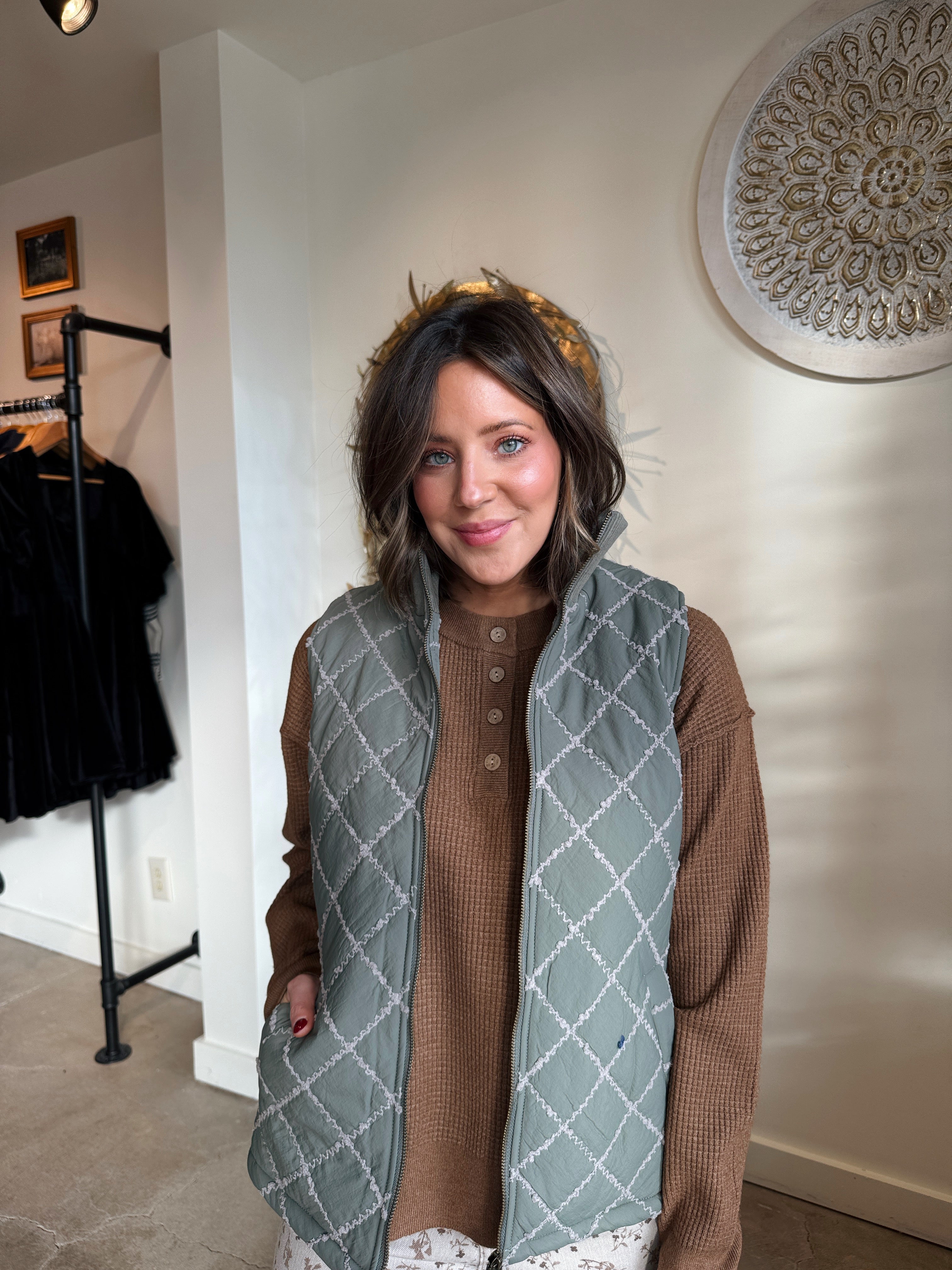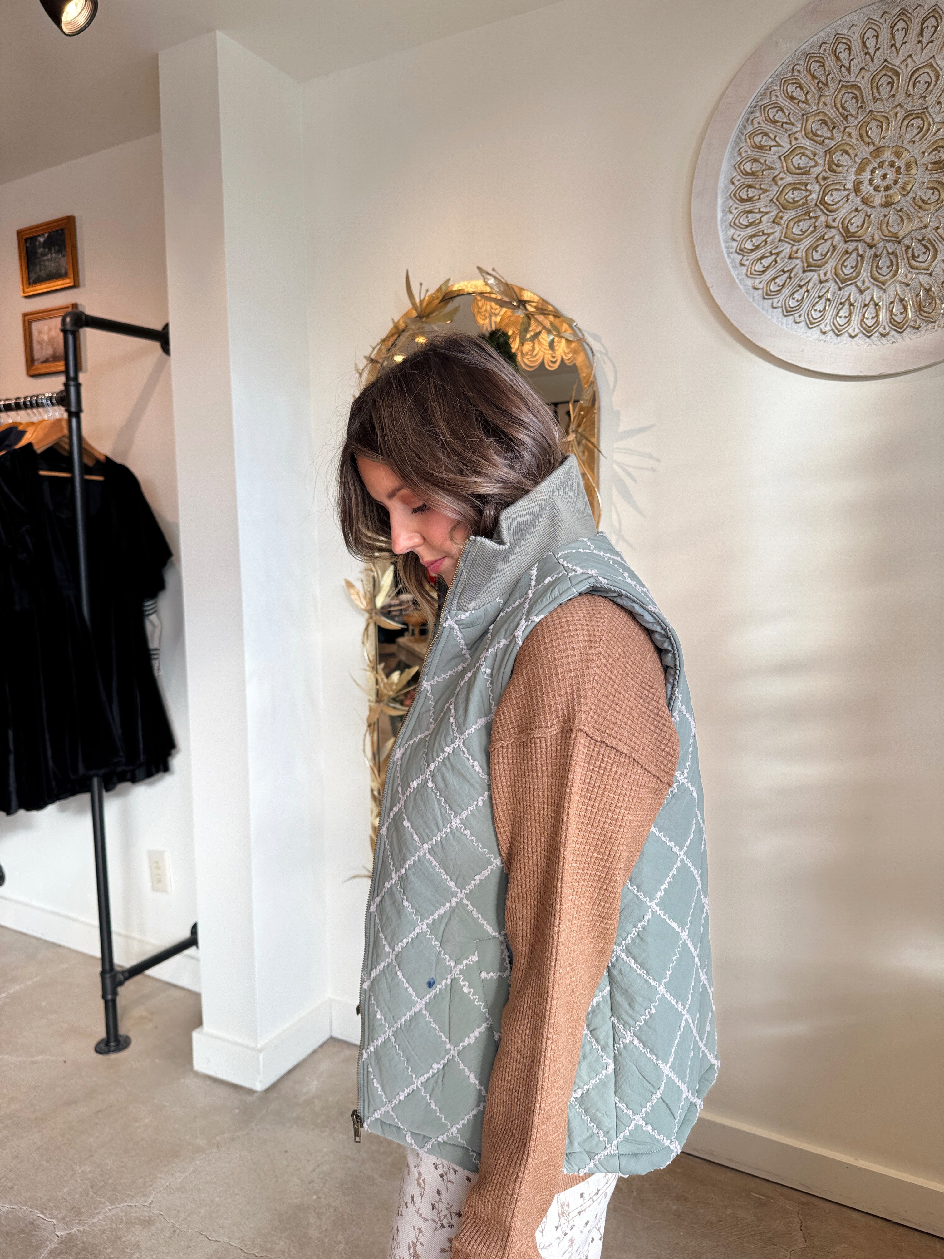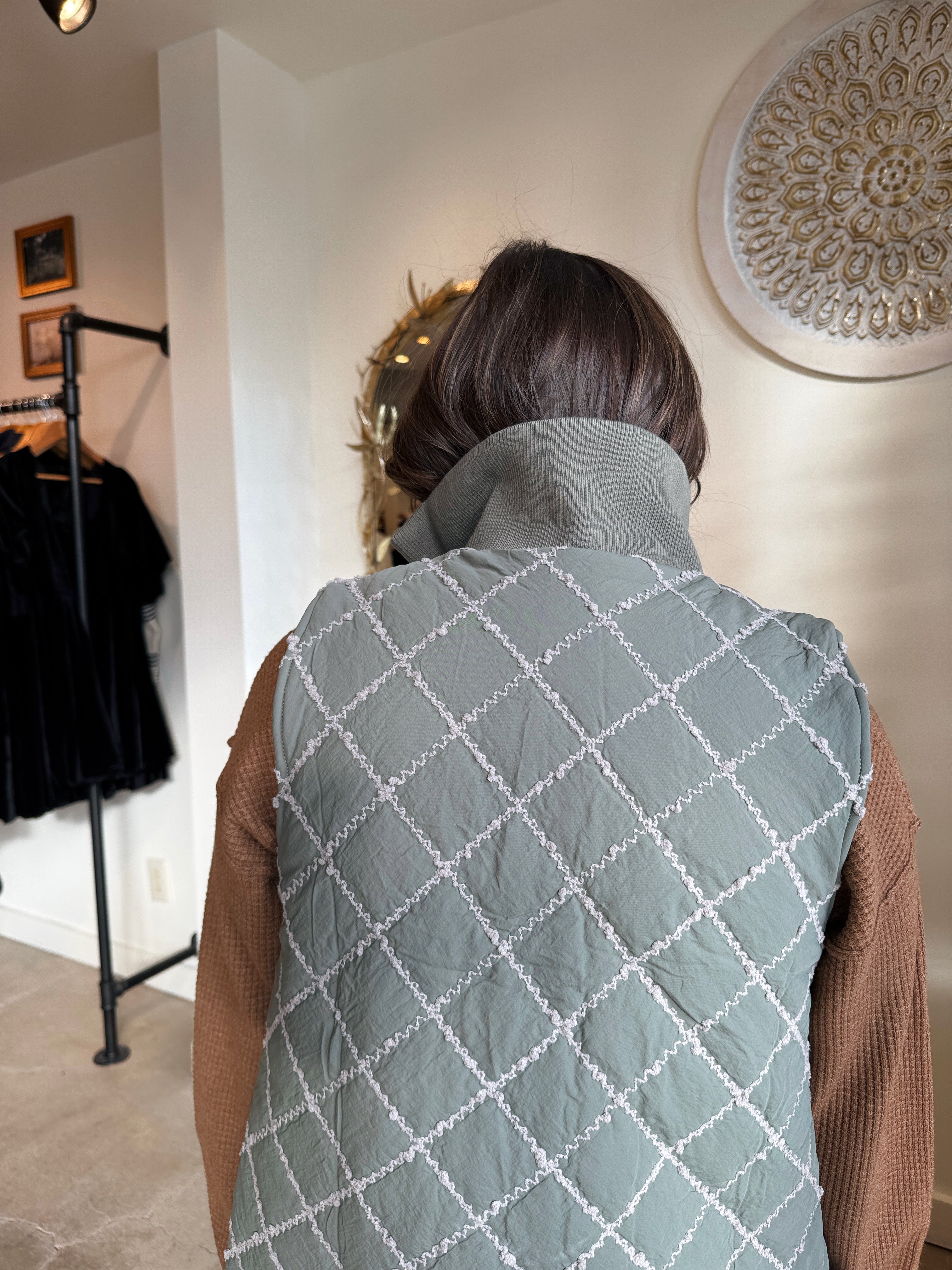Add essential warmth and sophisticated detail to your cold-weather layers with this stitch detailed rib collar padded vest, offered in a beautiful winter sage green with cream stitching detail. This vest is a closet necessity because it offers exceptional core warmth without restricting movement, making it the perfect piece for transitional weather or active days. It features stylish cream stitching detail that highlights the structure of the vest, while the cozy rib collar provides extra comfort and protection for the neck. The comfortable padded design ensures lightweight insulation. Style this versatile vest over a chunky knit sweater and leggings for a hike, or layer it over a crisp long-sleeve shirt and jeans for a polished, casual weekend look.