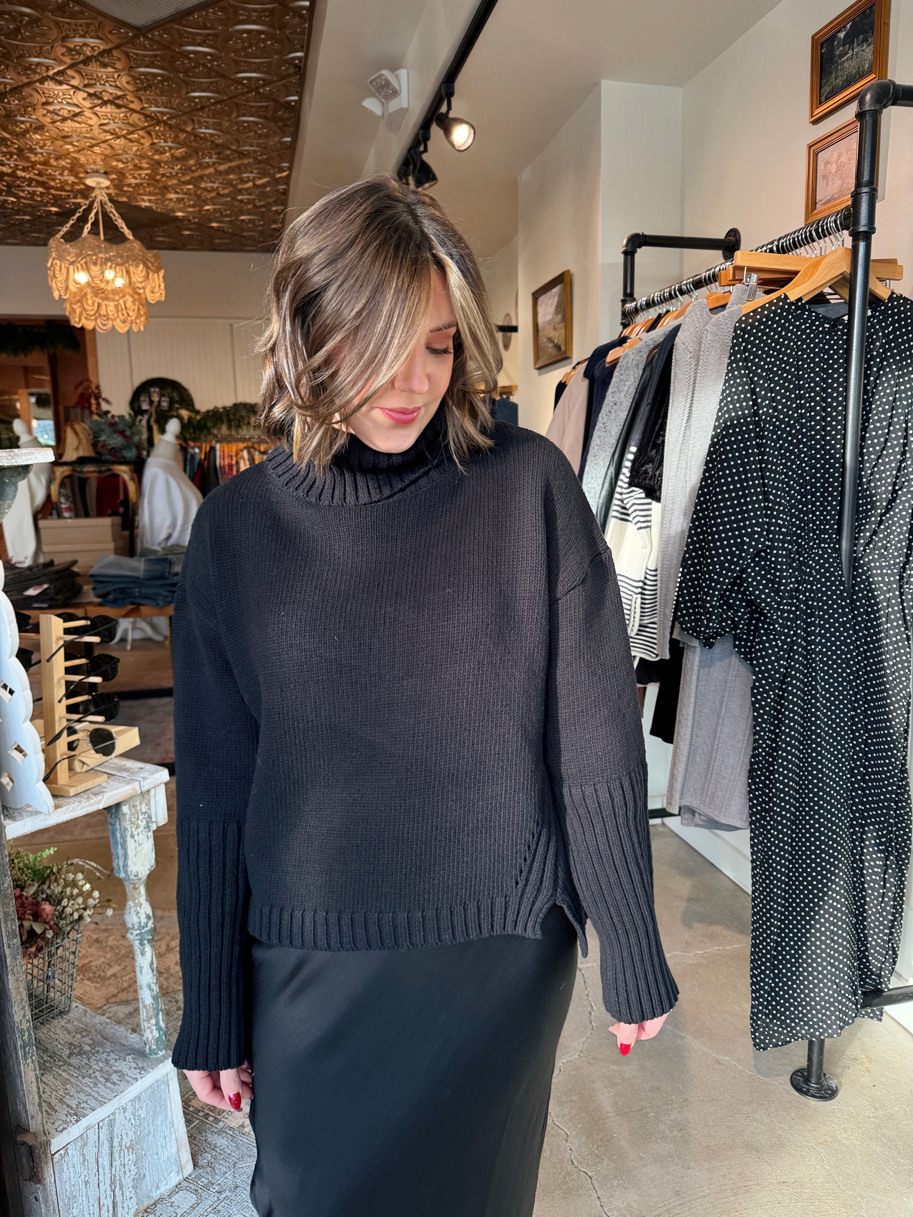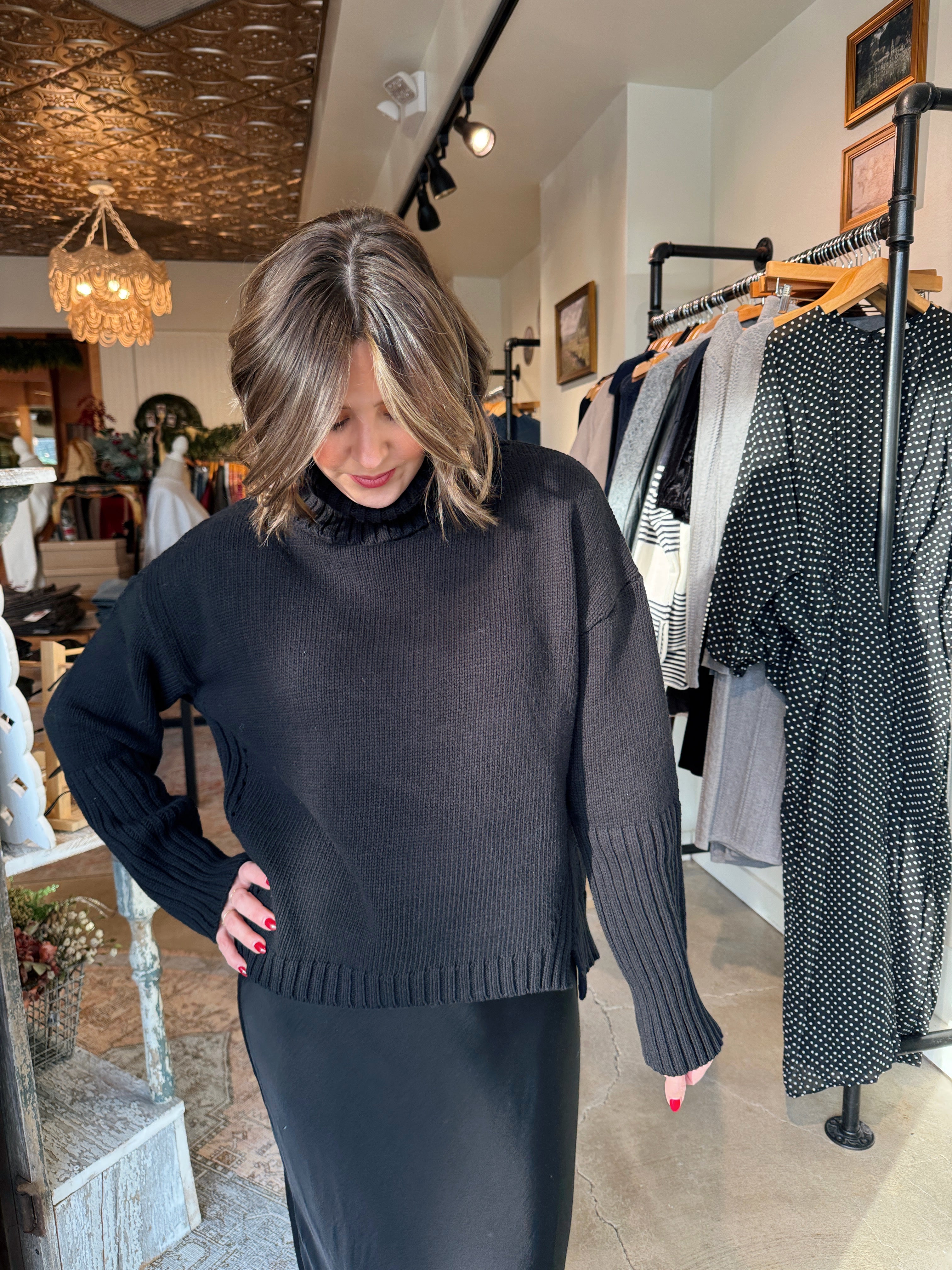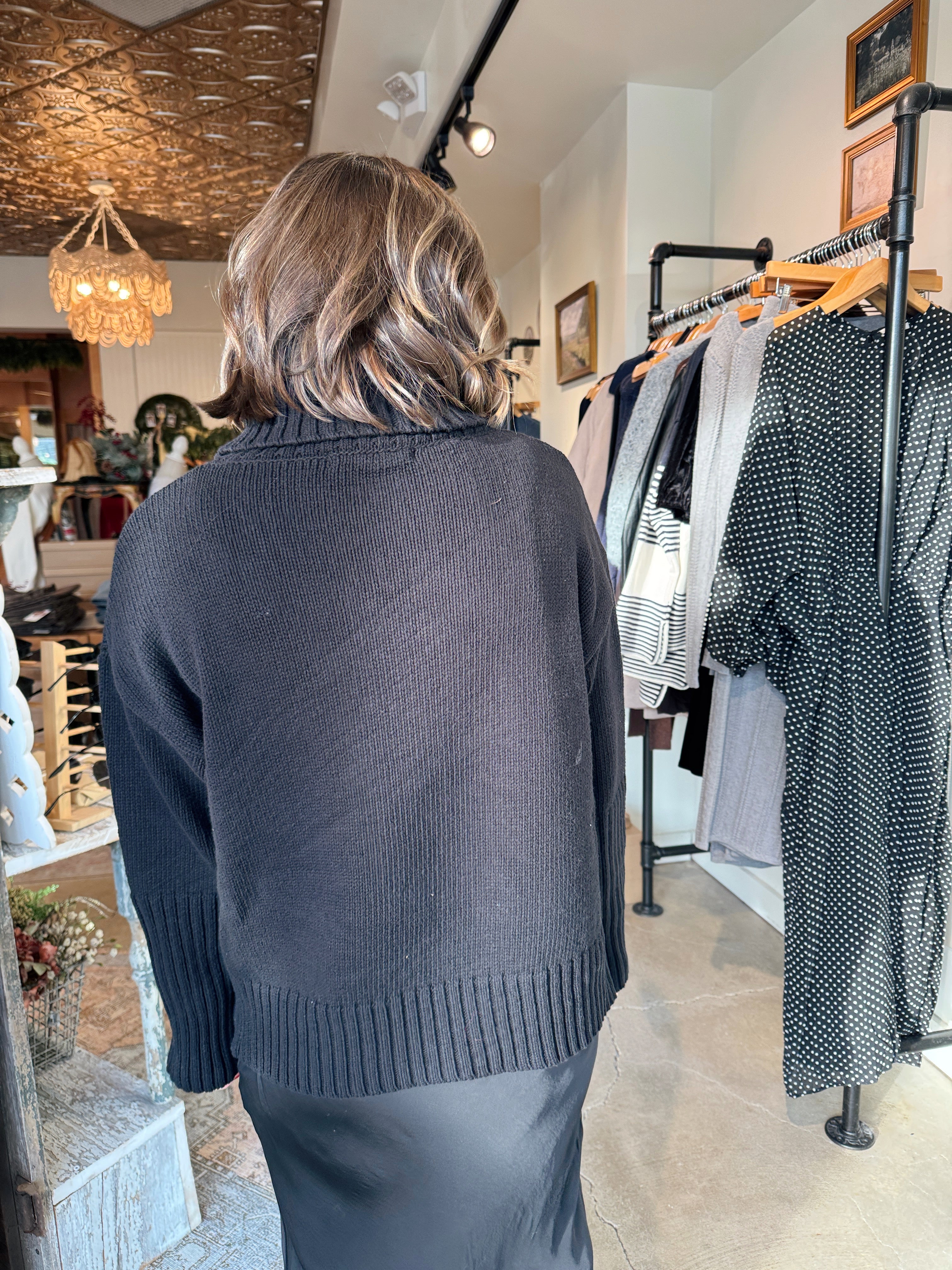 The Hallie sweater is one of those effortless staples you’ll reach for again and again. Designed in a classic black, this medium-weight knit features a cozy turtleneck, relaxed drop shoulders, and long sleeves for that perfectly slouchy-but-polished look. Easy to dress up or down, it’s the kind of sweater that works just as well with denim and boots as it does layered over trousers for a more elevated feel.