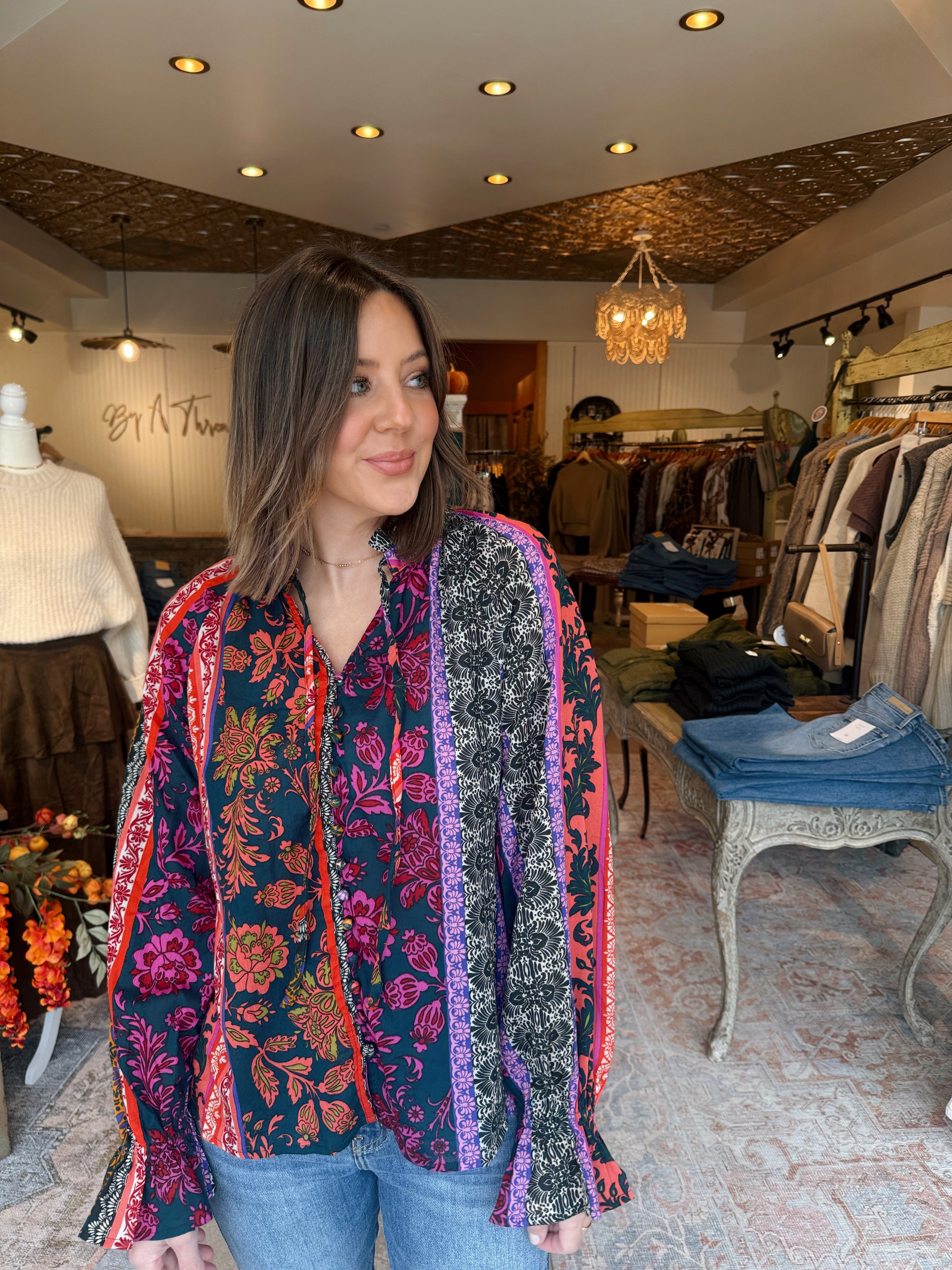 This charming printed button down blouse offers a romantic yet relaxed sensibility. It features a flattering v neckline complemented by a delicate ruffled collar with a string tie detail, allowing for customizable styling. The relaxed silhouette and flowy fabric create an effortless drape, while the long sleeves finish with matching ruffled openings for a feminine flourish. With classic front button closures, this unlined blouse is a lightweight and versatile piece perfect for warm days and elegant layering.