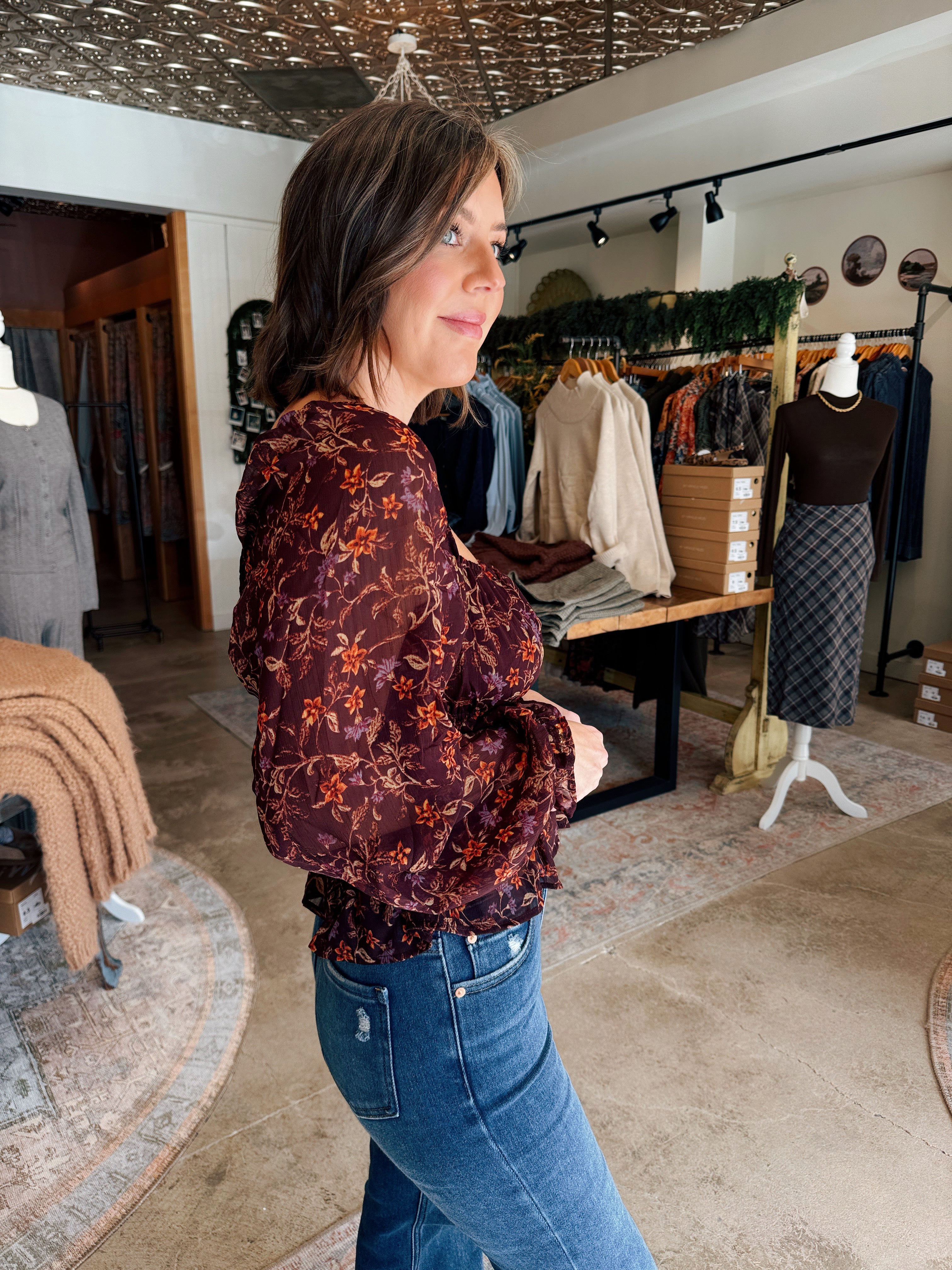This feminine and sophisticated top features a beautiful plum floral chiffon print set against delicate detailing. The charming square neckline provides a classic, flattering frame, while the sheer sleeves add a light, airy quality perfect for transitional weather. A lovely cinched detail subtly shapes the bodice for a custom, comfortable fit, and the look is completed by a sweet, playful flutter hem that moves gracefully with you. This top is a wonderful choice for adding a touch of romantic elegance to any casual or dressy occasion.