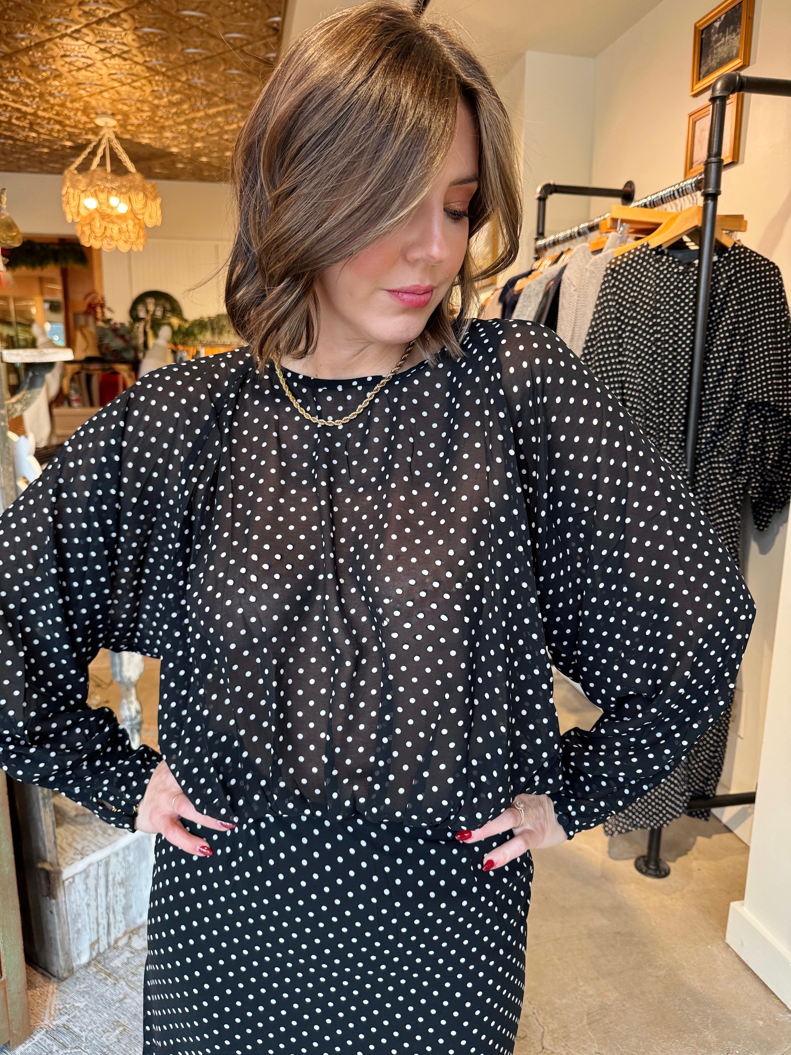 This black and cream polka dot maxi dress is a timeless statement piece with effortless movement and elegant detail. Crafted from lightweight chiffon, it features long sheer sleeves that add softness and drama while the fully lined bodice ensures comfortable, confident wear. The classic polka dot print gives this dress a vintage-inspired feel that never goes out of style.