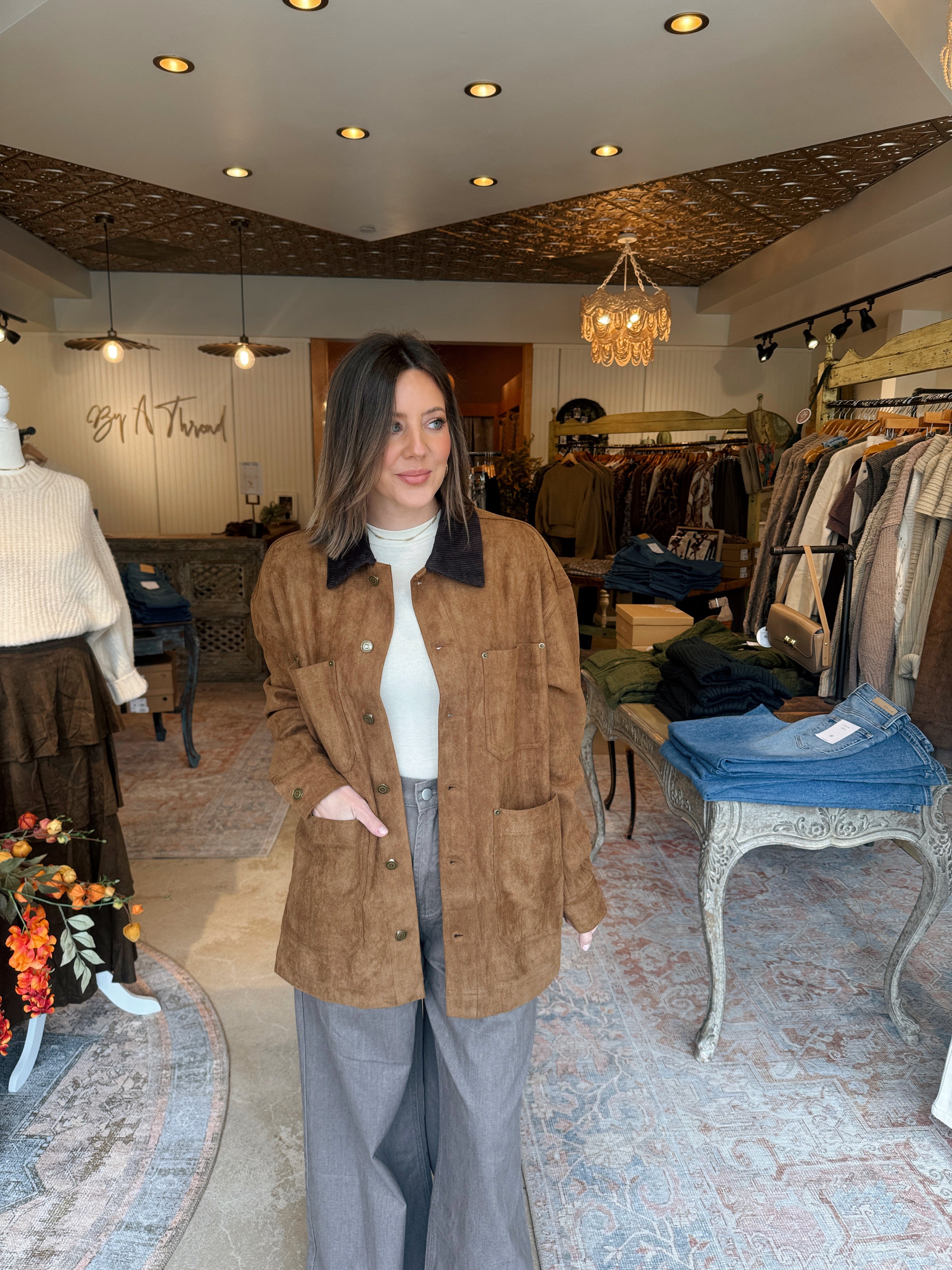 Workwear Heritage: Layer over a chunky knit sweater (like the eggshell knit turtleneck sweater) and dark denim, finished with leather boots.