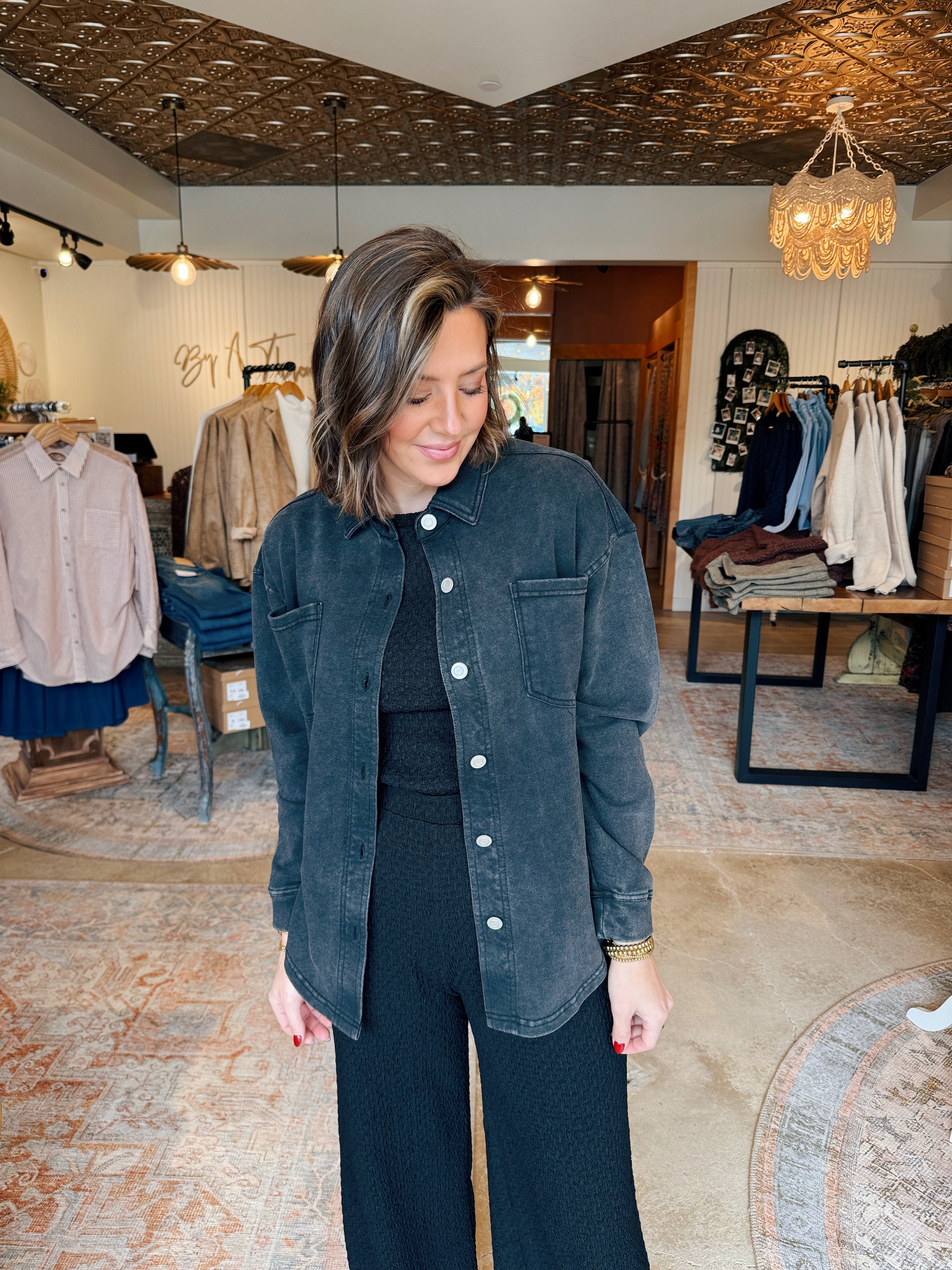 Introducing the perfect transitional piece: a washed black denim-style jacket that brings an instant touch of cool to any outfit. Designed for everyday wear, this jacket features a soft, lived-in feel and classic details for a versatile, casual look.