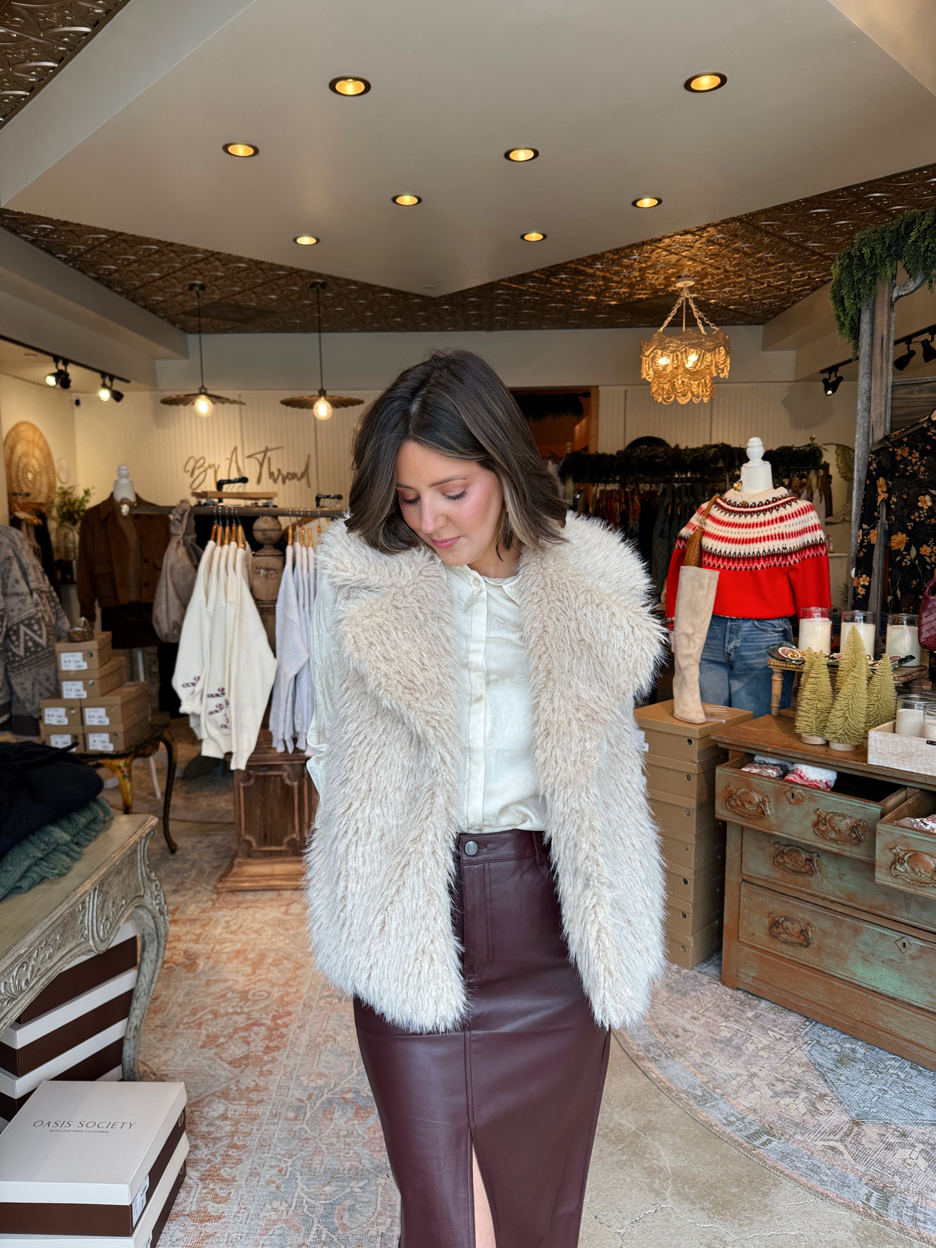 Layer up your look with this luxurious vest, featured in a versatile light taupe shade. It is crafted from a cozy, curly-textured faux fur material, which provides both exceptional warmth and a rich, tactile dimension to any outfit. This piece offers effortless style and is perfect for adding an immediate touch of sophisticated texture and comfort over your favorite long-sleeved tops and sweaters.