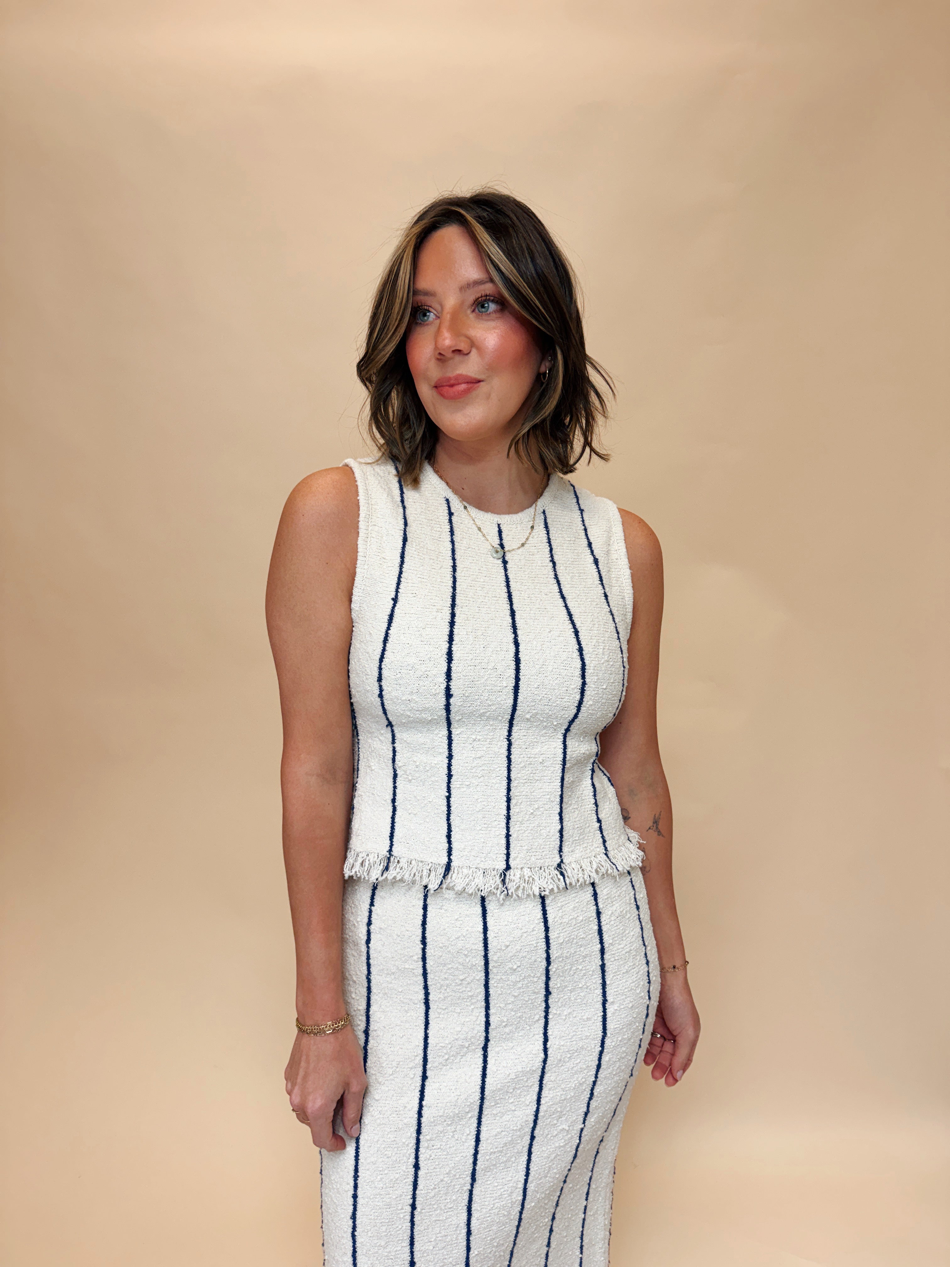 Perfect for pairing with denim or tucking into high-waisted skirts, this top brings a fresh, textured twist to your everyday wardrobe. The playful tassel hem adds just the right amount of detail without overwhelming the classic striped silhouette.