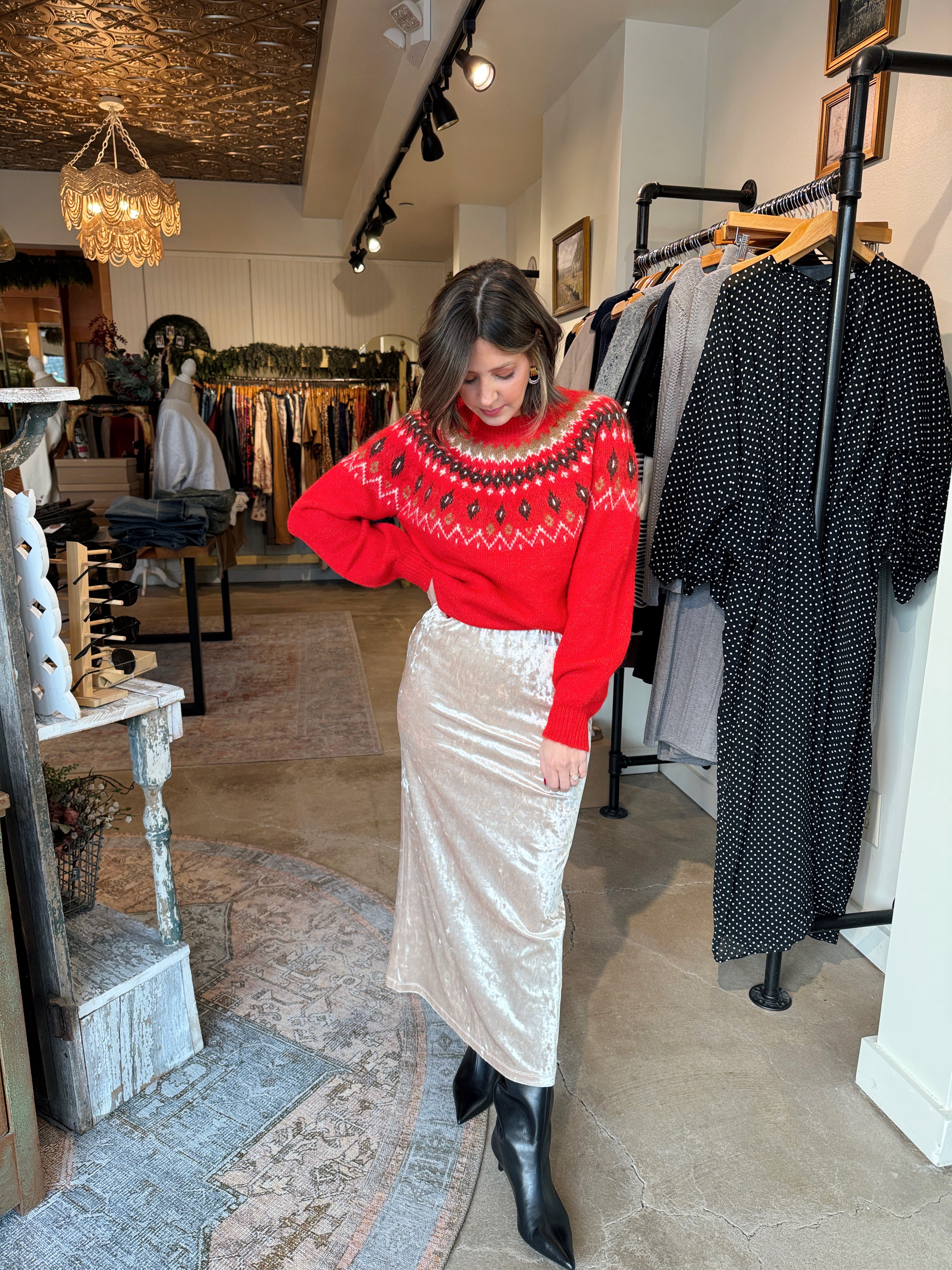 This champagne crushed velvet midi skirt is the definition of effortless elegance. Designed with a comfortable elastic waistband and a fluid midi length, it gives you that polished, dressed-up look without sacrificing comfort. The soft crushed velvet fabric catches the light beautifully, making it perfect for holiday parties, date nights, weddings, or elevated everyday styling.
