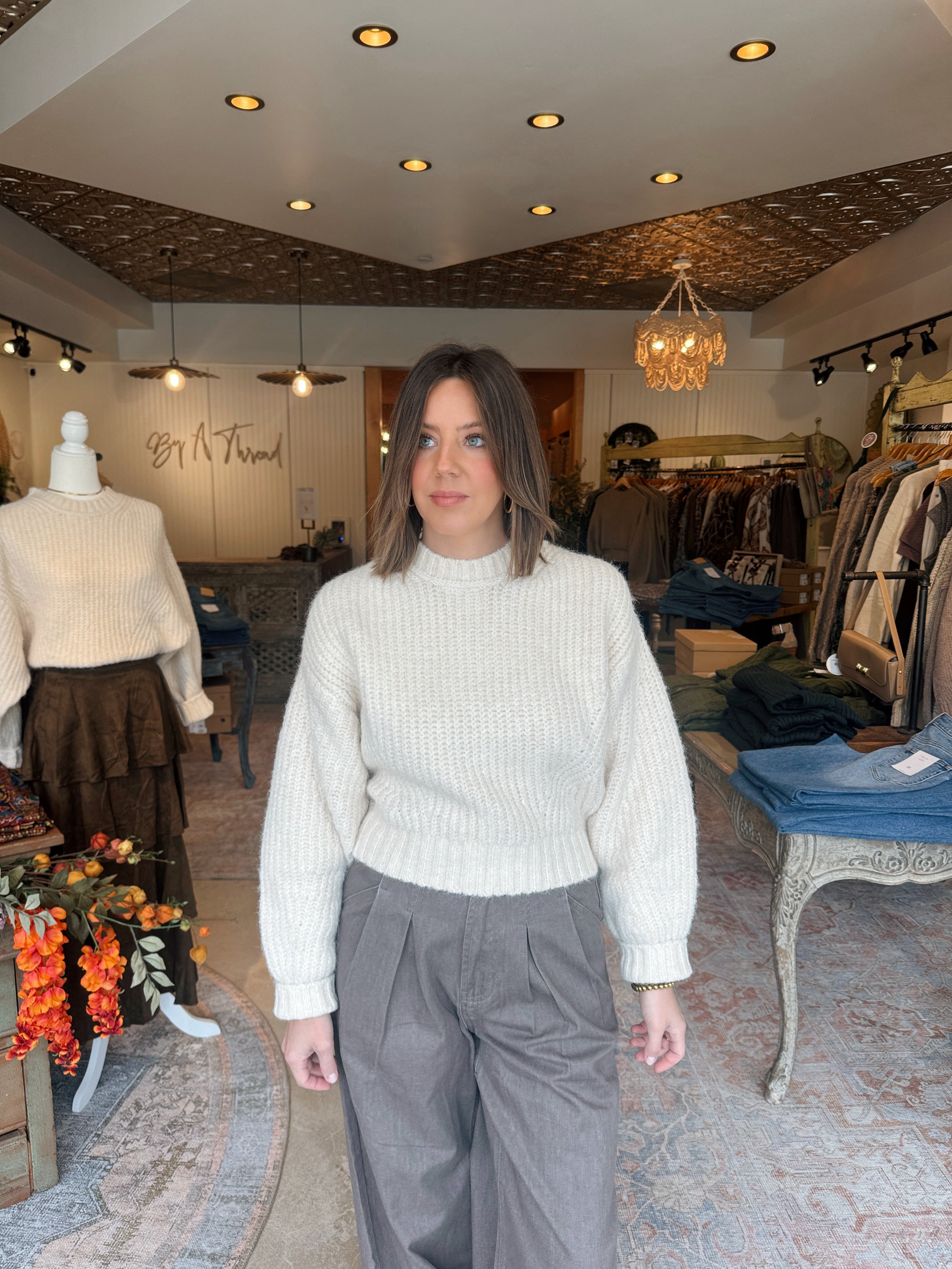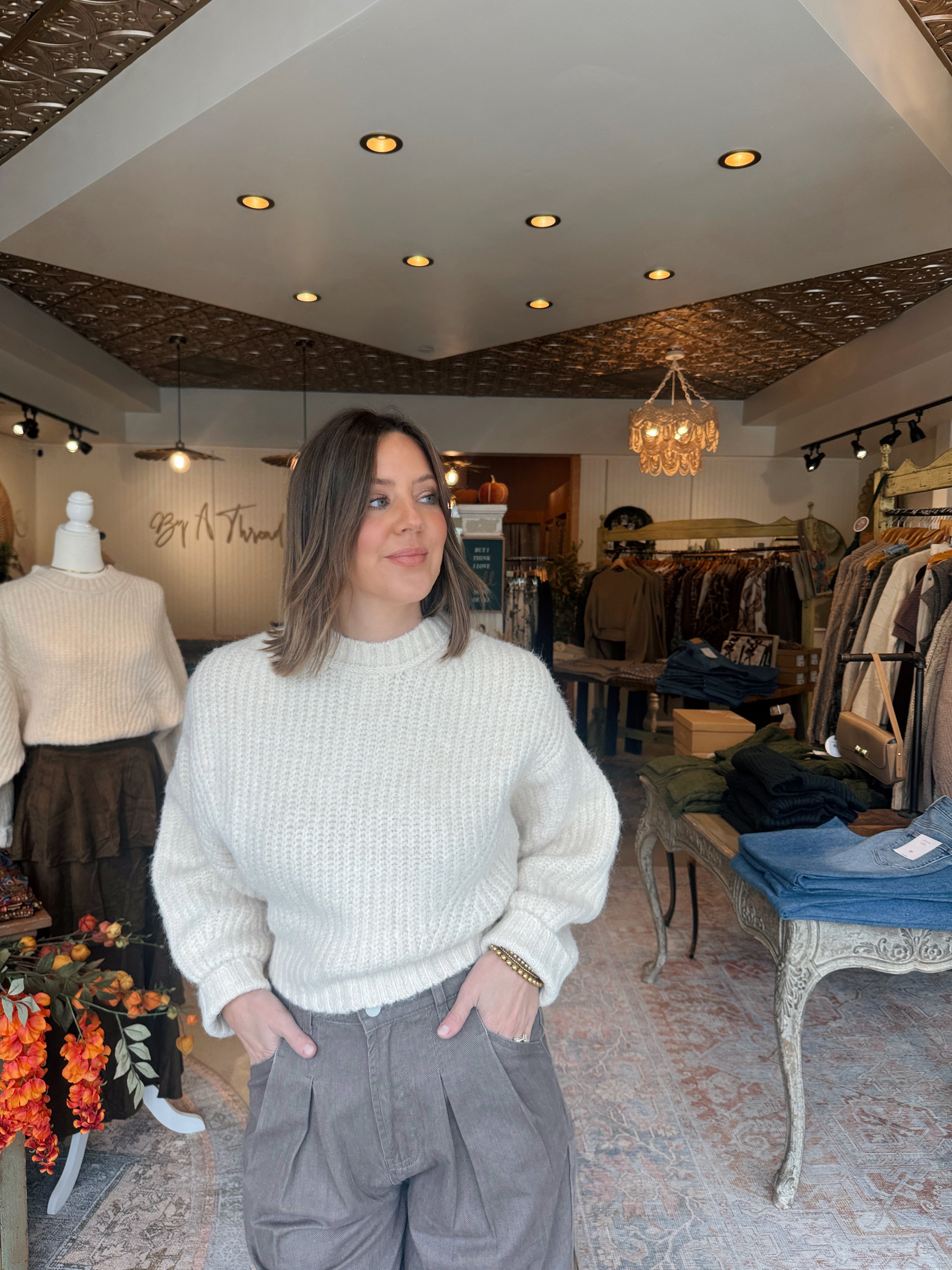 Wrap yourself in cozy comfort with this luxurious cream slouchy pullover sweater. Designed for ultimate relaxation and effortless style, this crew neck knit features a soft, substantial texture and a warm cream color that pairs with everything. The defining detail is the slouchy, dropped-shoulder sleeve, which adds a contemporary, relaxed drape and generous volume, making it the perfect piece to curl up in or layer for an easygoing look.