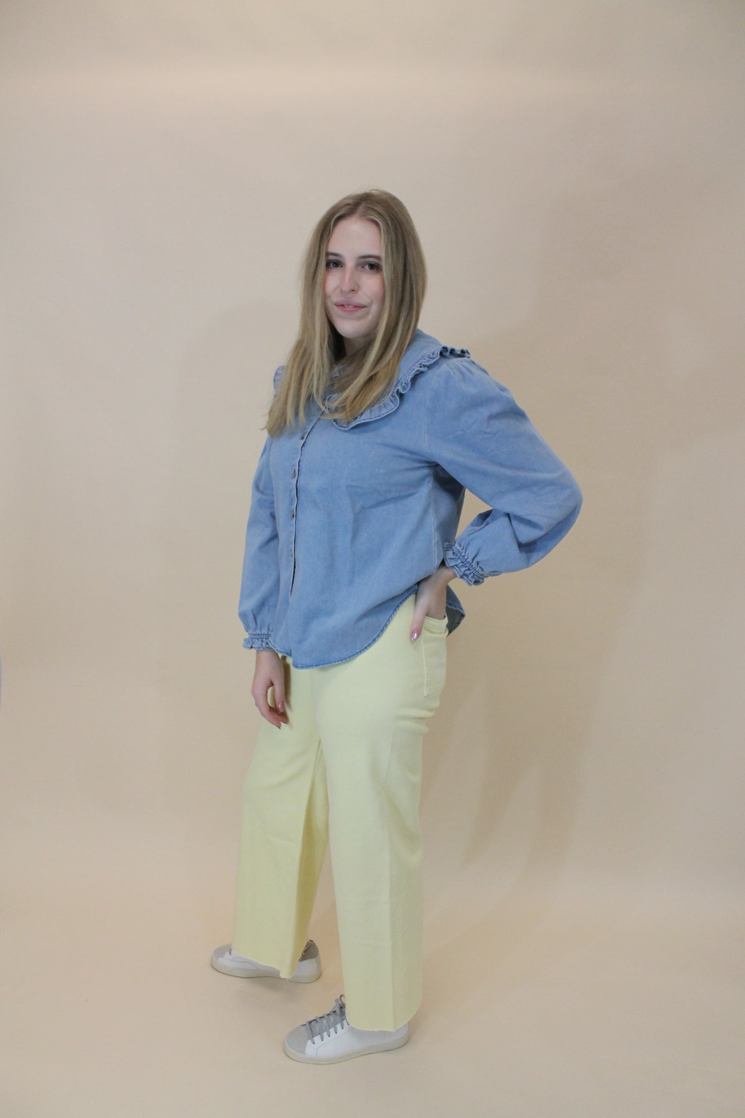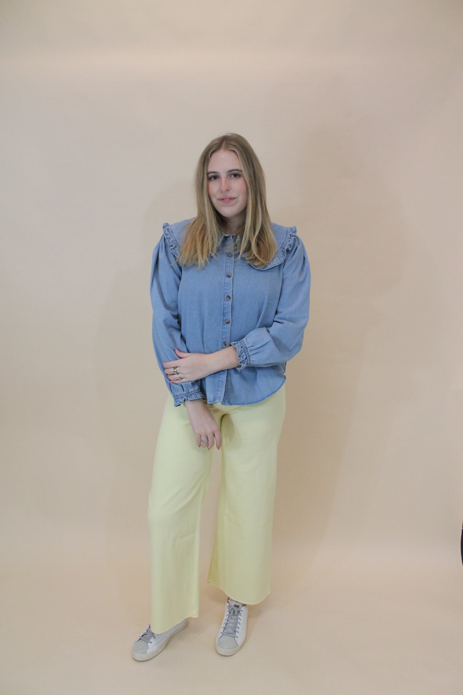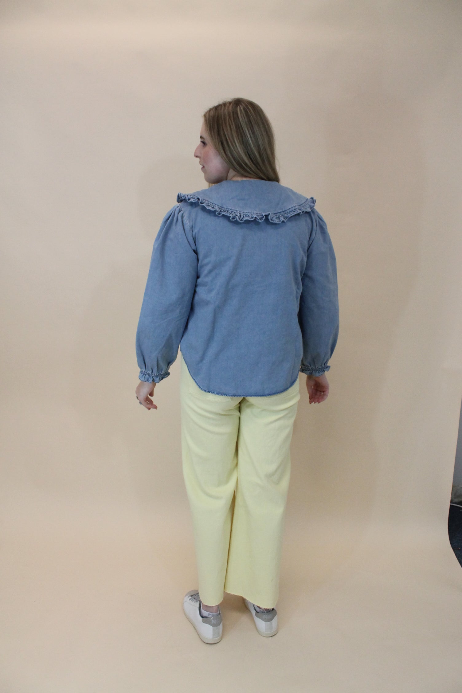 Charming and effortlessly chic, this light denim button-up top features a sweet peter pan collar with delicate ruffle trim that adds a feminine touch to a classic silhouette.