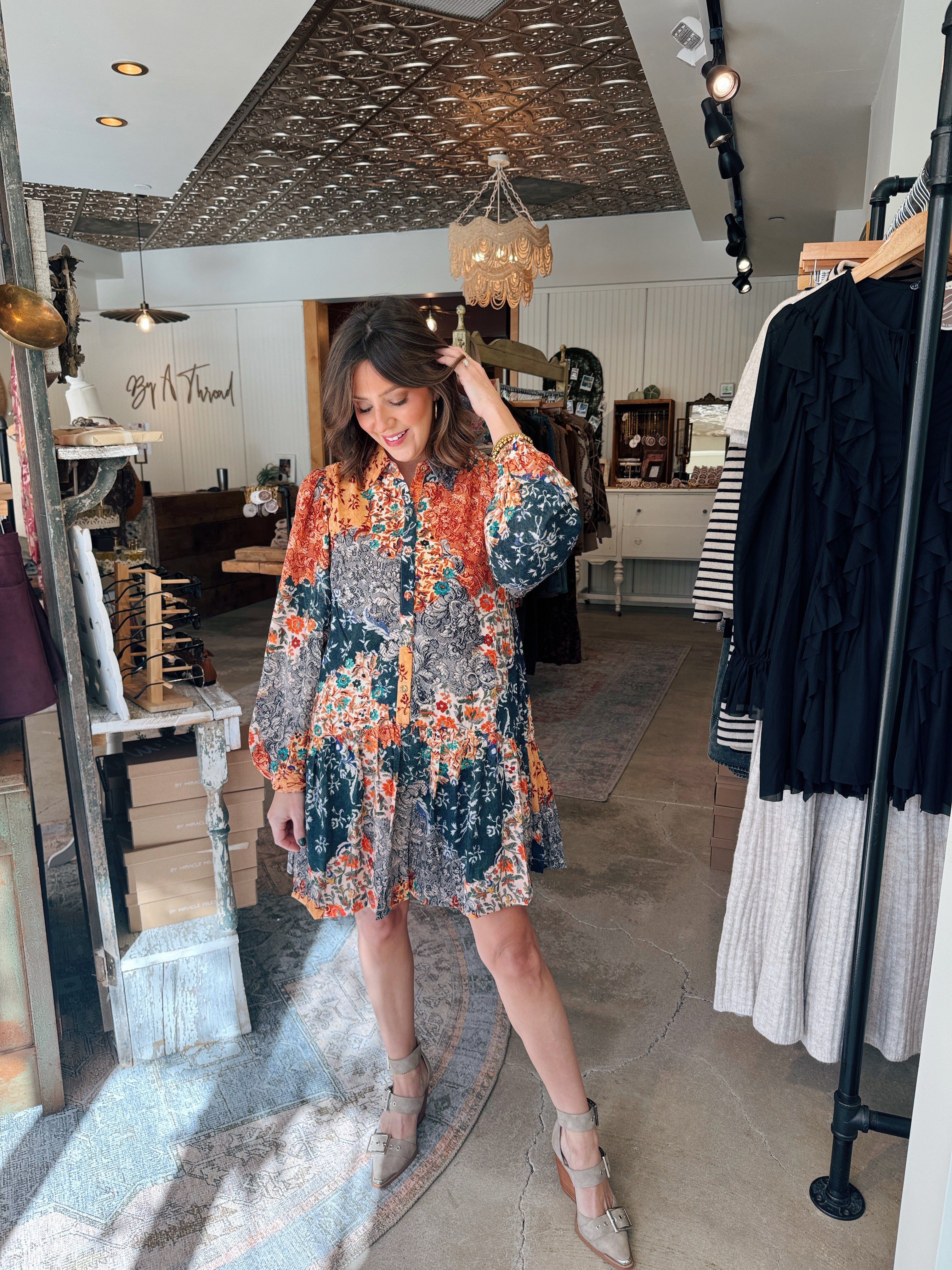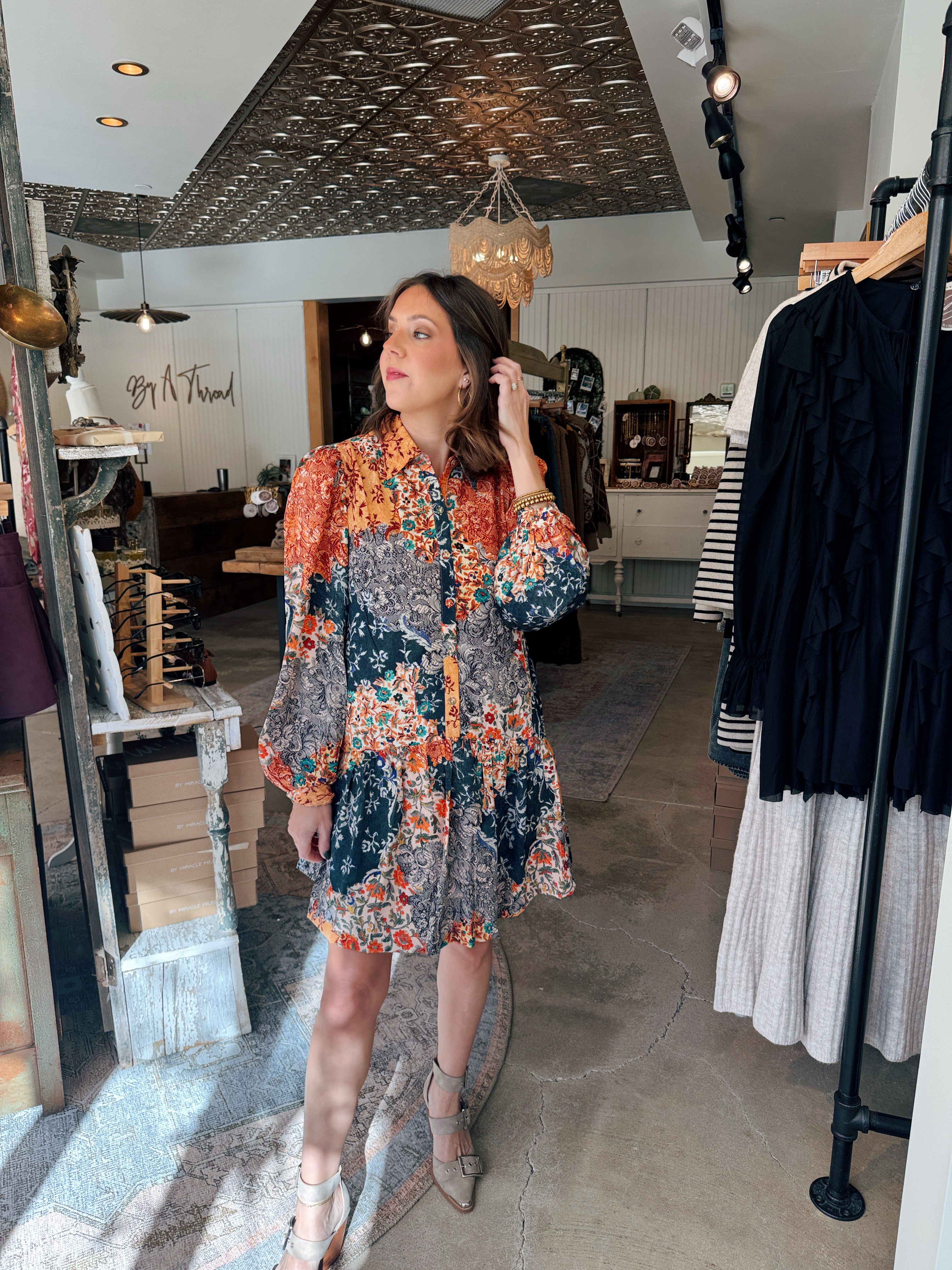 This unique patchwork print mini dress features a unique print, setting it apart with a vibrant, one-of-a-kind design. It is styled with a classic collared neckline and a full button-down placket. The silhouette is defined by dramatic long balloon sleeves with elegant buttoned cuffs and a flattering drop waist. For added functionality, the dress is equipped with pockets and is fully lined for a comfortable and quality fit.