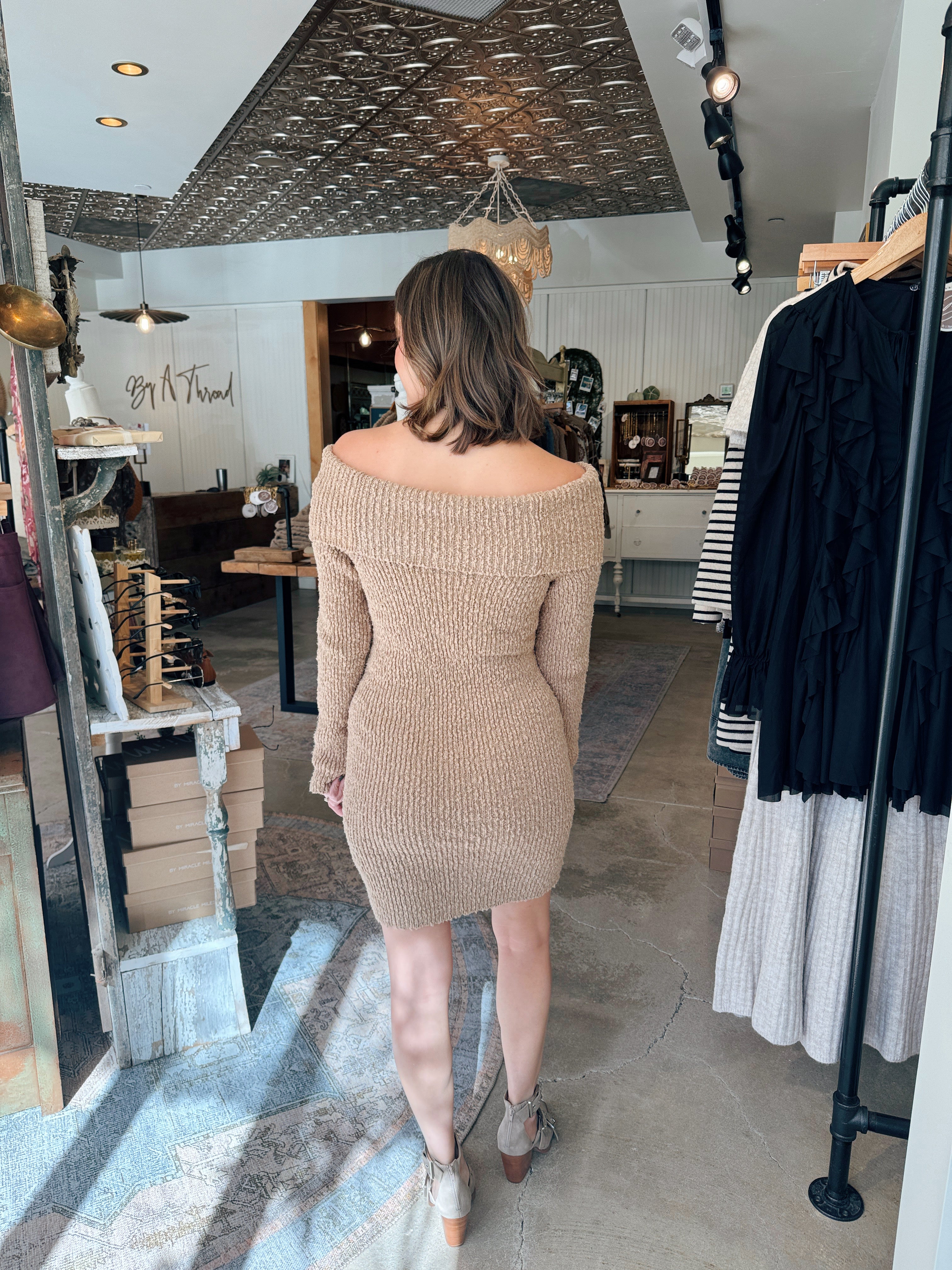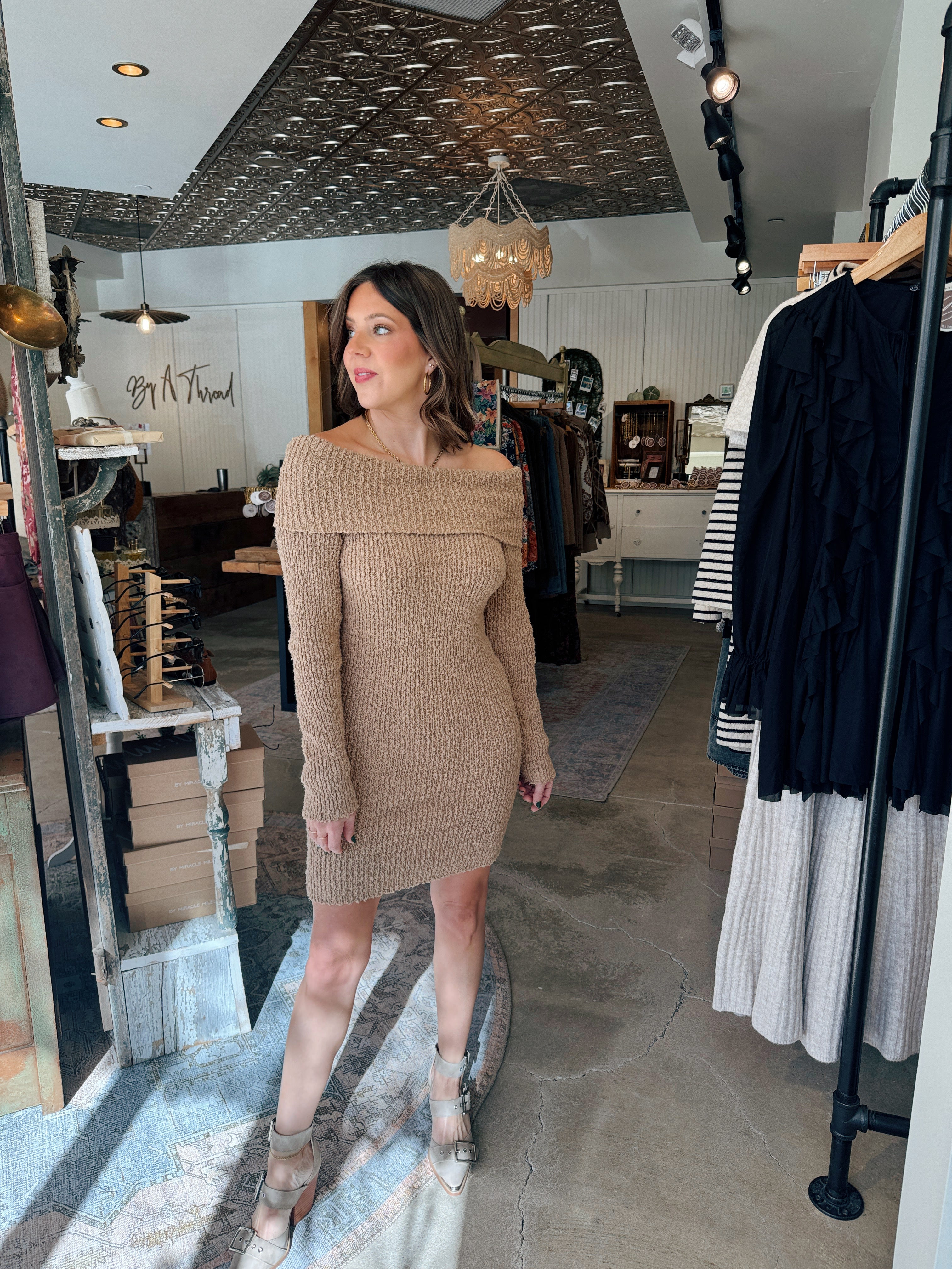 Perfect for a chic, cozy look, this off-the-shoulder knit sweater mini dress is a cold-weather essential. The design features a flattering mini length and a stylish off-the-shoulder neckline, complemented by comfortable long sleeves. This fitted sweater dress is available in two rich, warm neutral shades: Chocolate Brown or Mocha.
