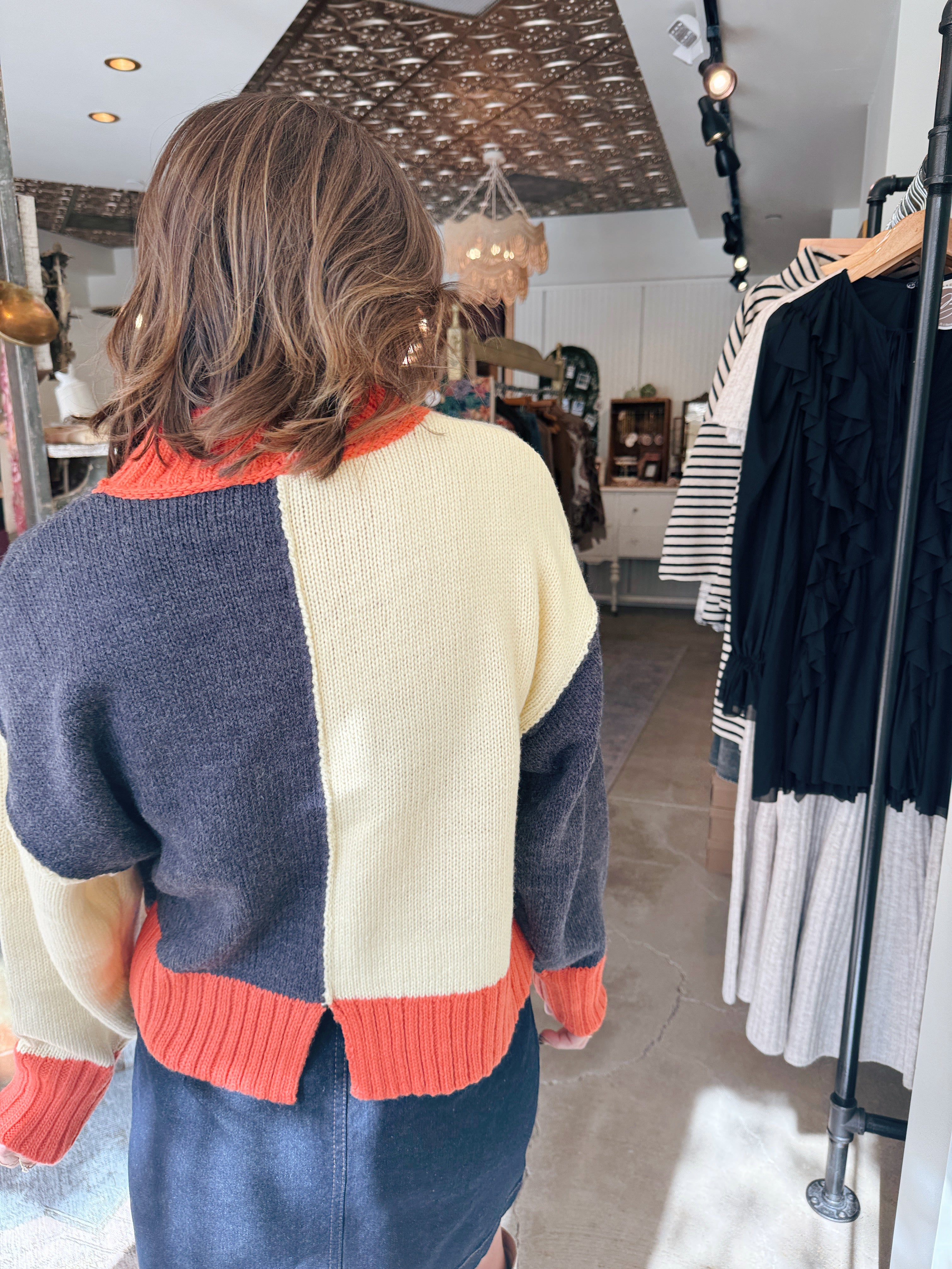 Brighten your wardrobe with this cozy and chic color block sweater top. Featuring a sophisticated palette of soft butter yellow, classic denim blue, and warm rust orange, this piece is designed to make a statement. The comfortable crew neckline and ribbed detail throughout the knit add a pleasing texture and structure. Crafted for a super soft feel, this sweater offers both warmth and style. It pairs effortlessly with jeans for a casual look or can be dressed up with trousers for a polished, modern ensemble.