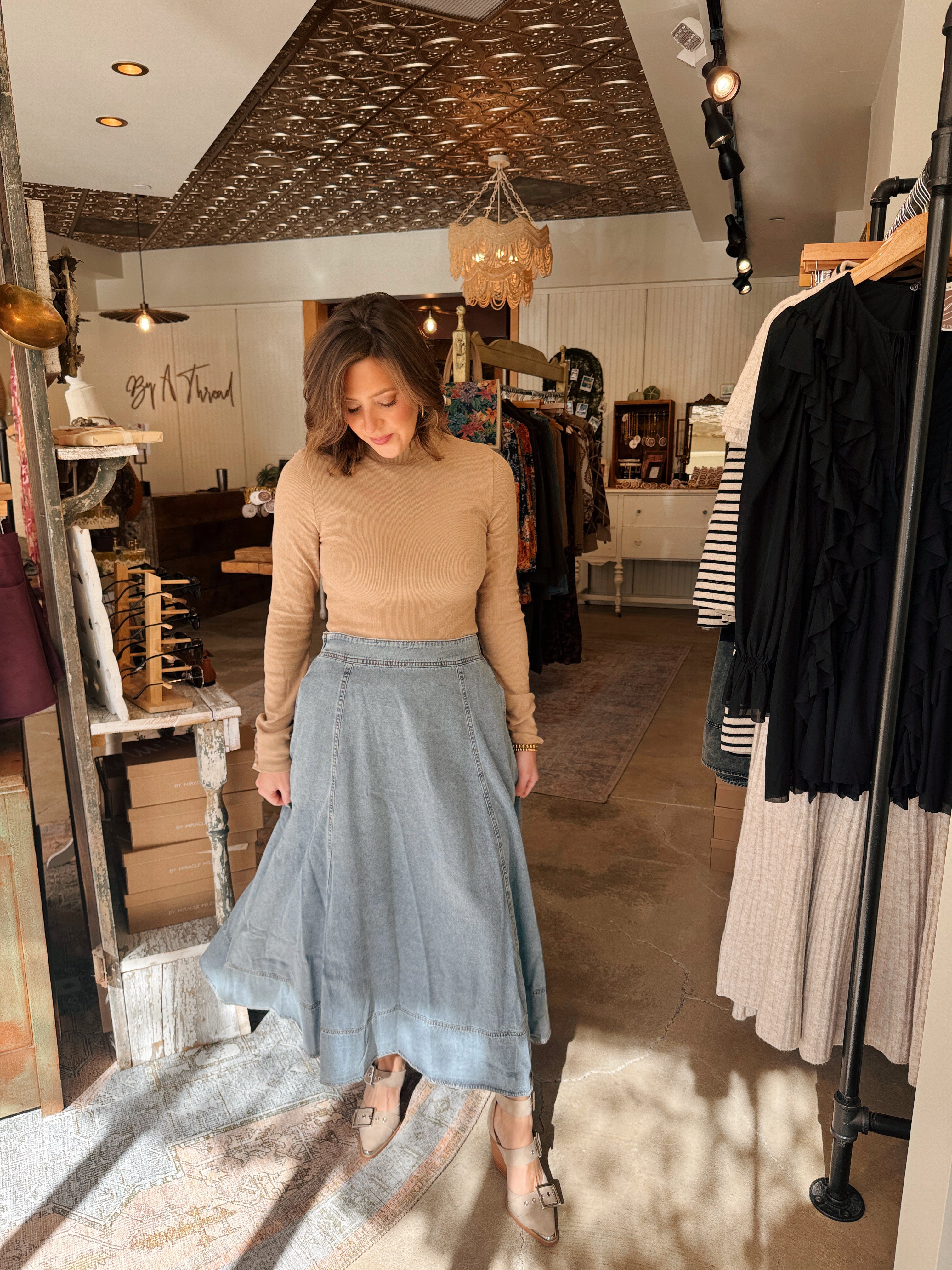 This stylish denim midi skirt is a versatile piece perfect for transitional weather, easily pairing with both tees and knits. It features a flattering flare silhouette and is enhanced with paneled detail and distinctive top-stitching. Designed for all-day comfort, the skirt includes functional side pockets and a back elastic waistband that ensures an easy, comfortable fit.