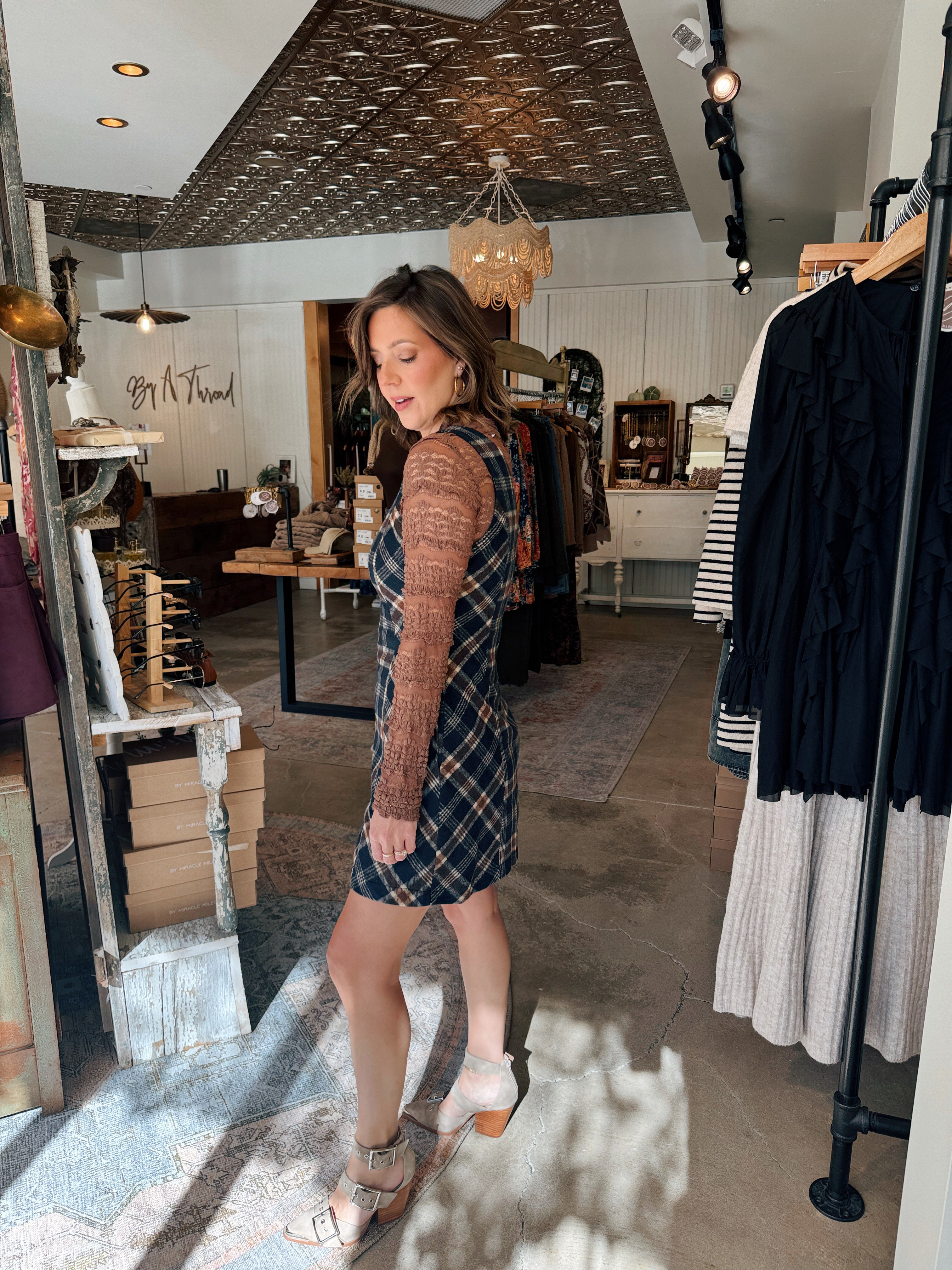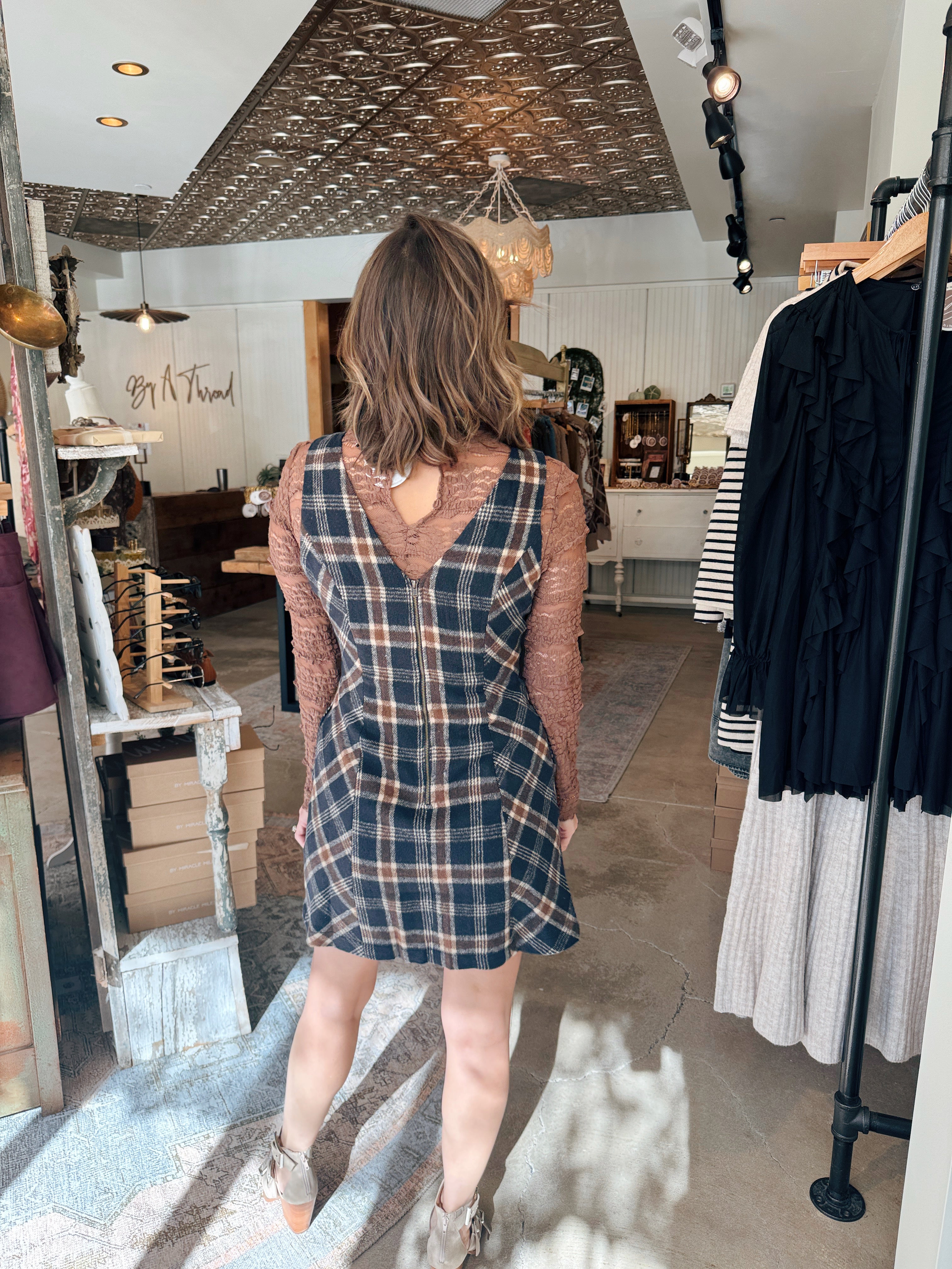 Elevate your cool-weather wardrobe with this chic plaid mini dress. A sophisticated blend of navy blue, cream, and camel creates a timeless plaid pattern that’s perfect for the office, a weekend brunch, or a casual night out. The flattering silhouette is complemented by a unique V-neck detail on the back, adding an unexpected touch of contemporary style. Designed to be sleeveless and featuring a secure zip-back closure, this dress offers easy wear and a polished fit. Pair it with ankle boots, knee high boots, fleece lined tights, turtlenecks and bodysuits, or layer over with a blazer for a complete, stylish look.
