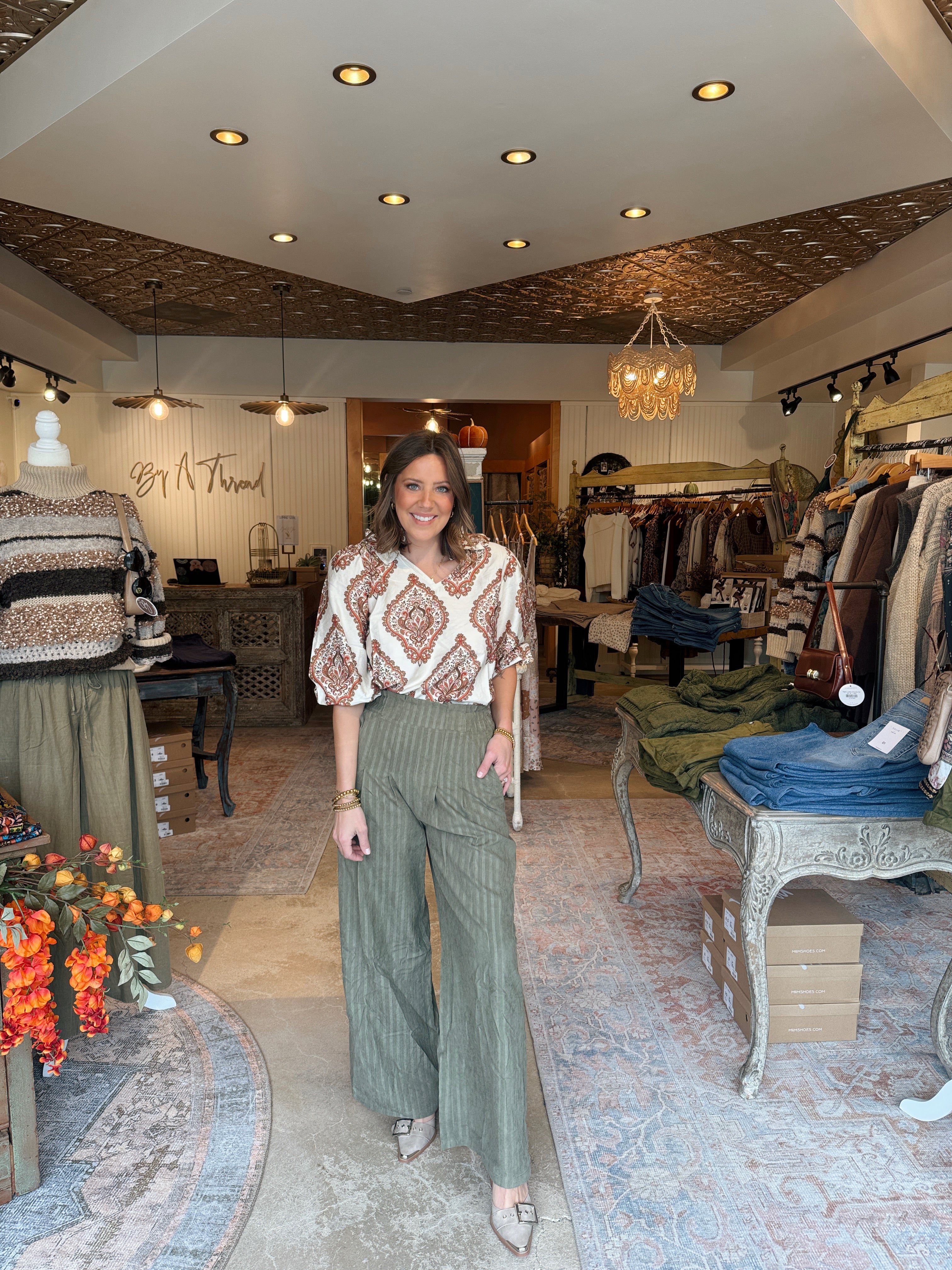 Tuck this blouse into high-waisted dark denim or black trousers for an elevated office look. For a chic weekend outfit, pair it with white or cream linen shorts or a pencil skirt and layered gold jewelry. The rust color looks fantastic with olive green, tan, or classic black.