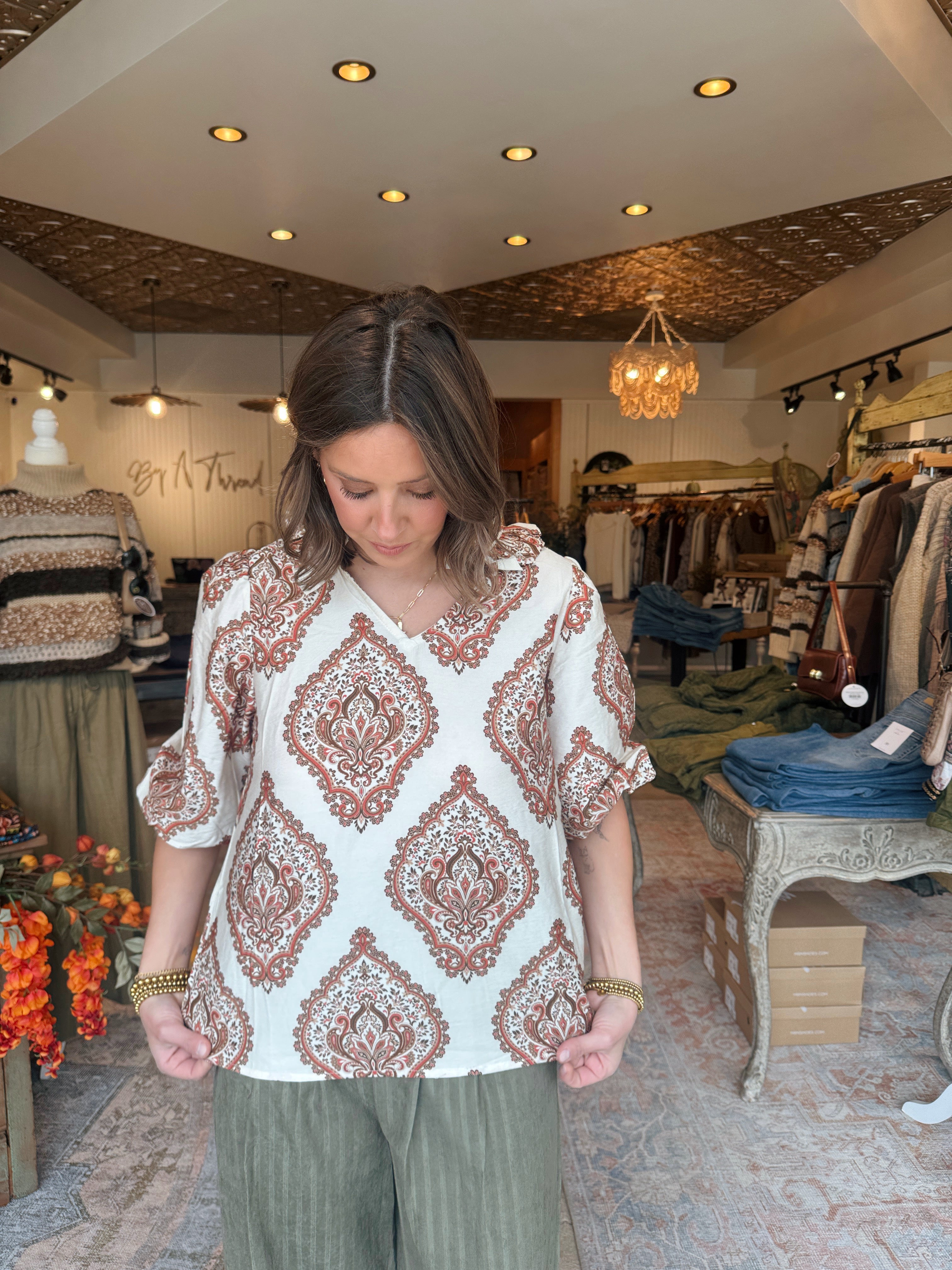 Embrace rich color and romantic detail with this gorgeous cream blouse, featuring a striking rust floral paisley design. This piece beautifully balances bohemian flair with tailored polish, making it a versatile hero for your wardrobe.