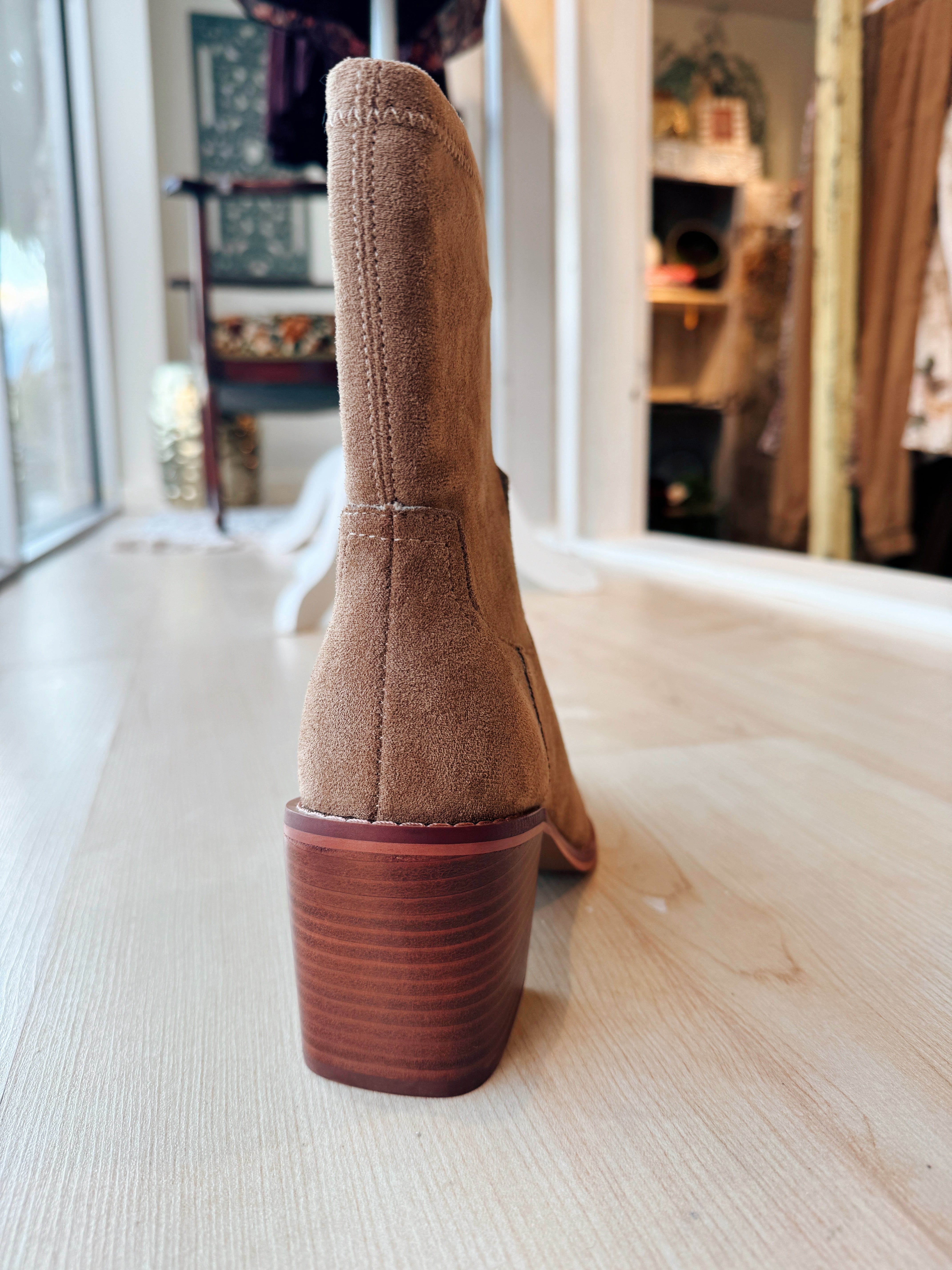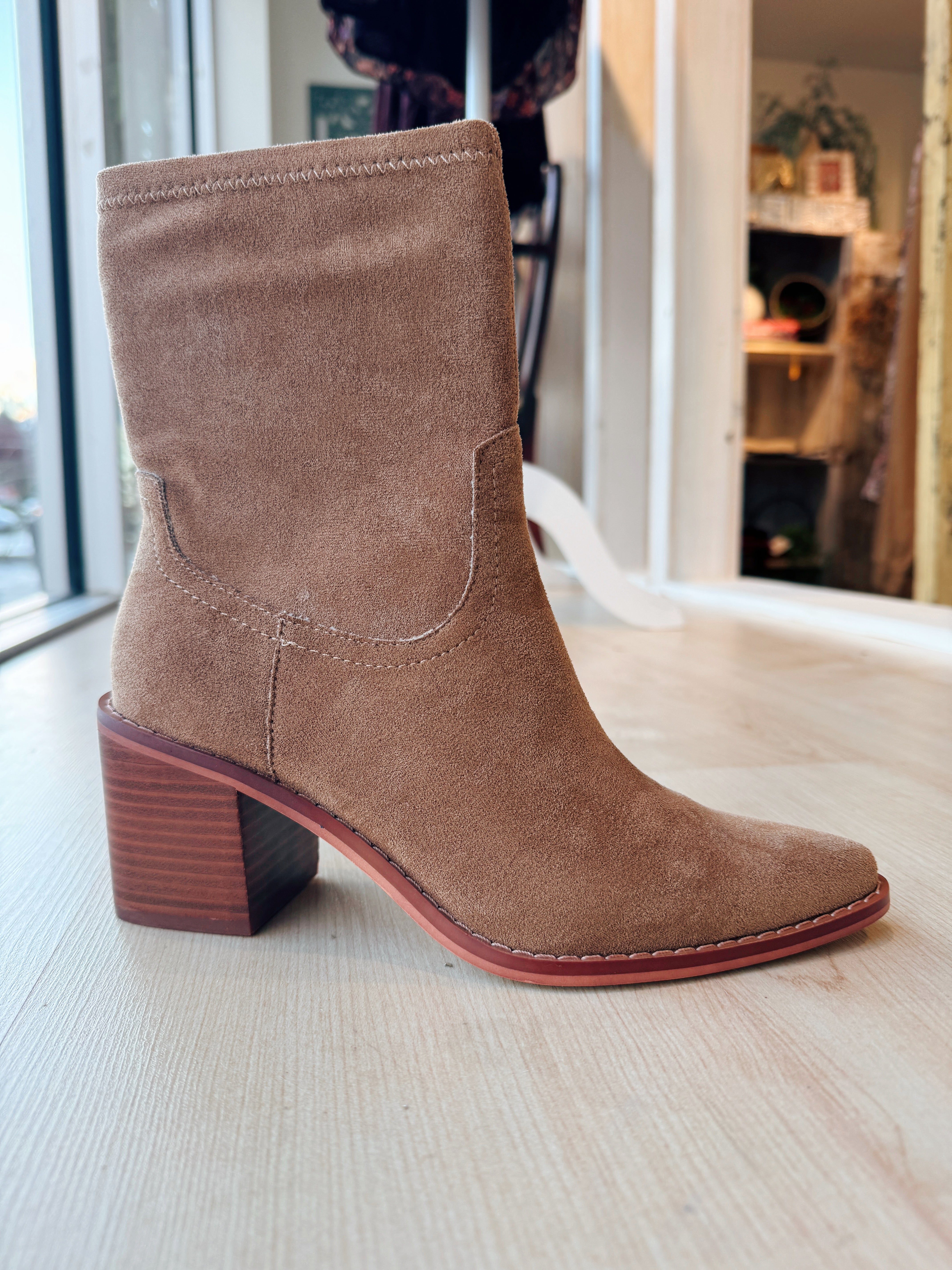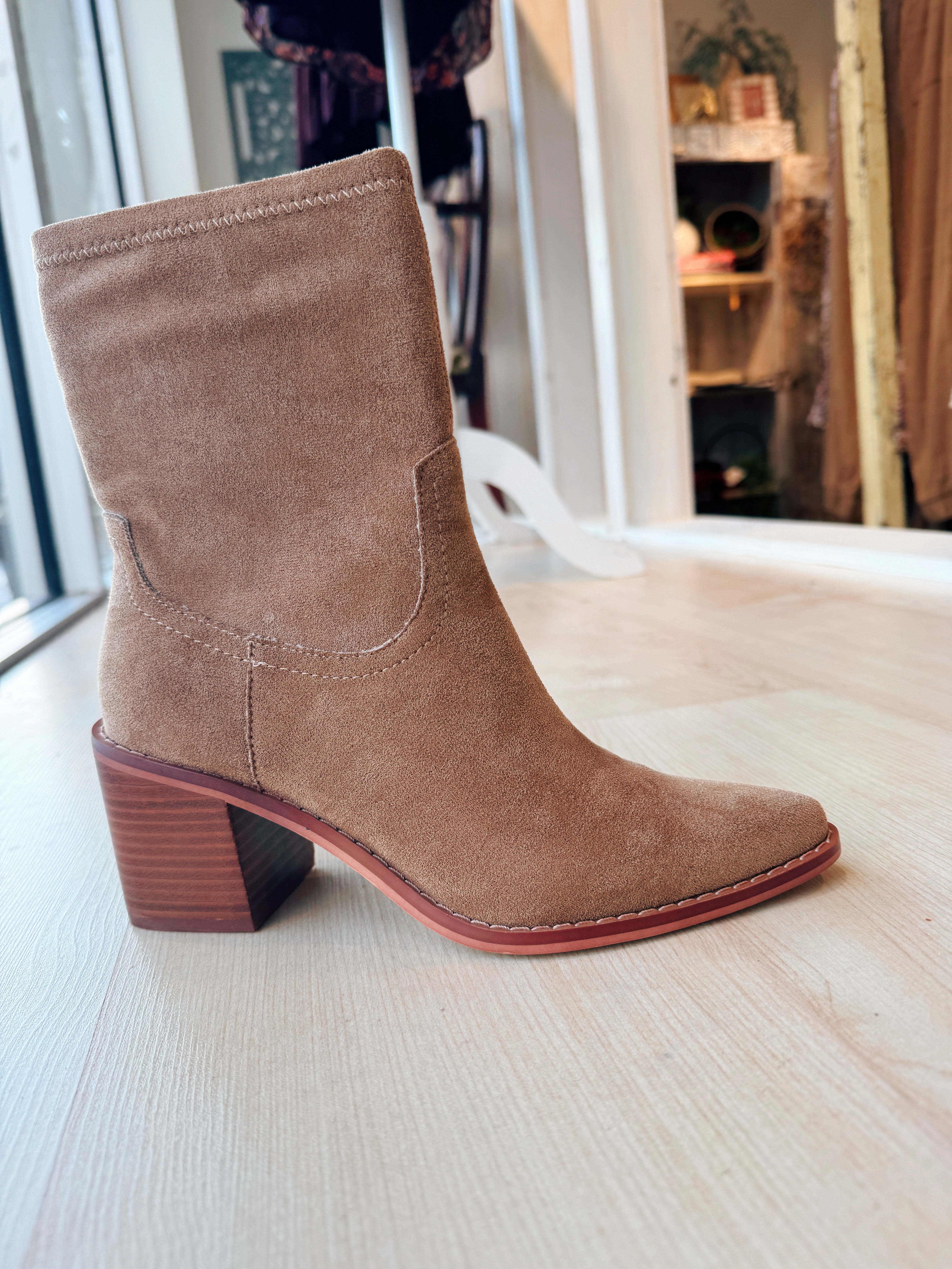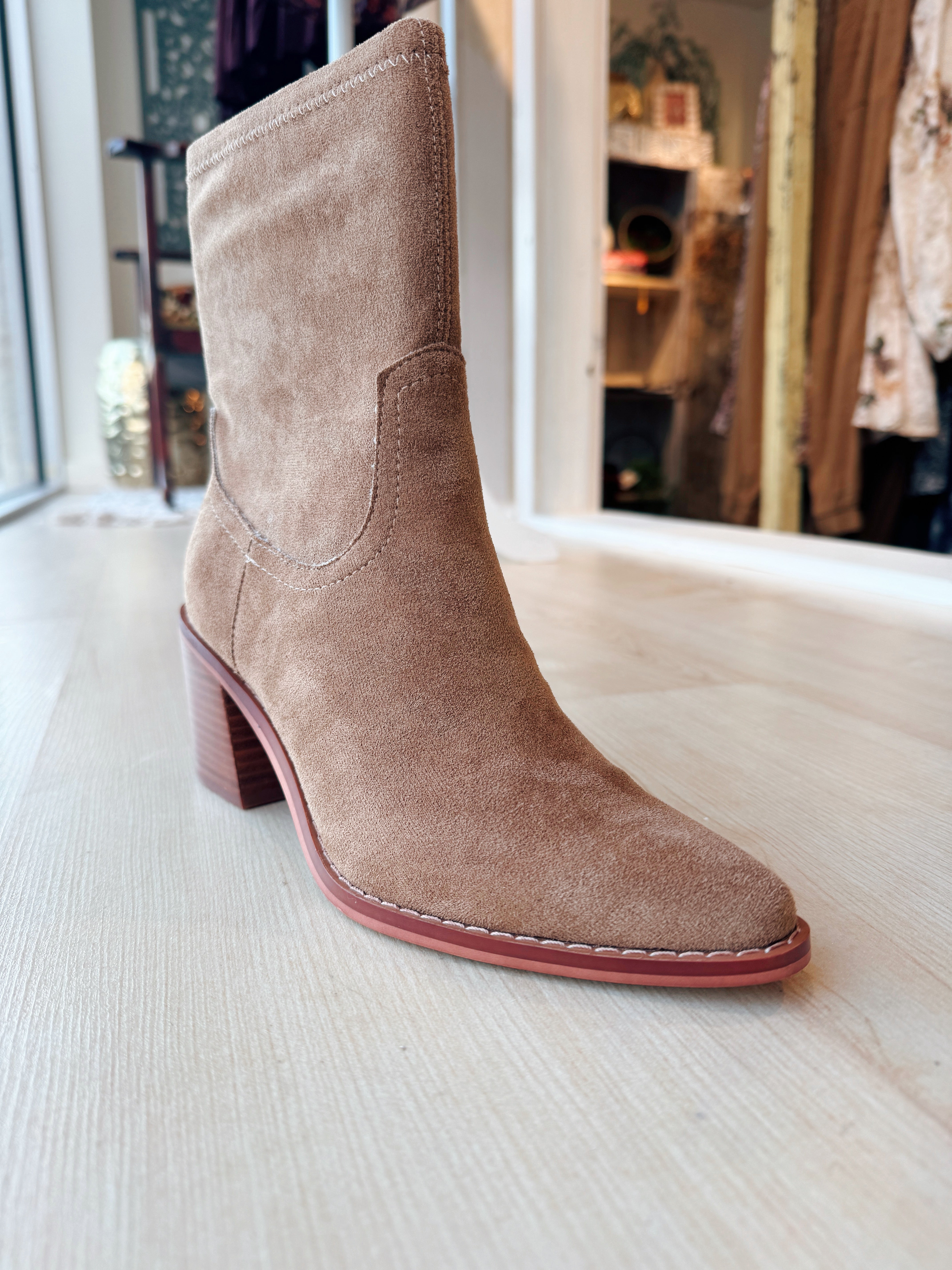 Step out in confidence with this sleek, pointed latte toe bootie, masterfully crafted with all the fine details sewn in for a polished look. This ankle boot features a comfortable 3-inch stacked heel beautifully finished with a leather wrap heel material, offering the perfect lift without sacrificing stability. The bootie's structure is defined by its soft vegan suede upper and a manageable 6.75-inch shaft height, complemented by a zipper closure for easy on and off. Inside, you'll experience exceptional comfort thanks to the premium DreamCloud Cushion insole material, designed for all-day wear. The design is perfected with an approximate 10.5-inch circumference of the shoe opening and a 10.75-inch shaft circumference, making it a versatile and stylish addition to any wardrobe.