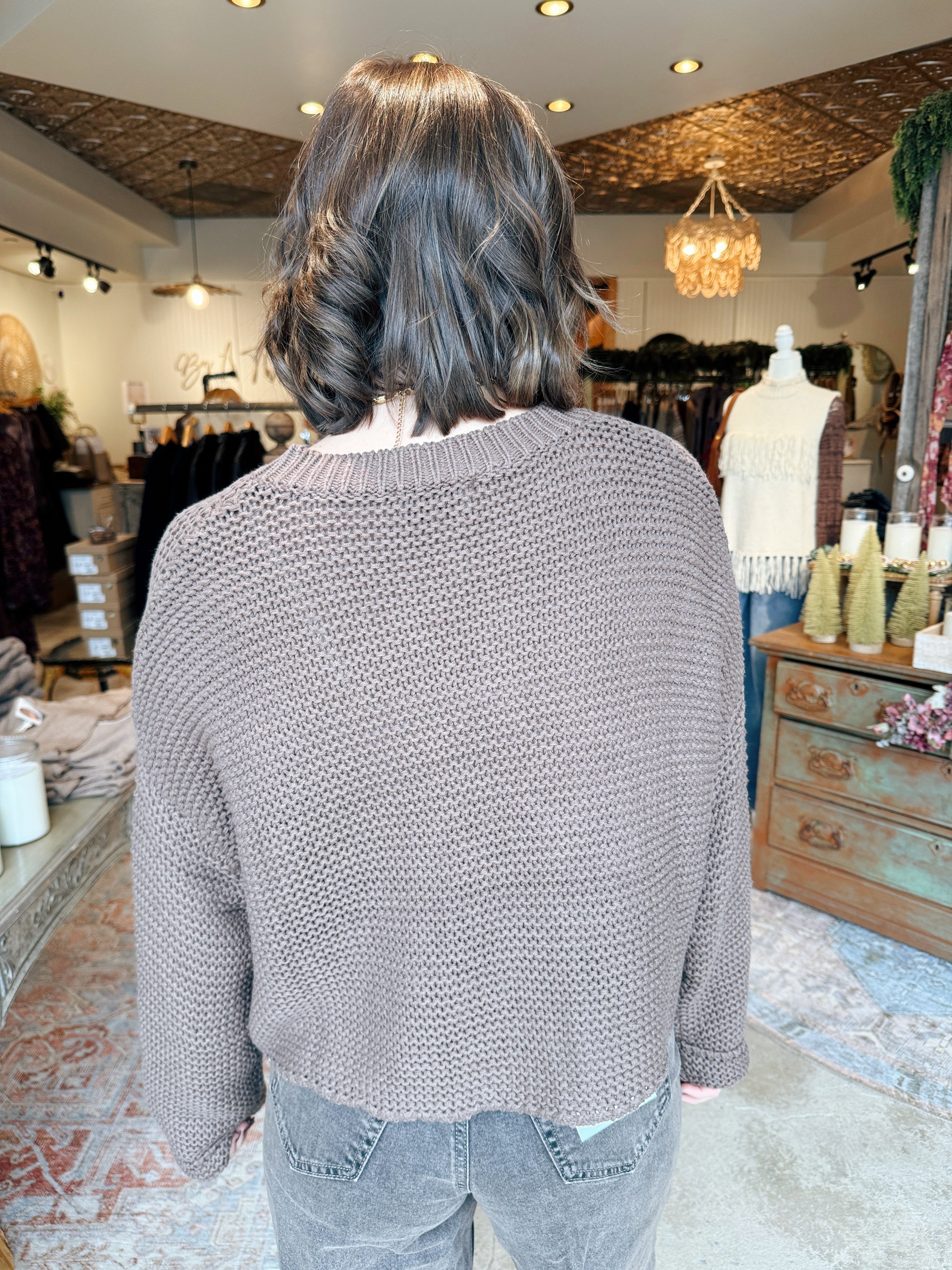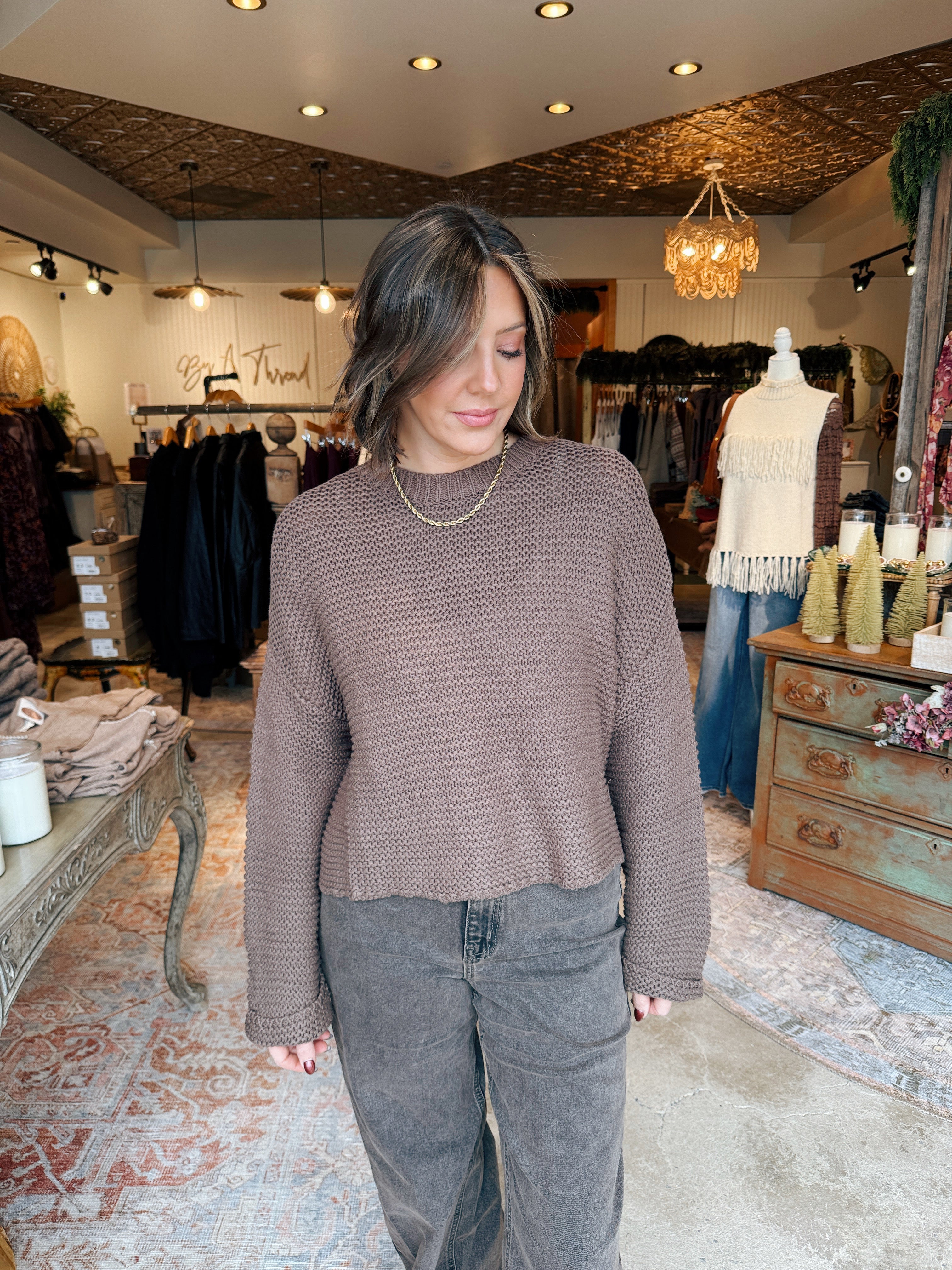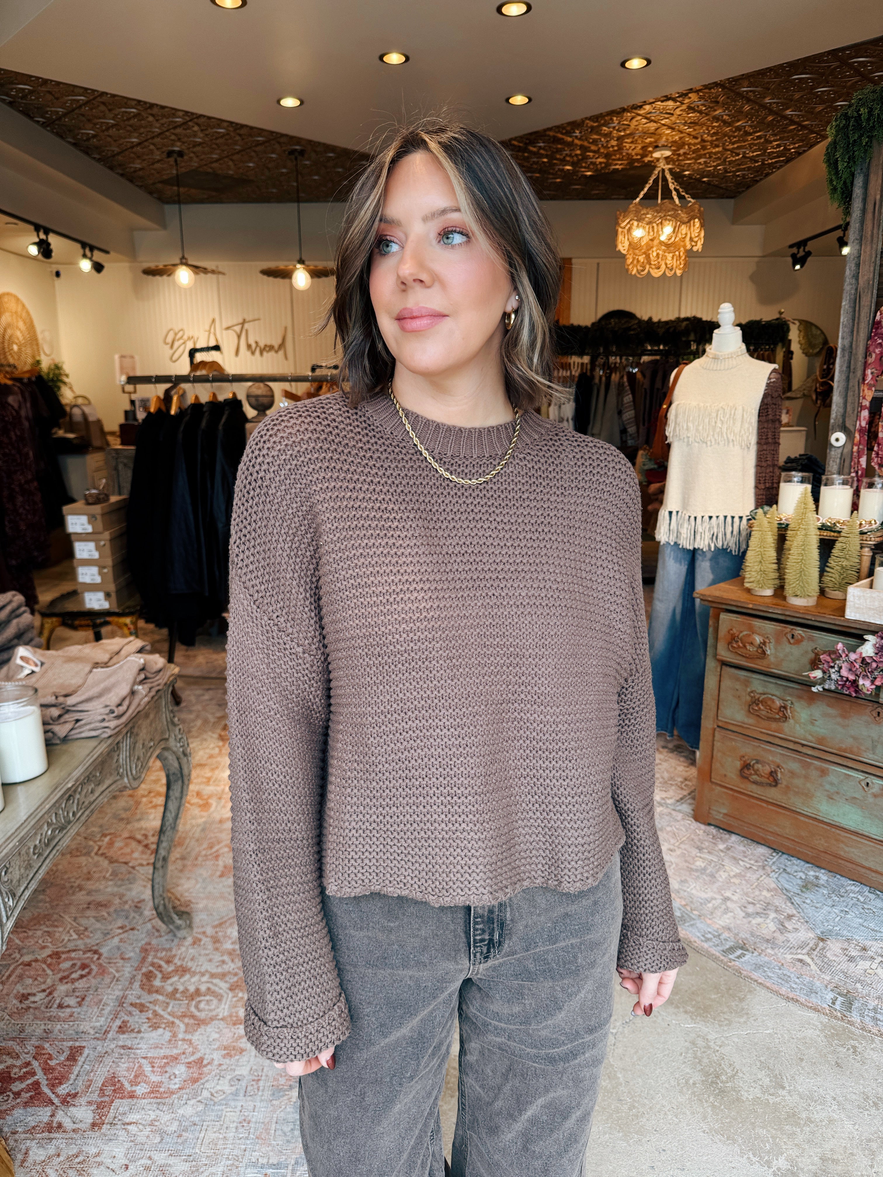 This versatile sweater top, presented in a rich chocolate brown, is an essential wardrobe piece designed for comfort and ease. It features a classic round neck silhouette and is crafted from a light to medium weight, incredibly soft sweater knit material. This top is perfect for effortless layering and provides warmth without bulk, making it a comfortable and stylish option for everyday wear.