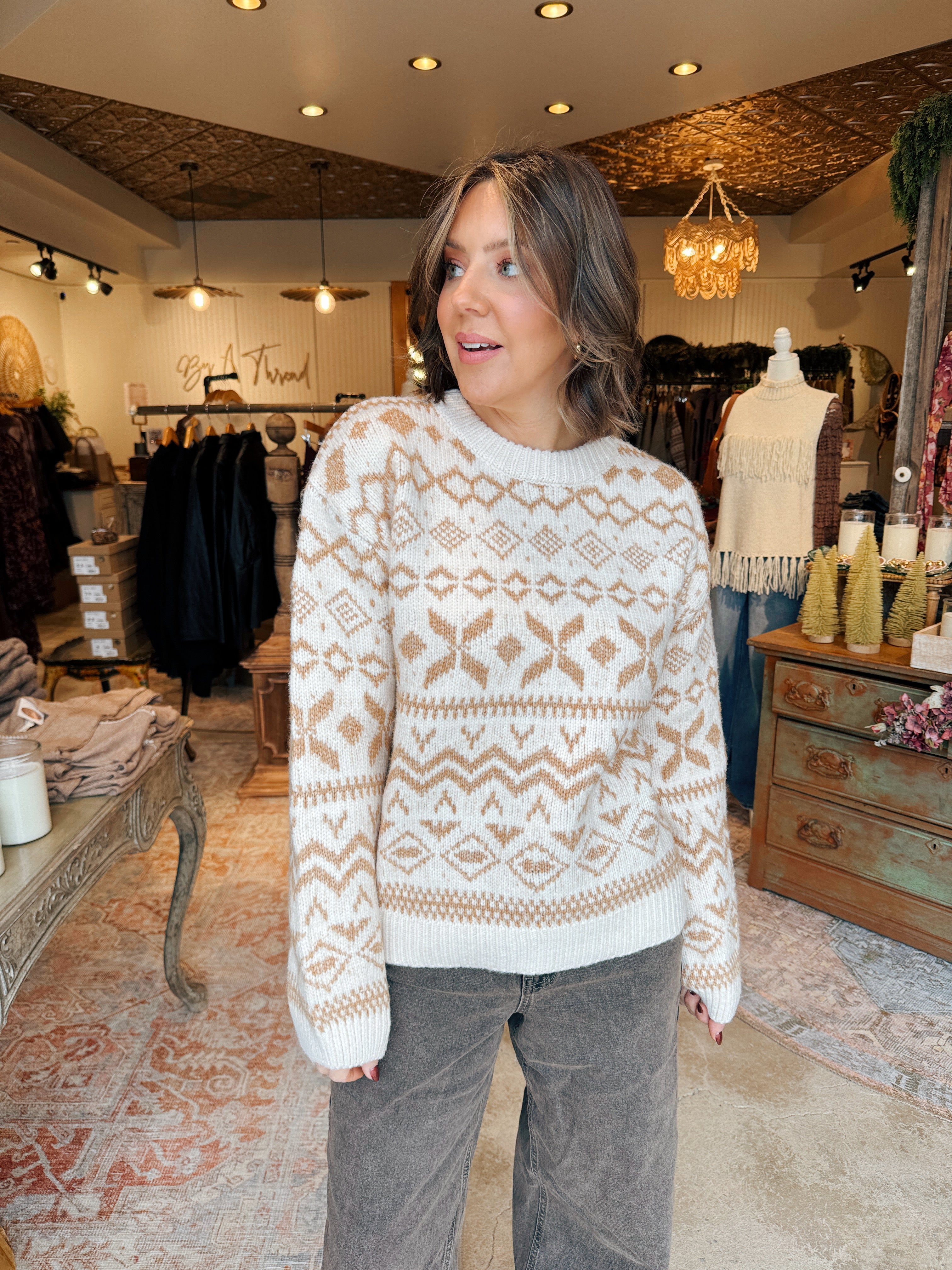 Add texture and warmth to your wardrobe with this stylish cream brown jacquard knit sweater. This piece features a rich, complex jacquard knit pattern, which provides unique visual depth and insulation. The blend of soft cream and earthy brown tones ensures versatility, making this sweater an effortlessly chic choice for cooler days.