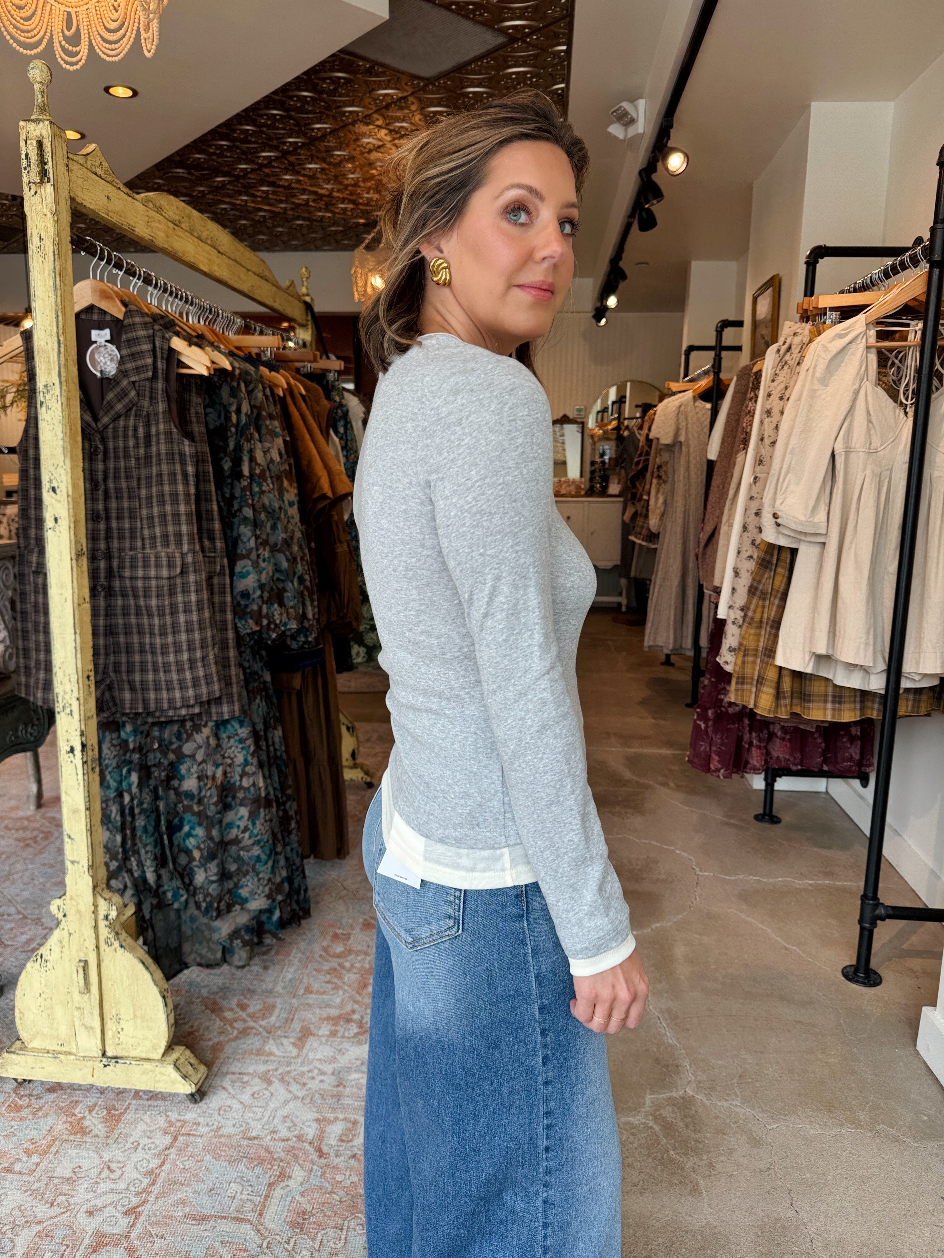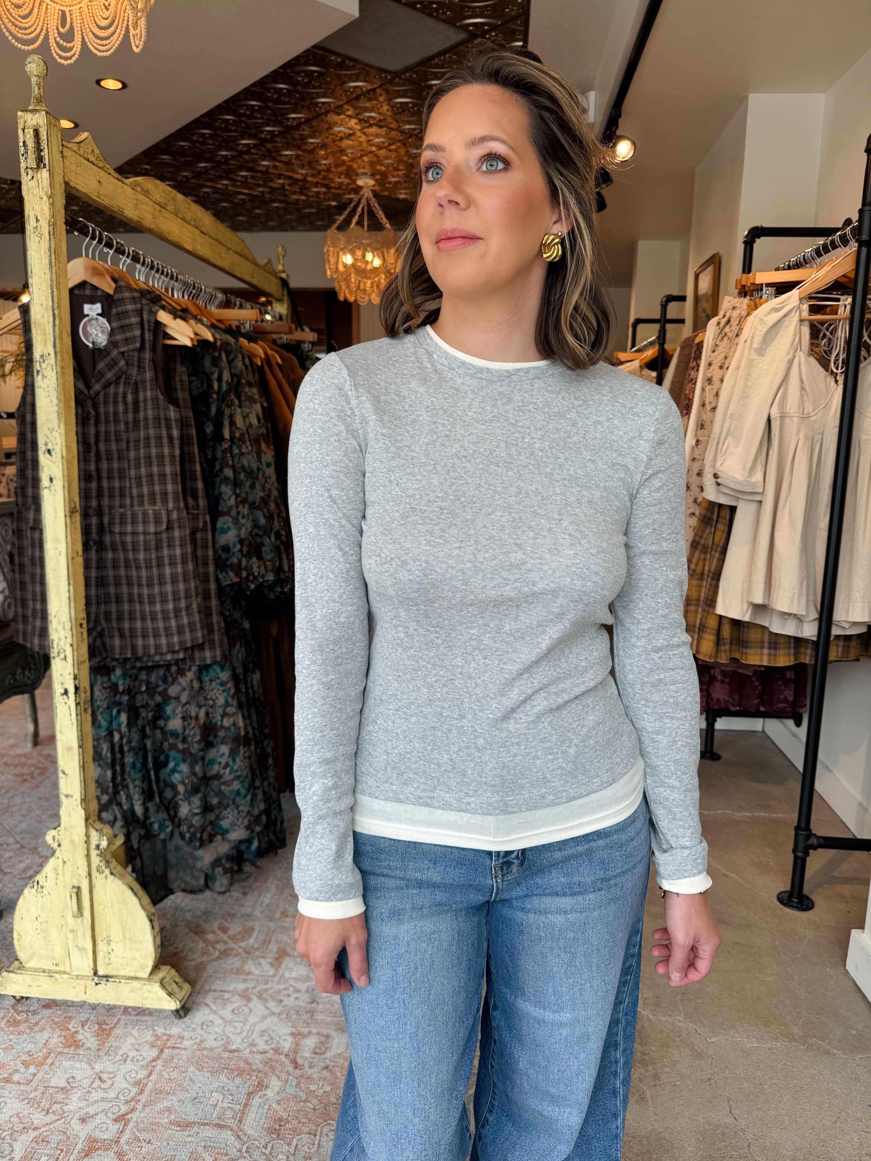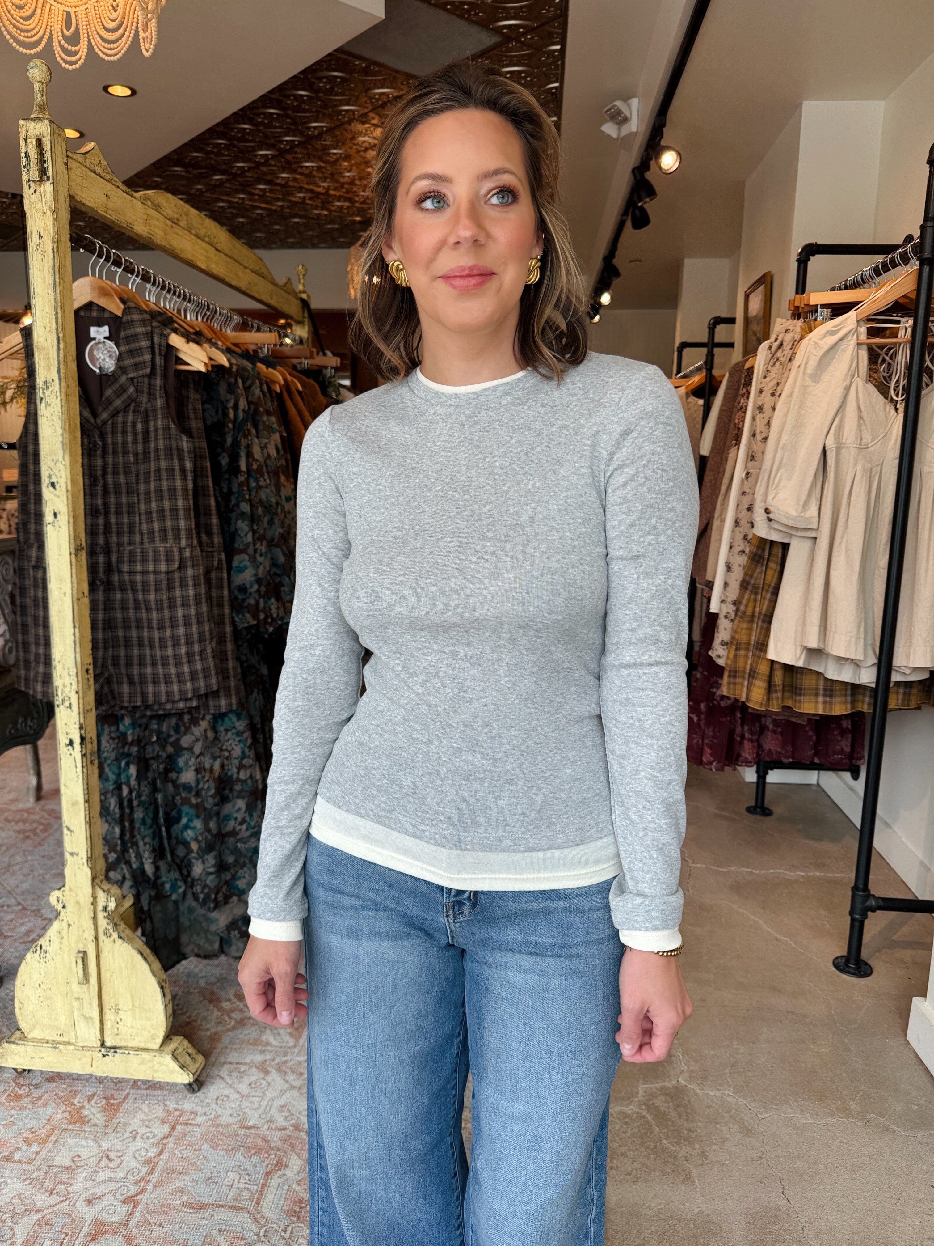 This top features a beautiful heathered gray knit, created by blending multiple fibers to give the fabric a unique, textured depth. The lightweight material ensures a soft and breathable feel, making it an ideal layer for year-round wear. A touch of sophistication is added by the cream-colored contrast, which highlights the neckline, cuffs, and hem, creating a clean and polished finish.