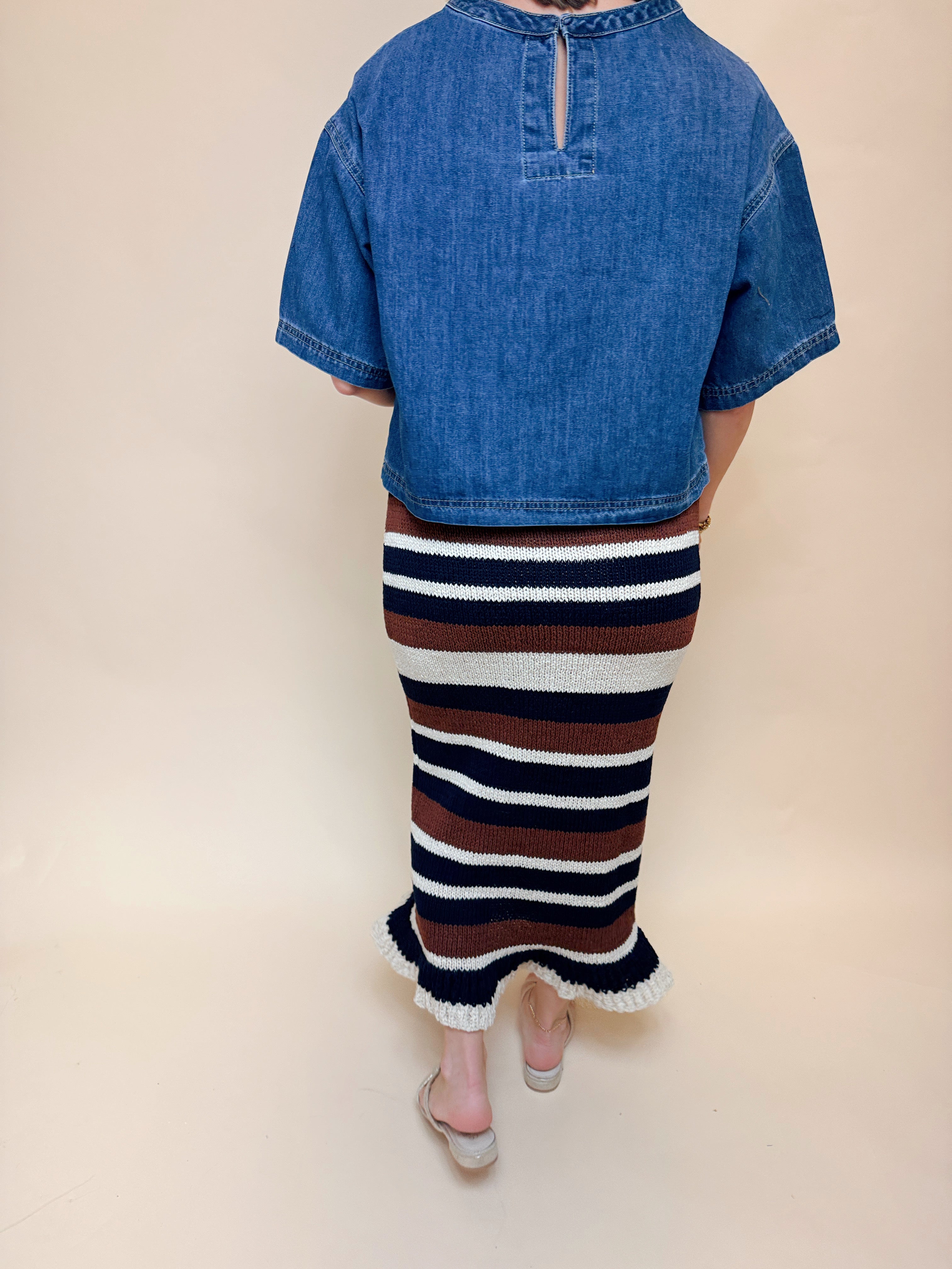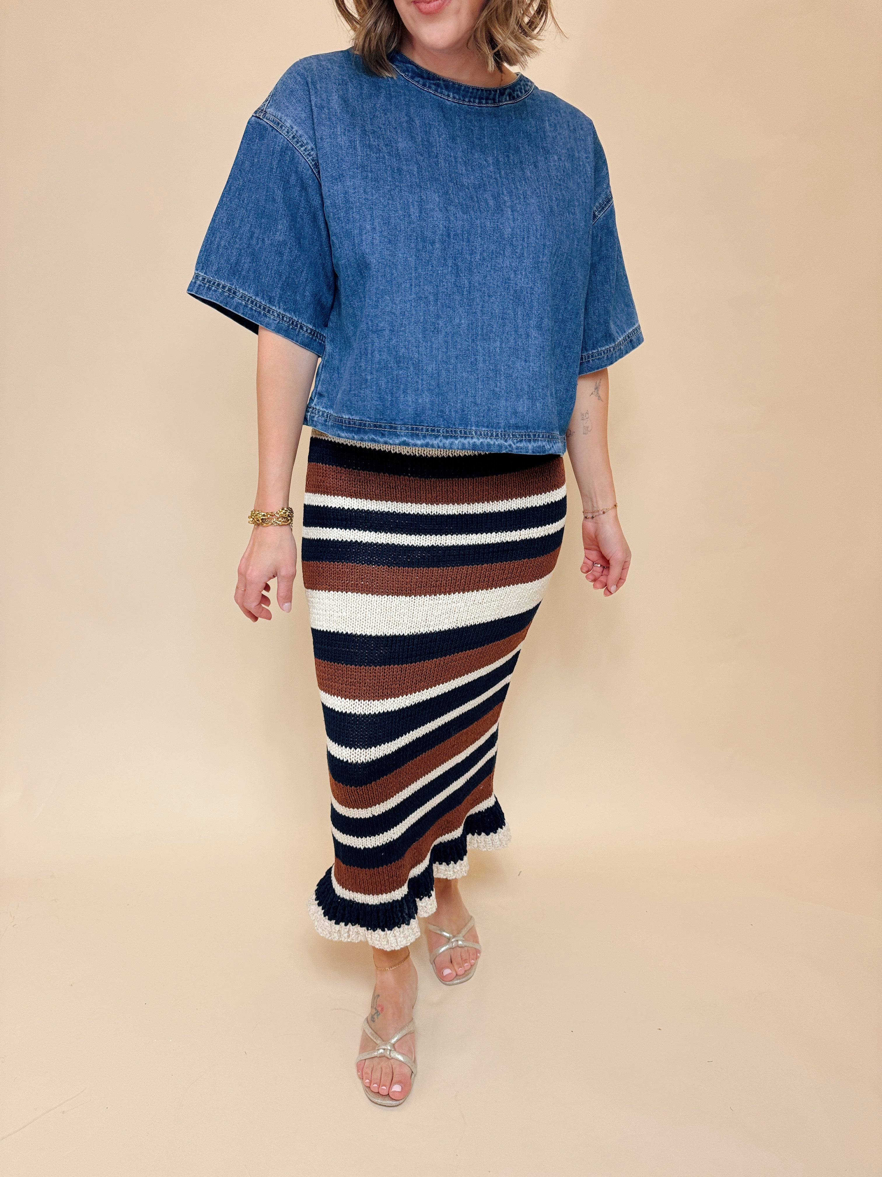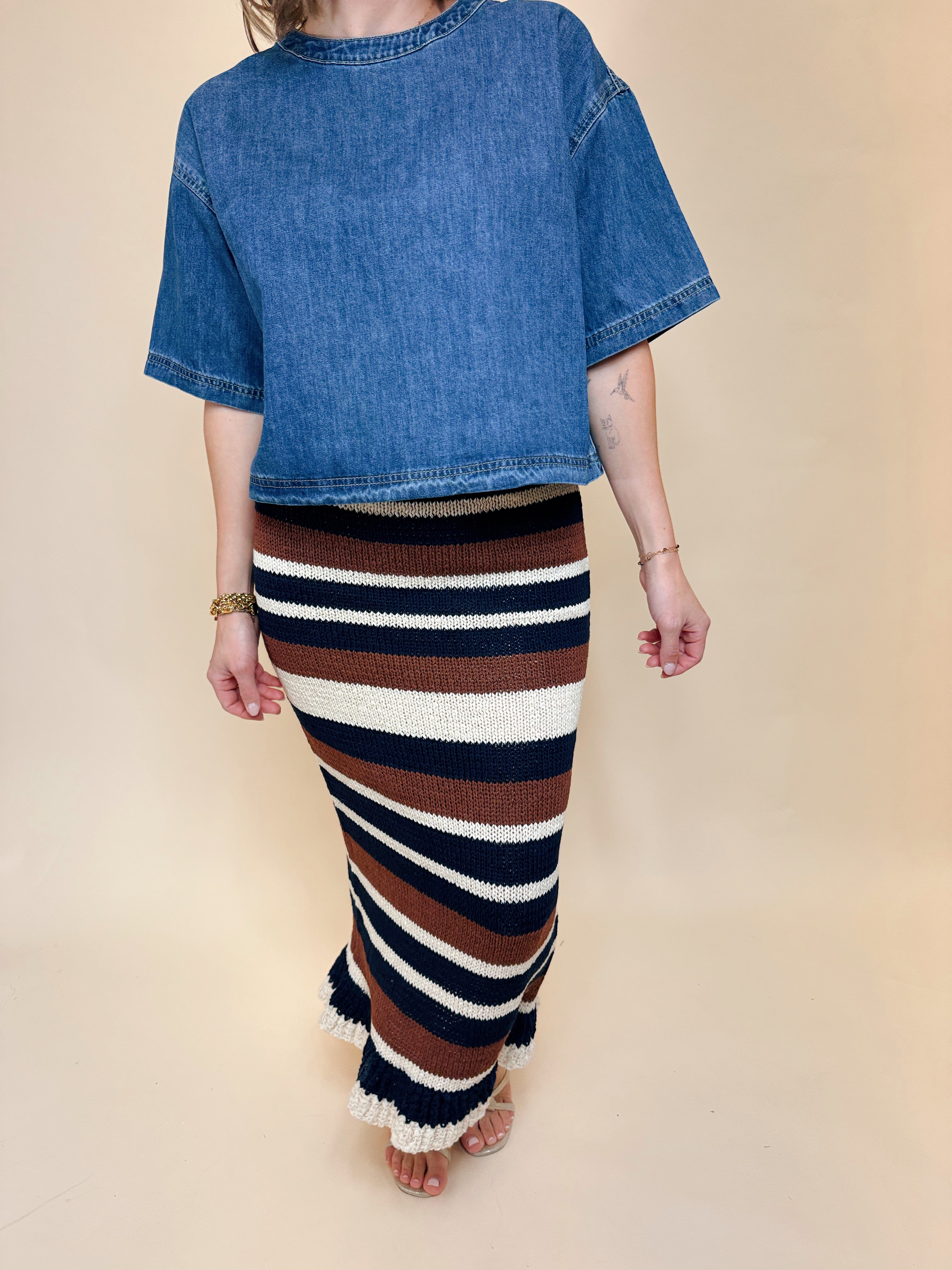 Make a statement in this beautifully crafted color blocked maxi skirt. Rich navy blue, warm camel, and soft cream come together in a sophisticated palette that feels both modern and timeless, while the soft knit fabrication ensures all-day comfort.